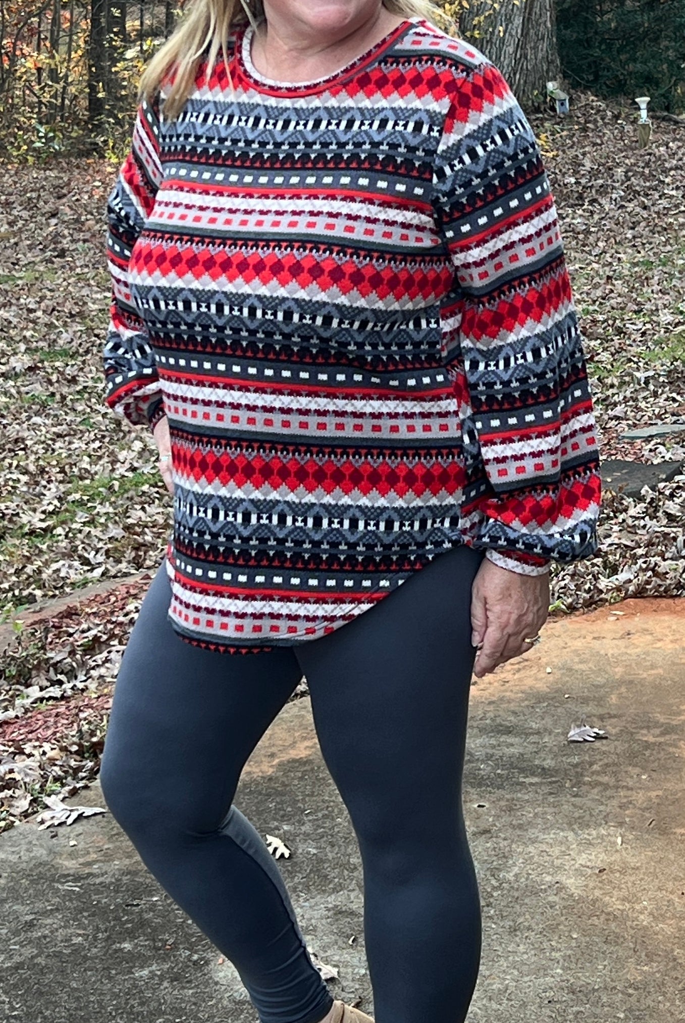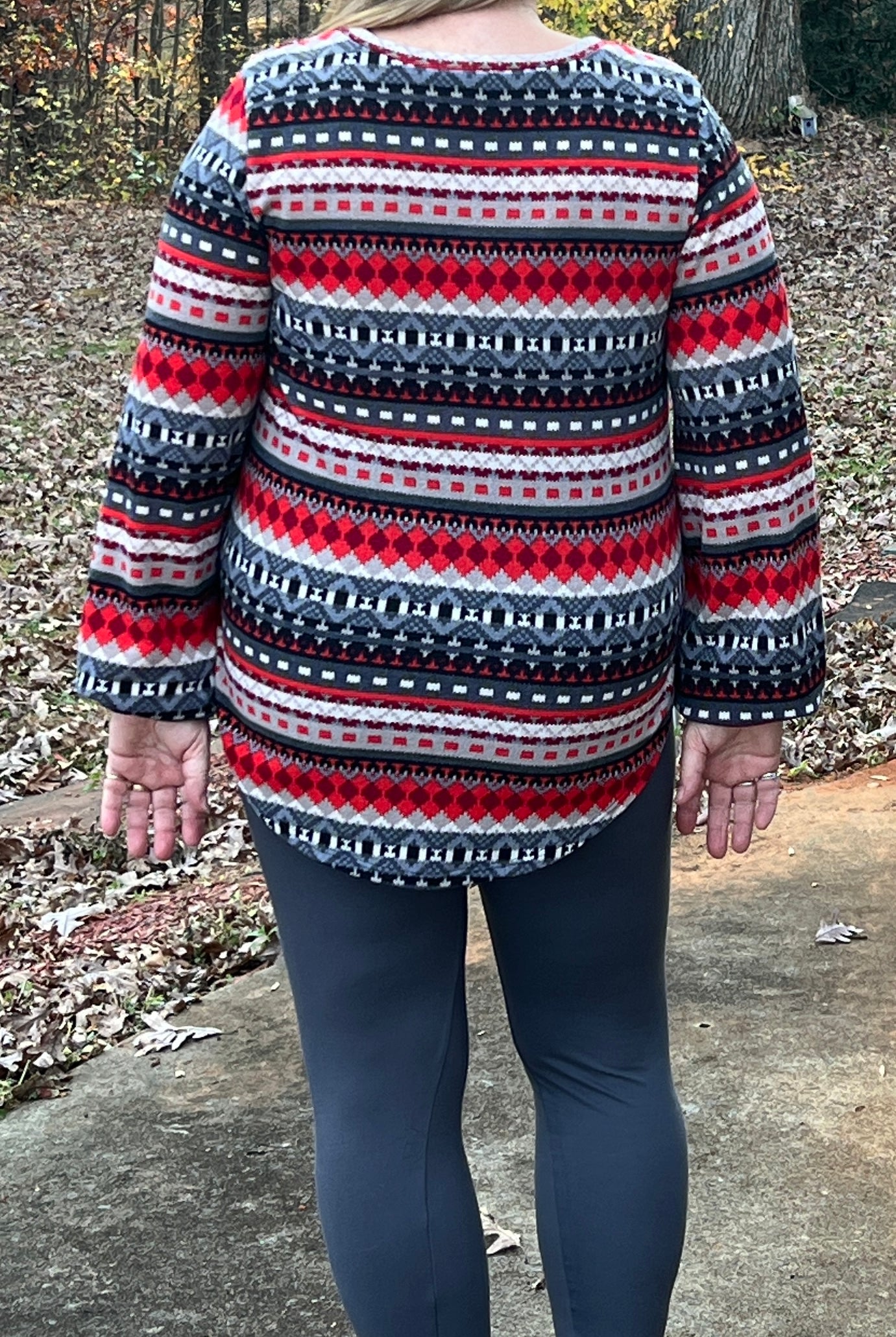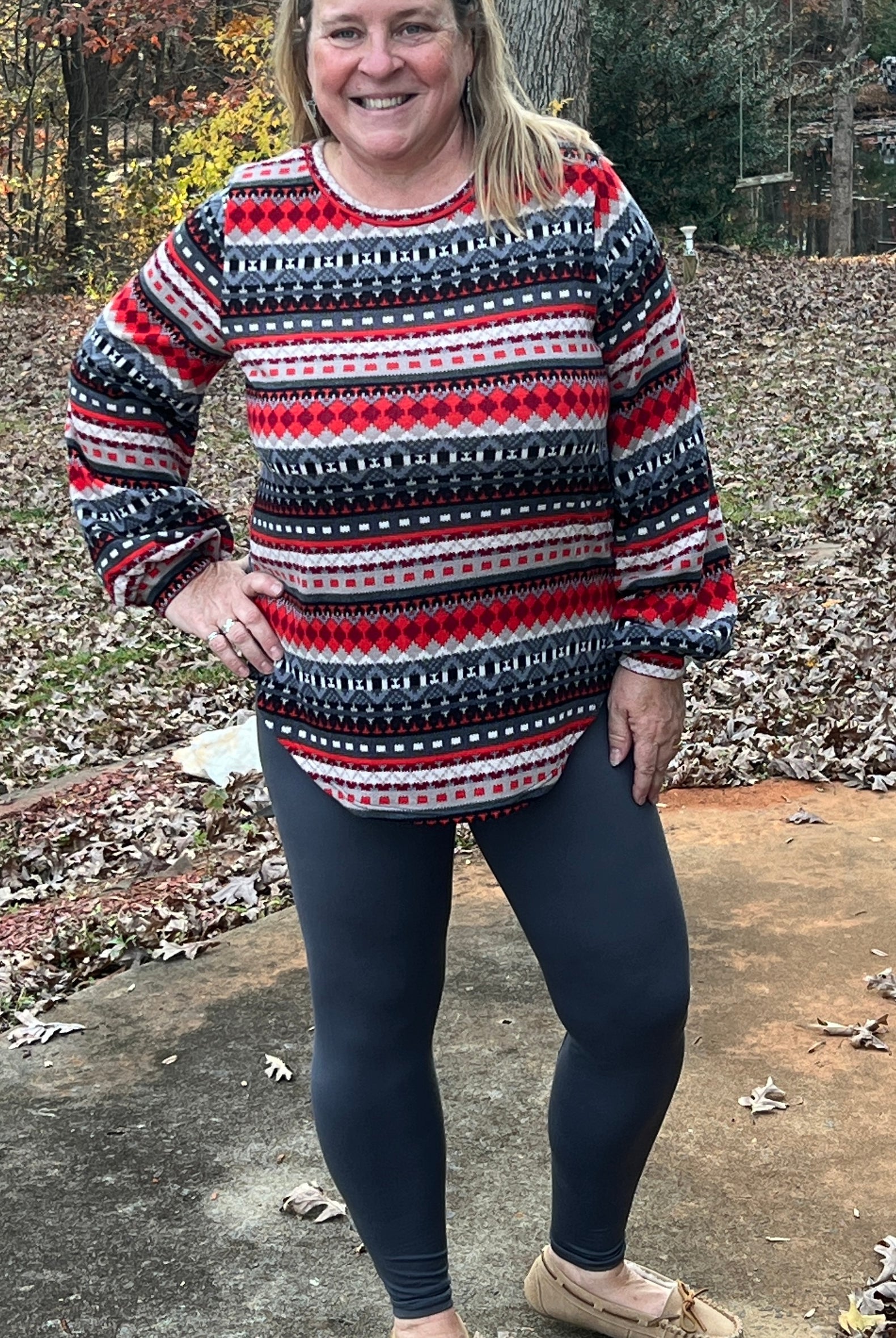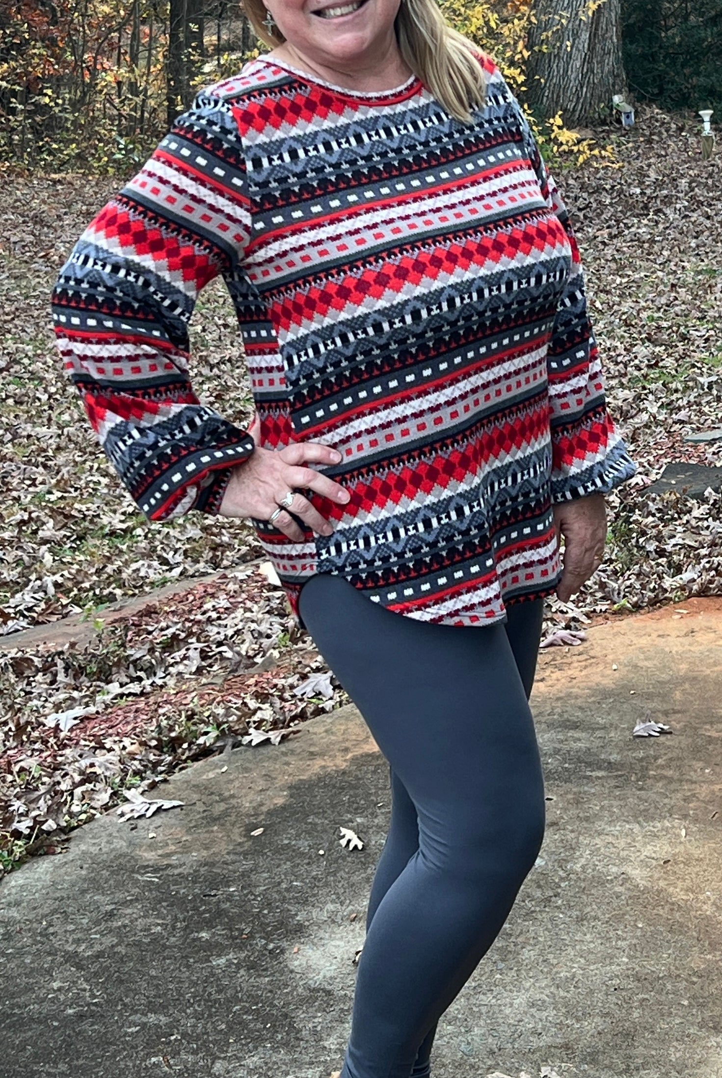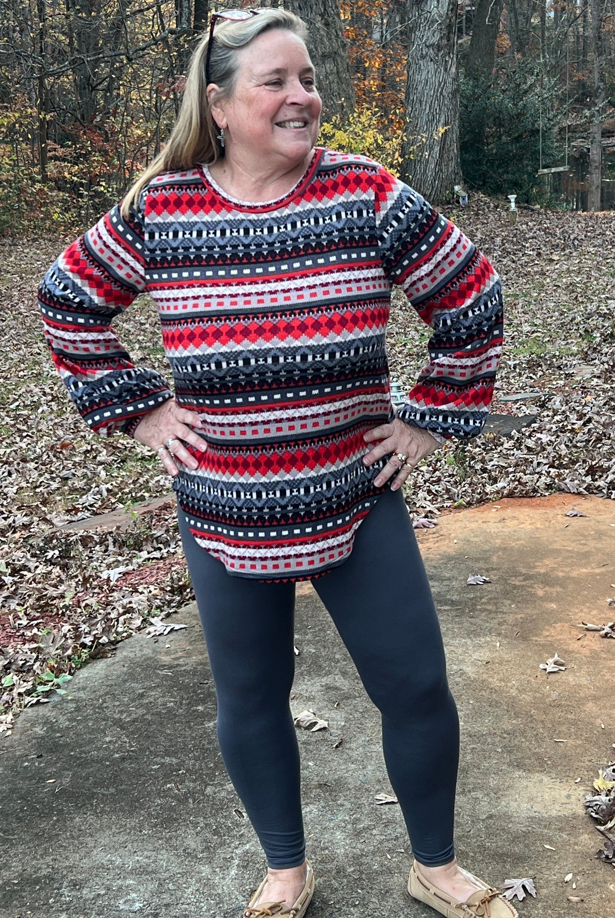 Super cute and fun Christmas sweatshirt features an adorable reindeer in the center with fir trees and polka dot patterns on the bodice and sleeves. This true to size sweatshirt has a soft, slick feel exterior and french terry knit interior. It has ribbing at the cuff and neck and is long enough to wear with leggings or skinny jeans. Available in Small to 3X.