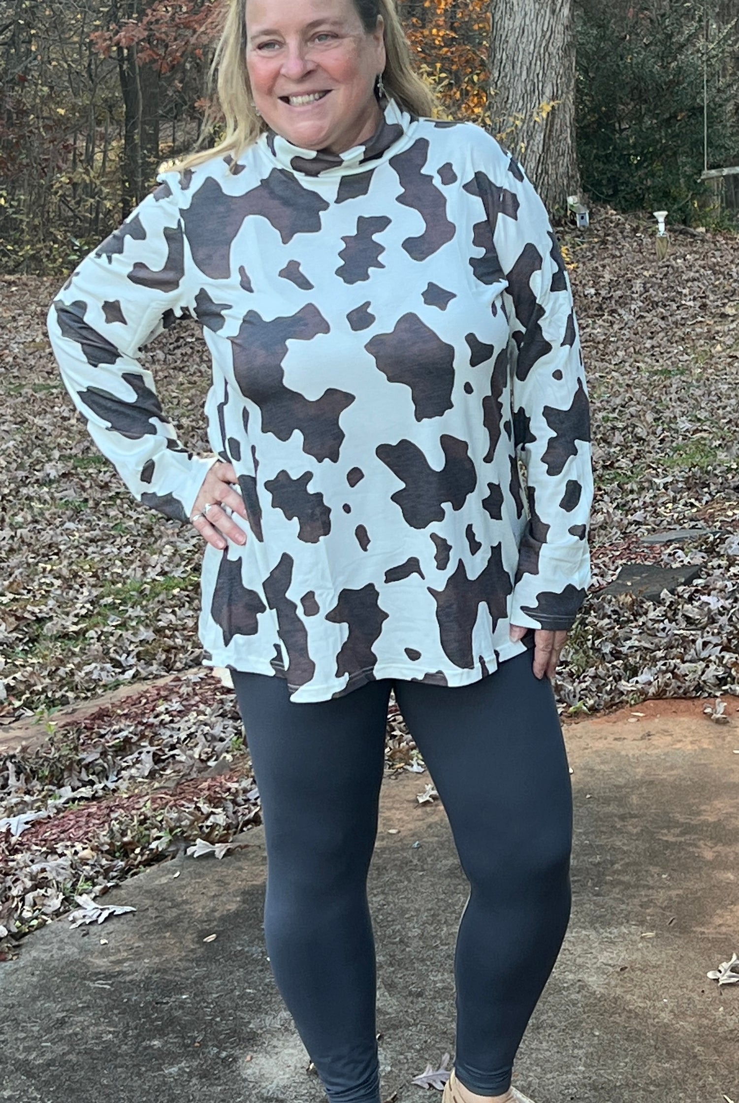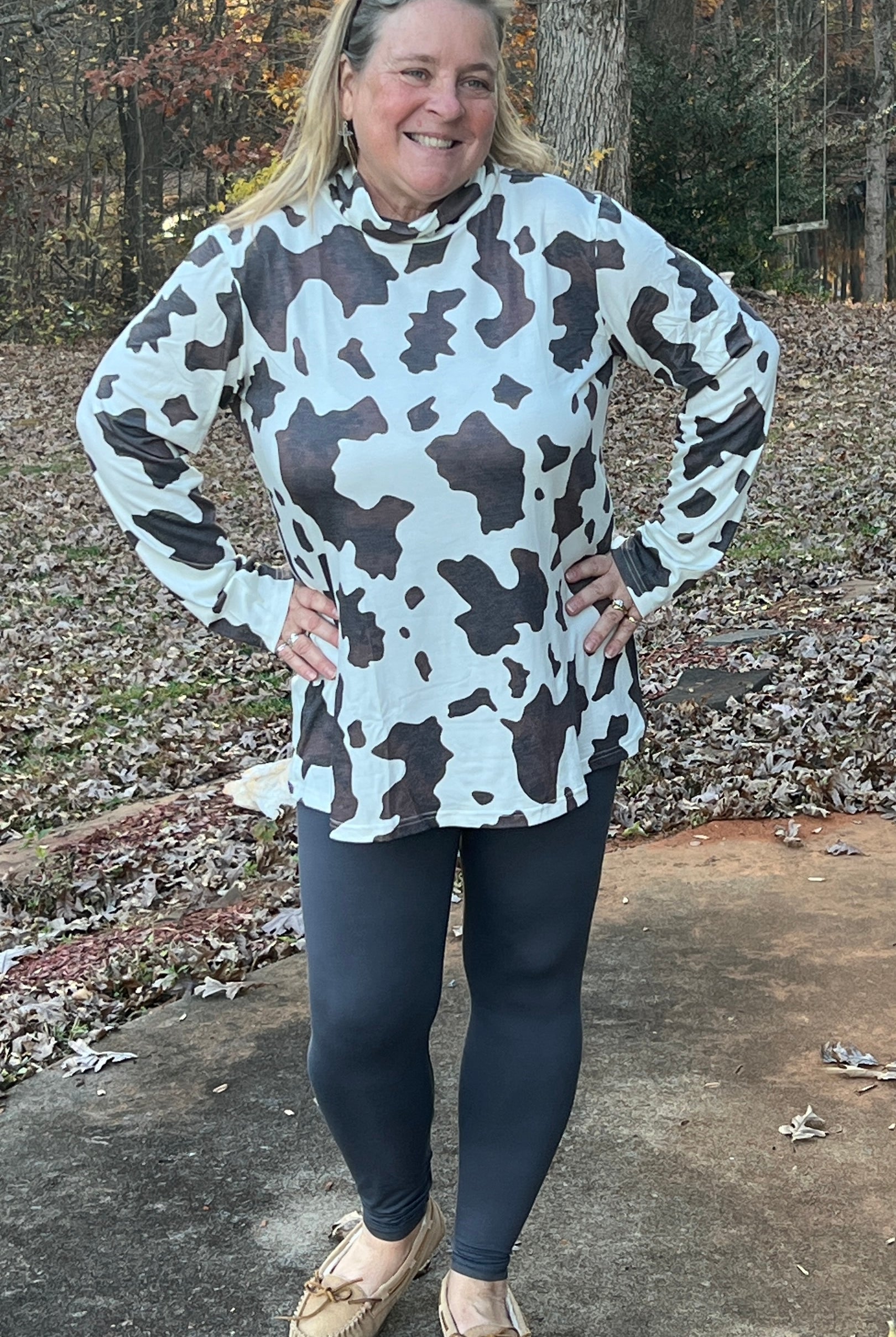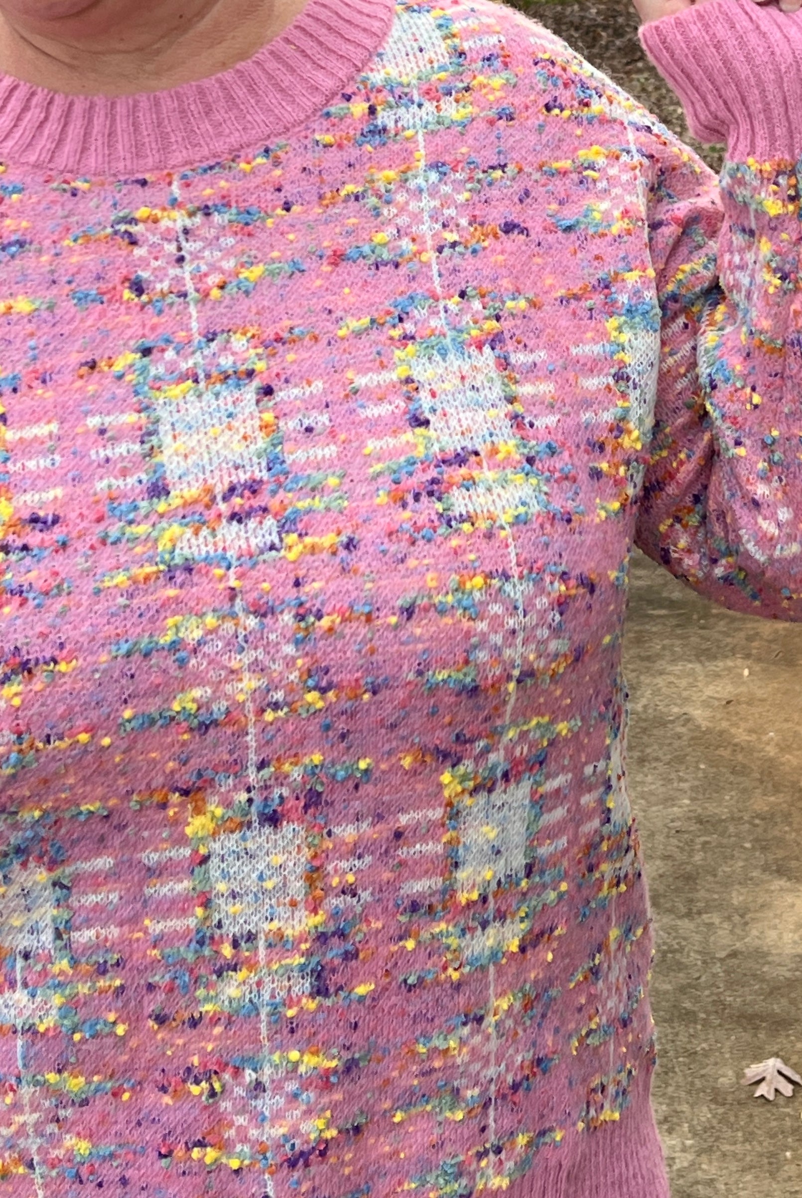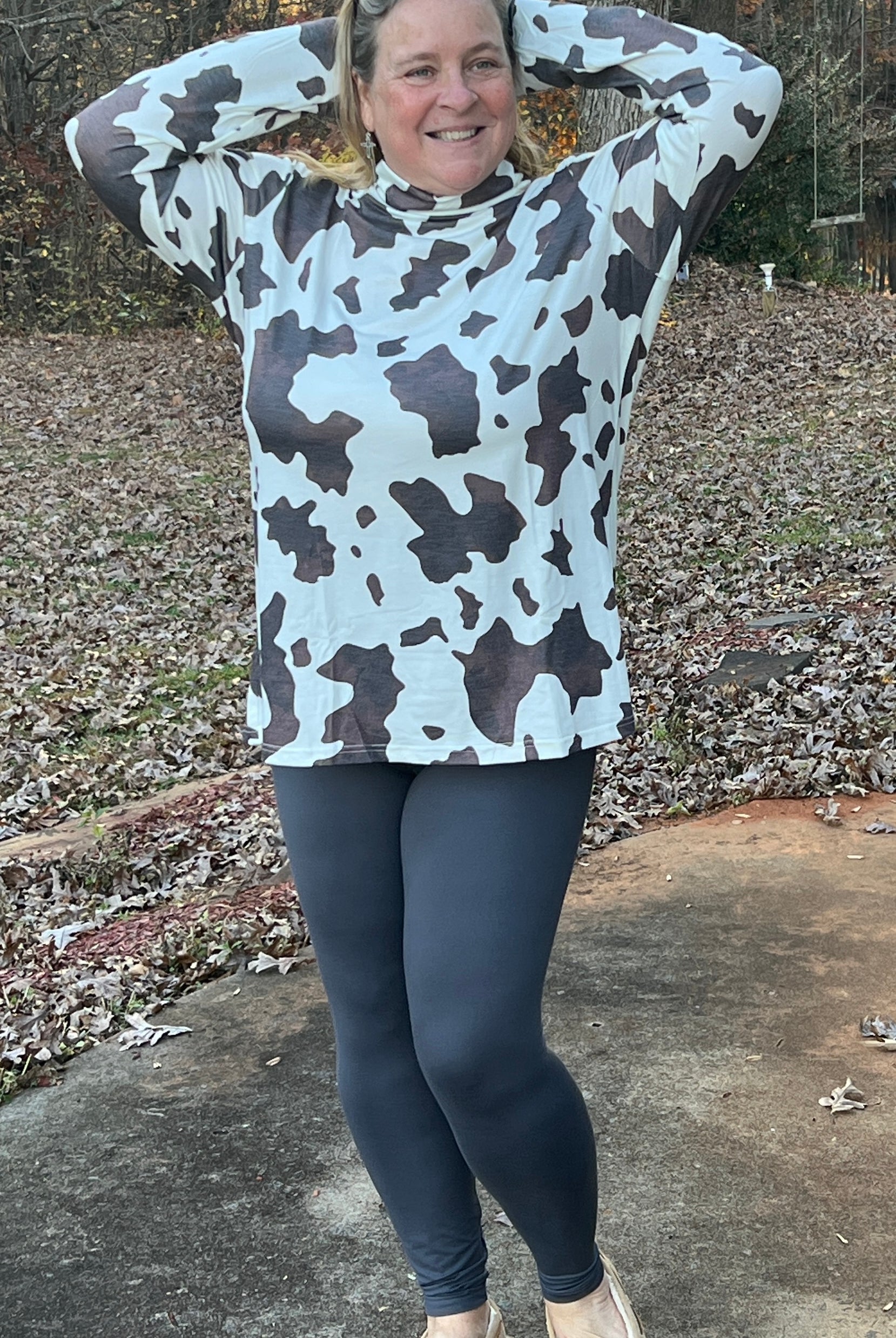 Super cute and fun Christmas sweatshirt features an adorable reindeer in the center with fir trees and polka dot patterns on the bodice and sleeves. This true to size sweatshirt has a soft, slick feel exterior and french terry knit interior. It has ribbing at the cuff and neck and is long enough to wear with leggings or skinny jeans. Available in Small to 3X.