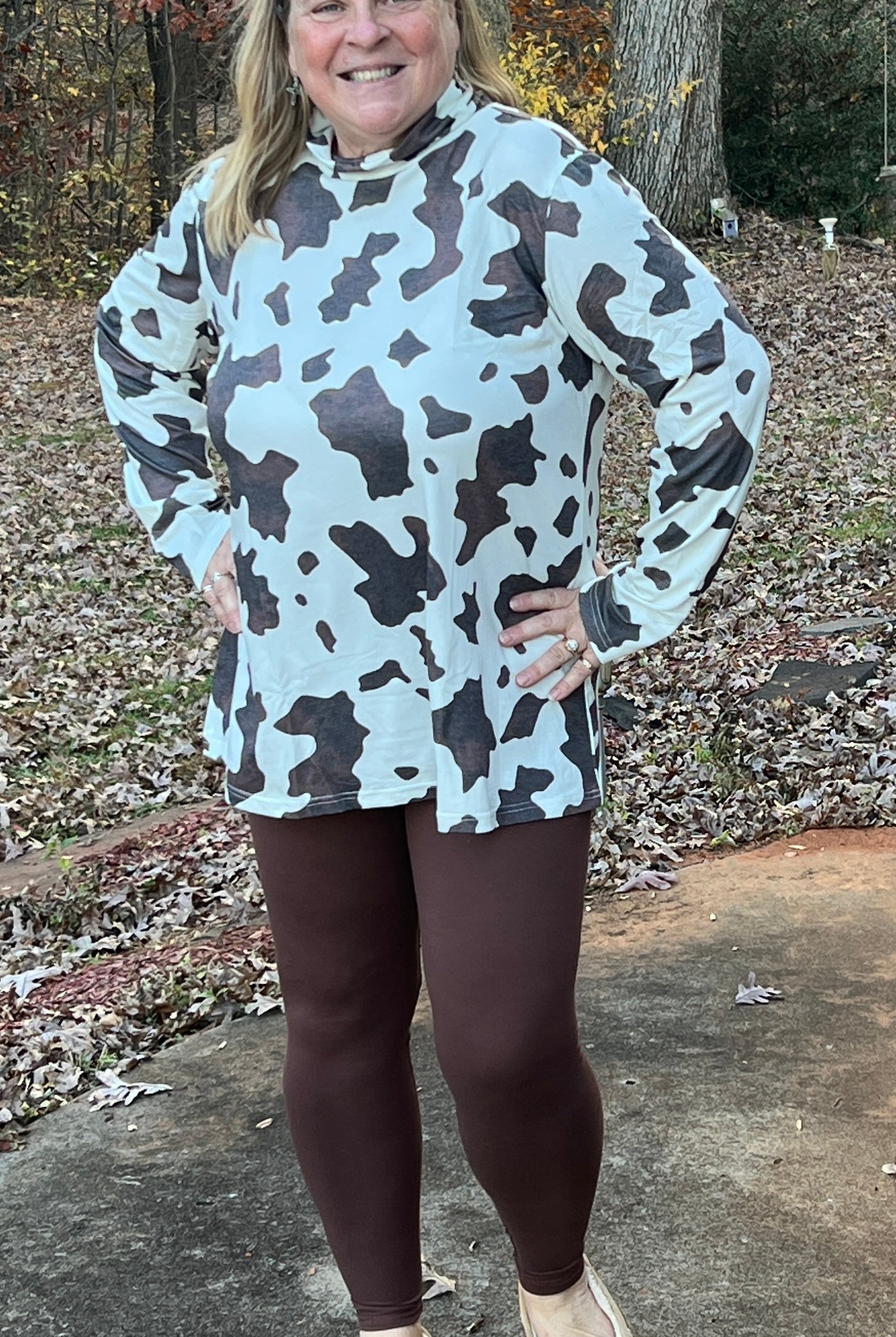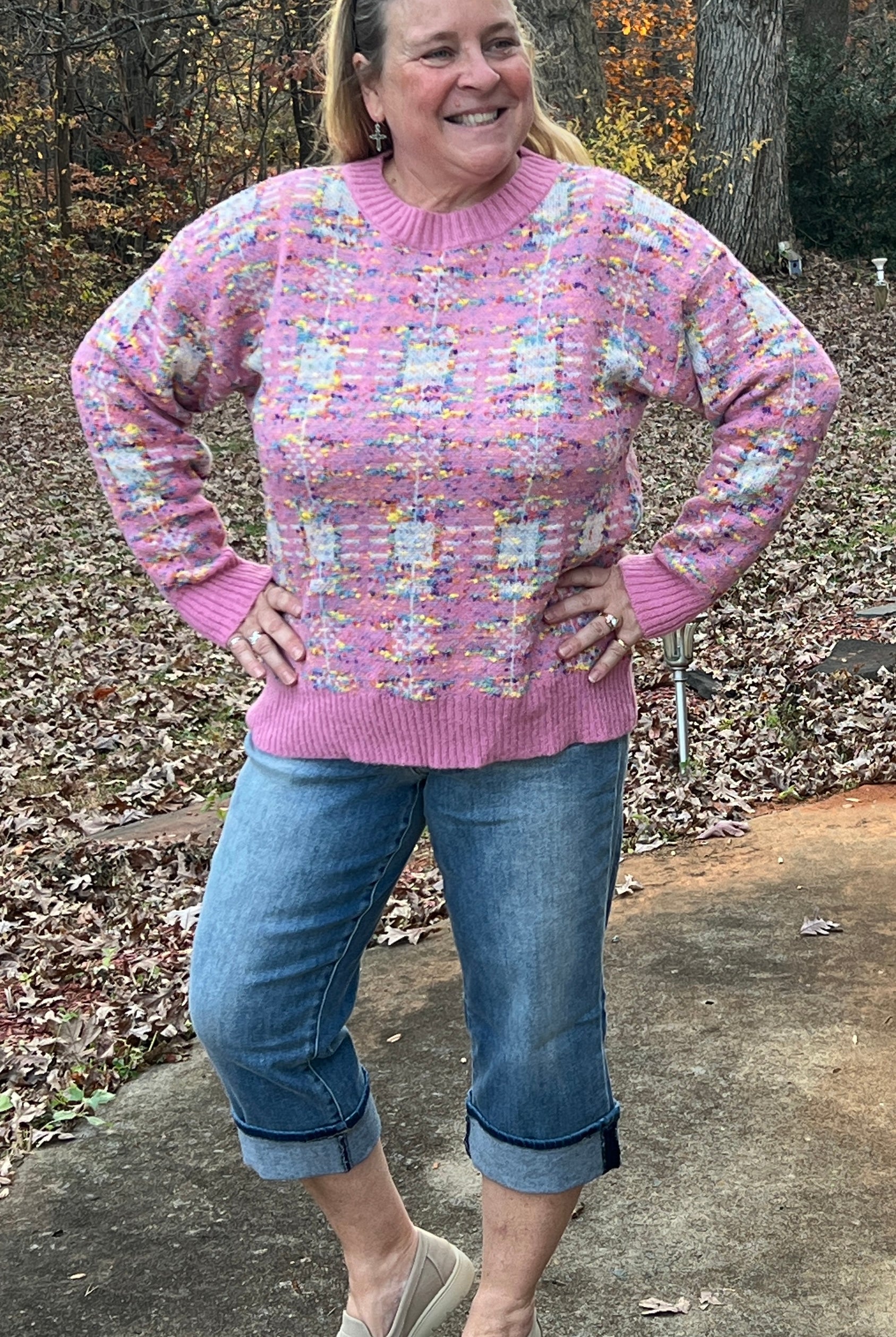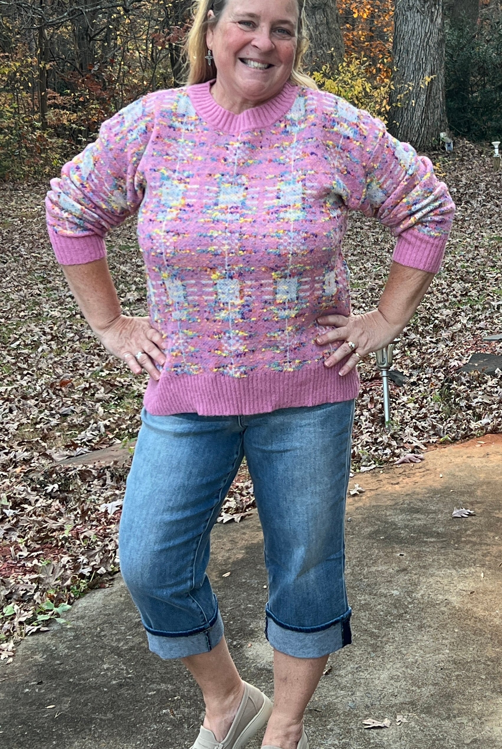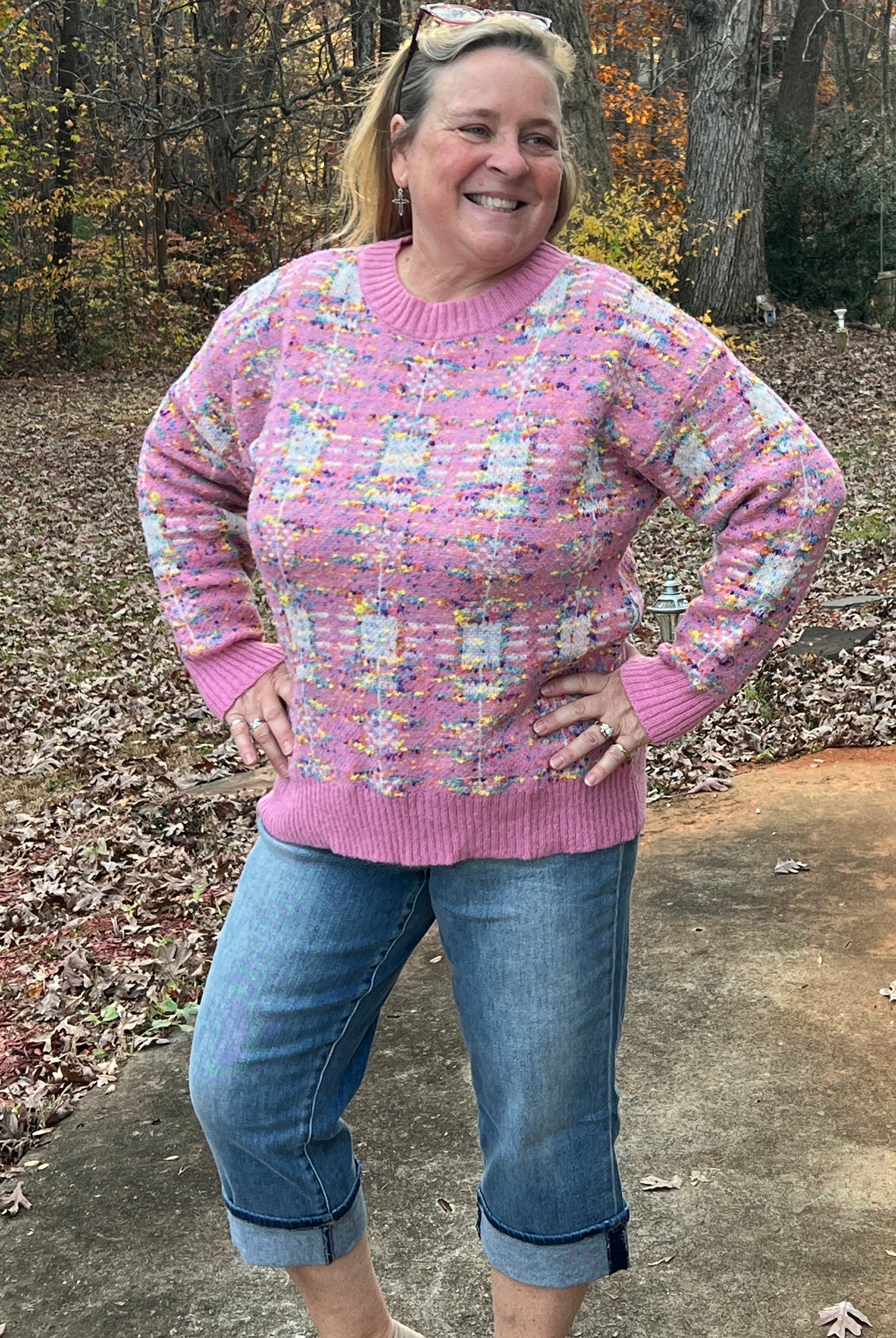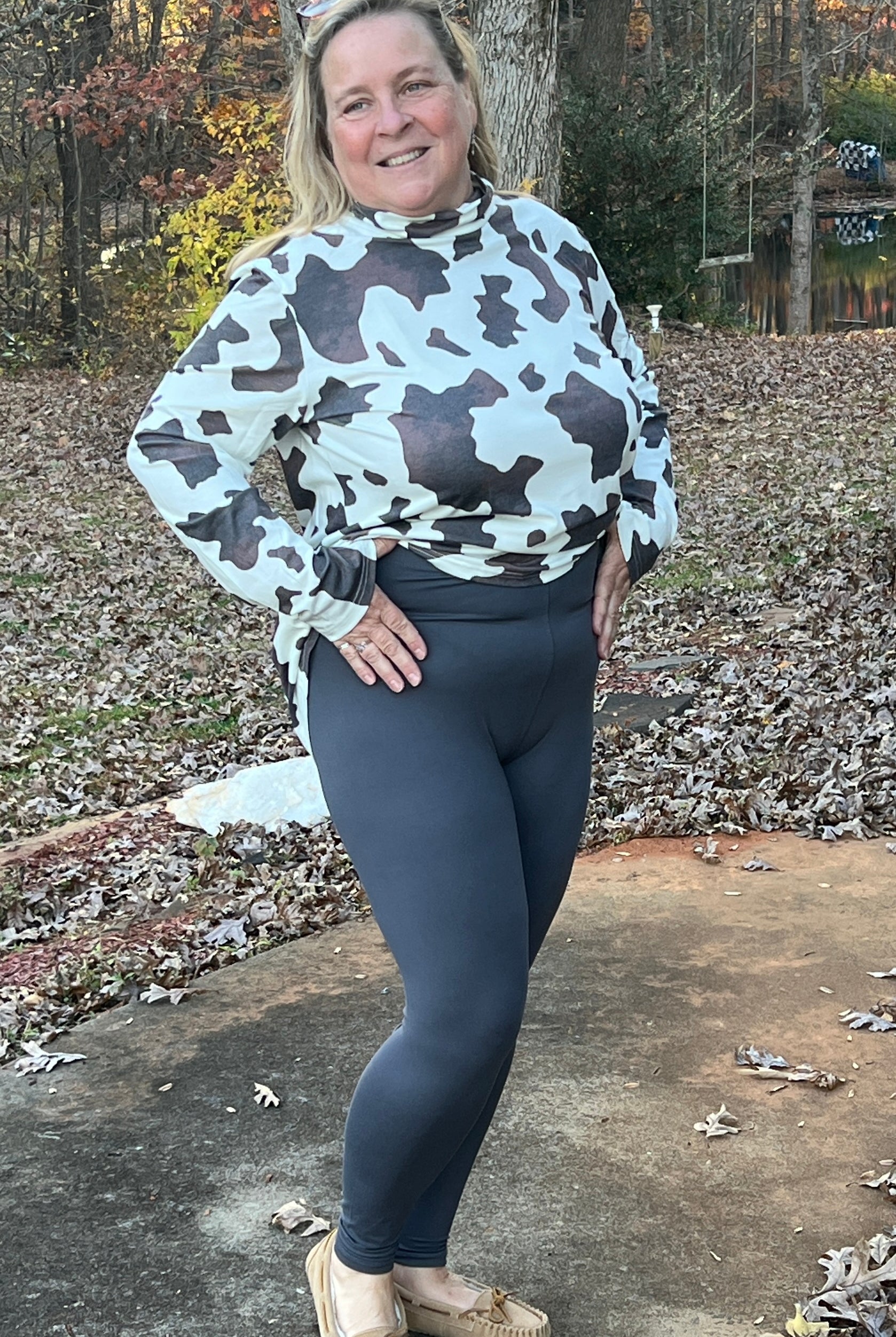 Super cute and fun Christmas sweatshirt features an adorable reindeer in the center with fir trees and polka dot patterns on the bodice and sleeves. This true to size sweatshirt has a soft, slick feel exterior and french terry knit interior. It has ribbing at the cuff and neck and is long enough to wear with leggings or skinny jeans. Available in Small to 3X.