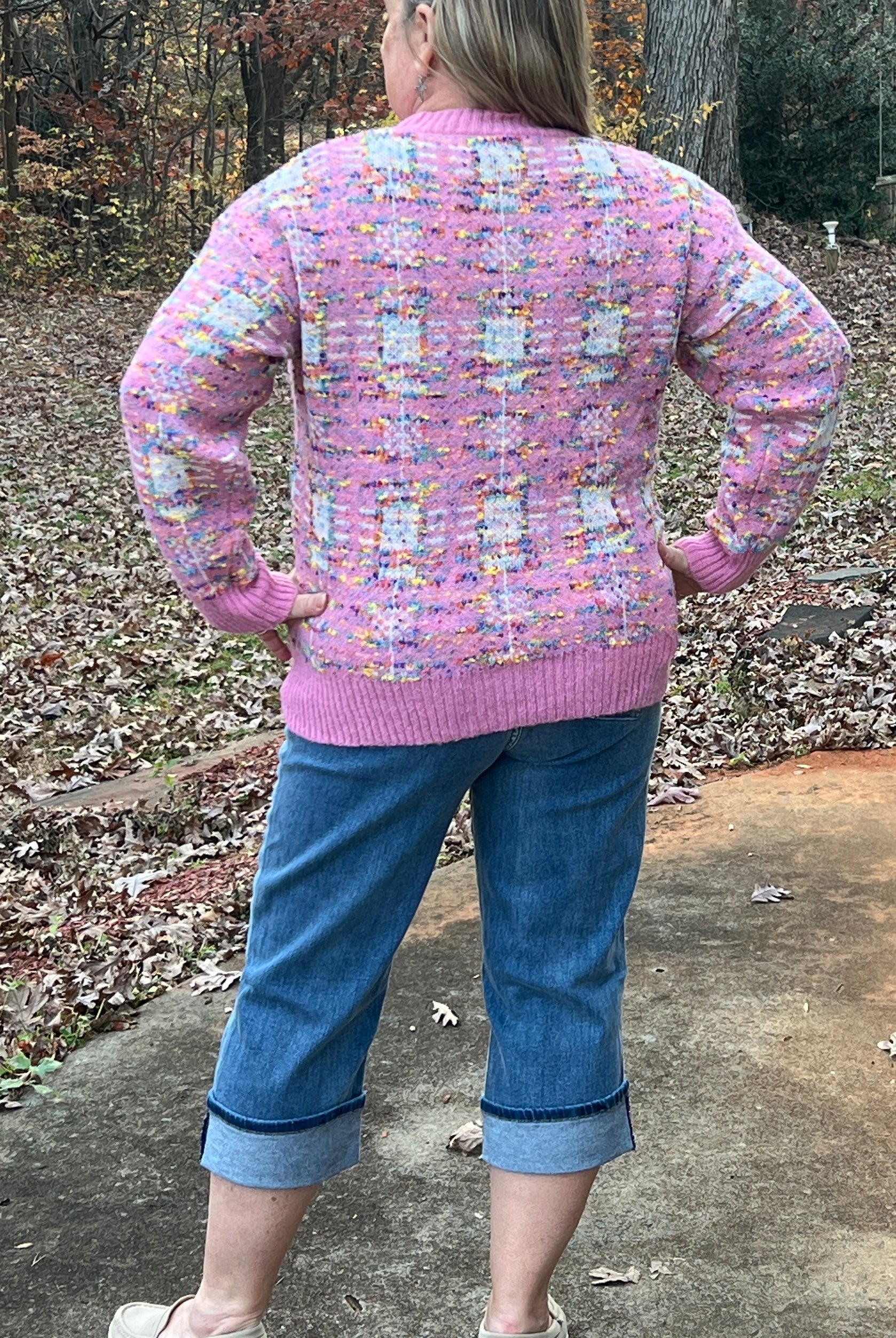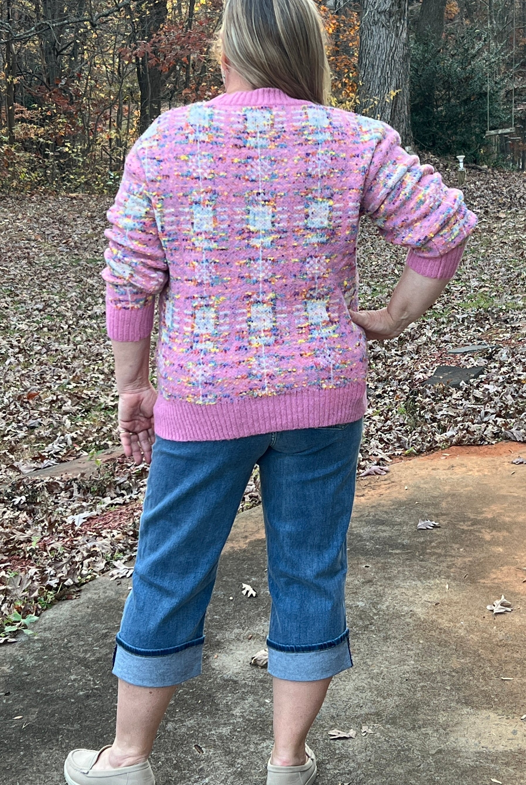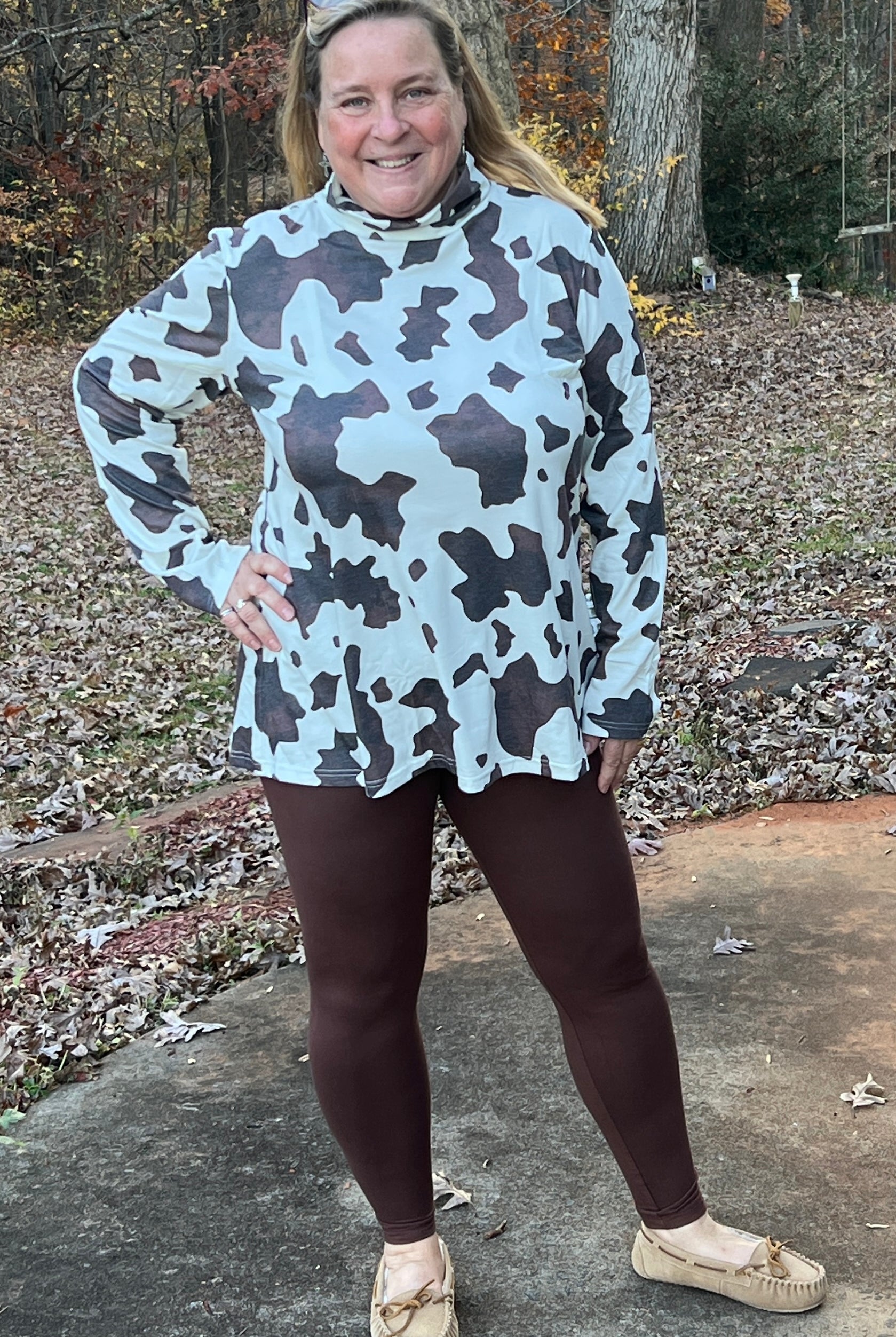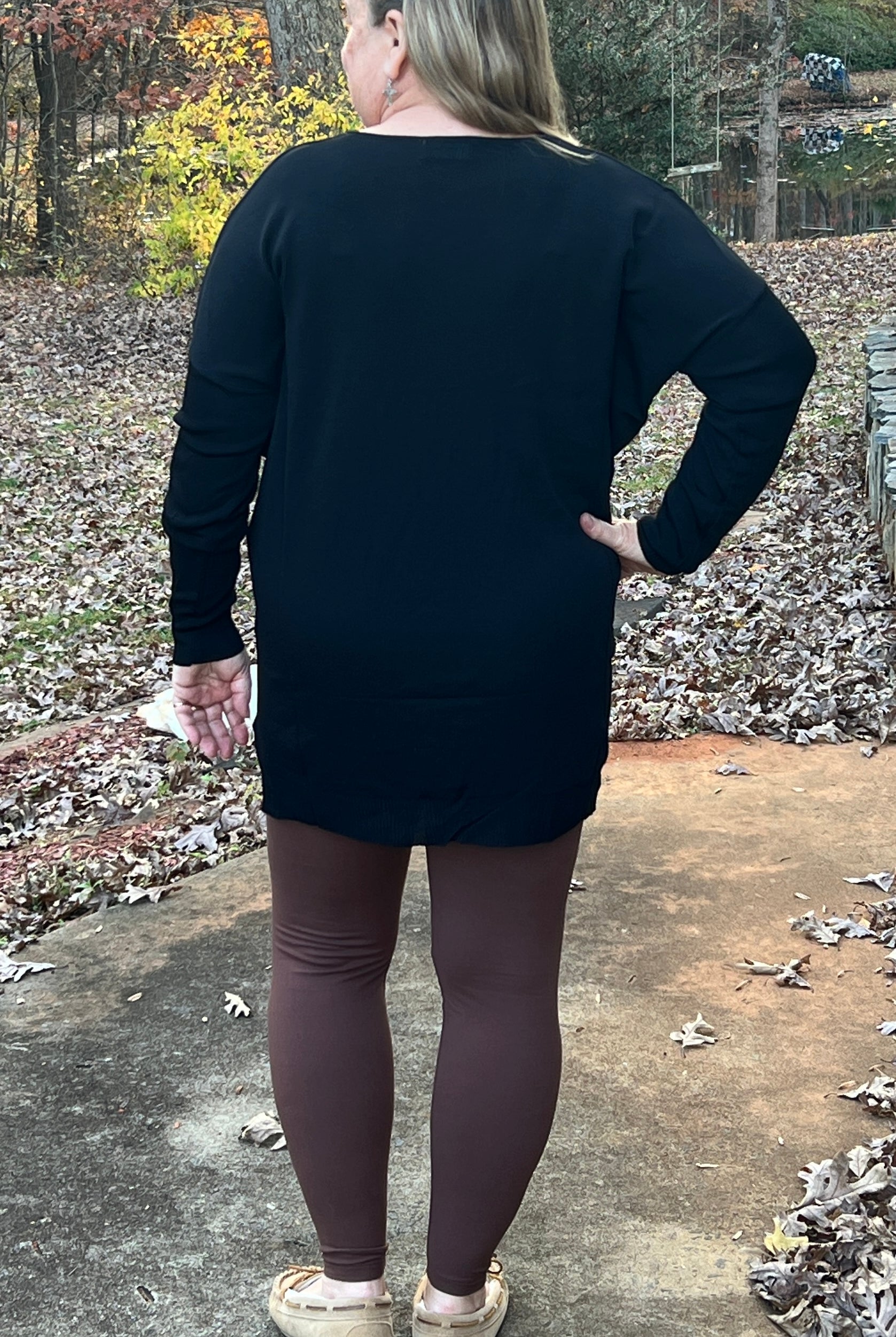 Super cute and fun Christmas sweatshirt features an adorable reindeer in the center with fir trees and polka dot patterns on the bodice and sleeves. This true to size sweatshirt has a soft, slick feel exterior and french terry knit interior. It has ribbing at the cuff and neck and is long enough to wear with leggings or skinny jeans. Available in Small to 3X.