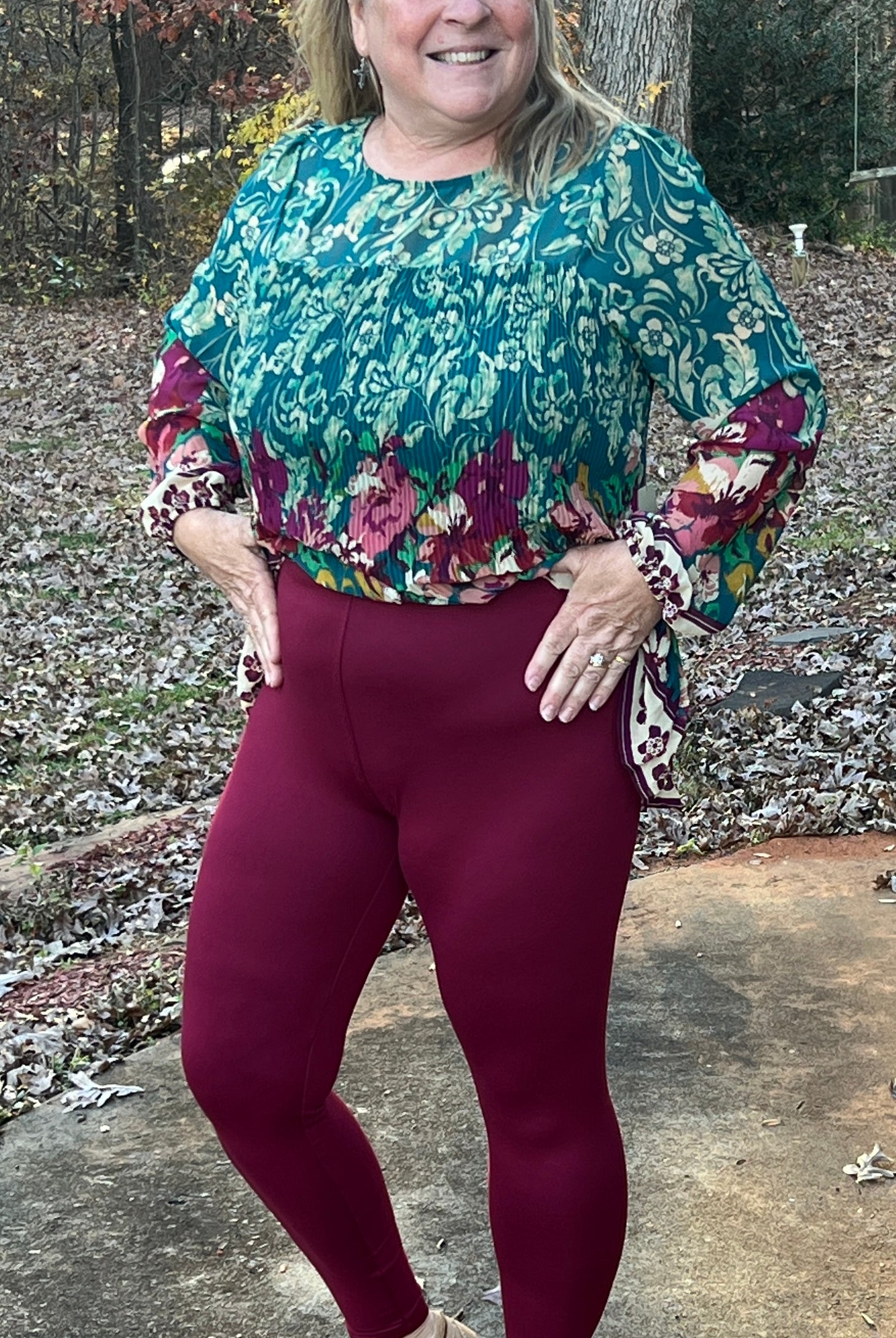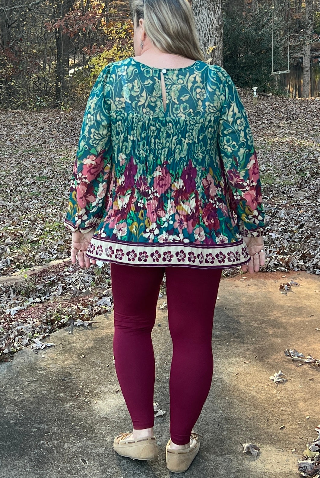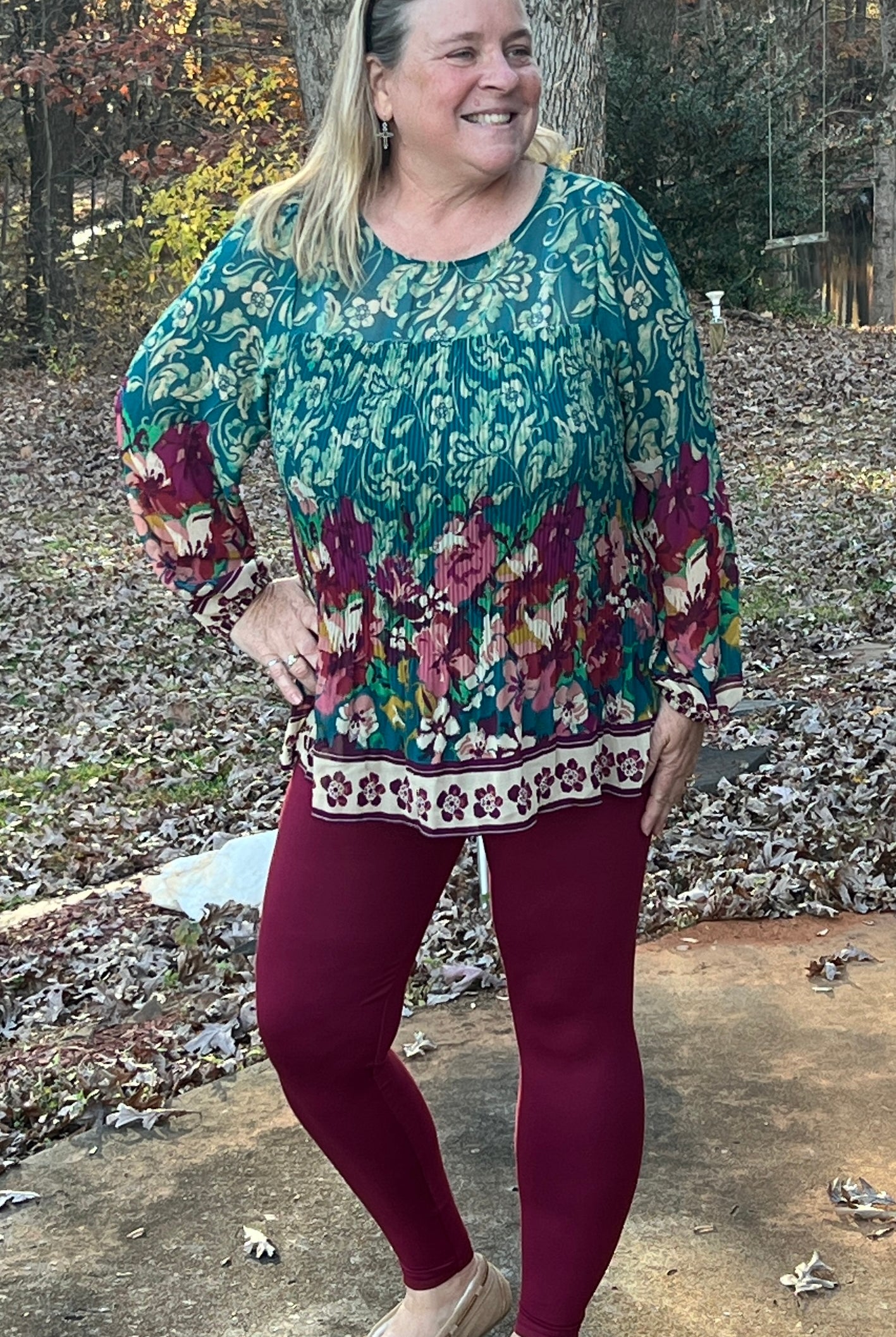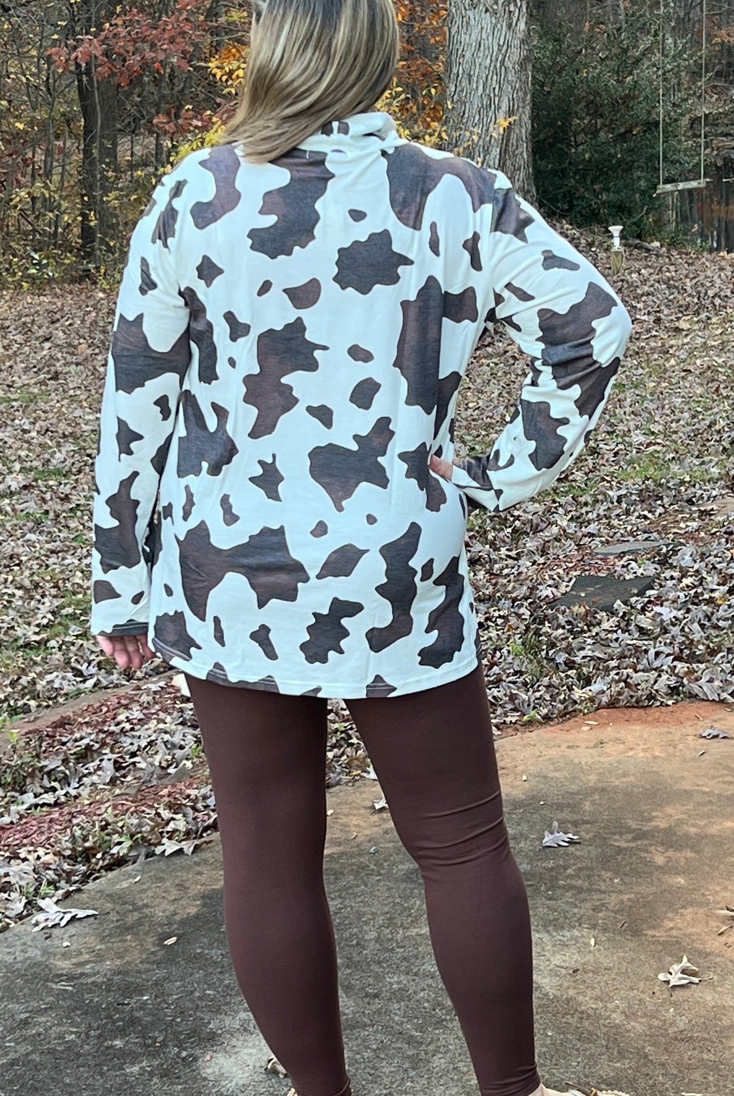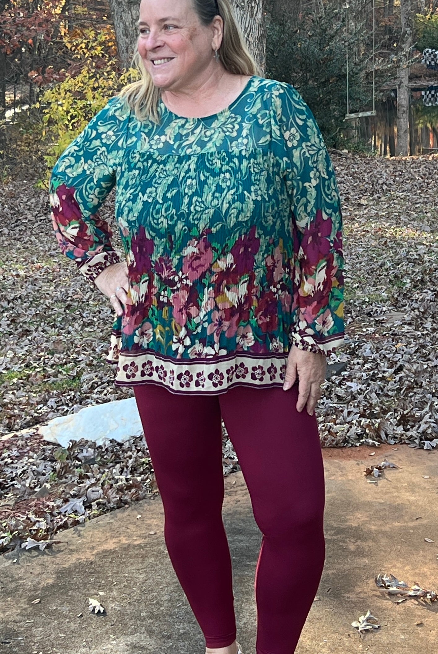 Super cute and fun Christmas sweatshirt features an adorable reindeer in the center with fir trees and polka dot patterns on the bodice and sleeves. This true to size sweatshirt has a soft, slick feel exterior and french terry knit interior. It has ribbing at the cuff and neck and is long enough to wear with leggings or skinny jeans. Available in Small to 3X.