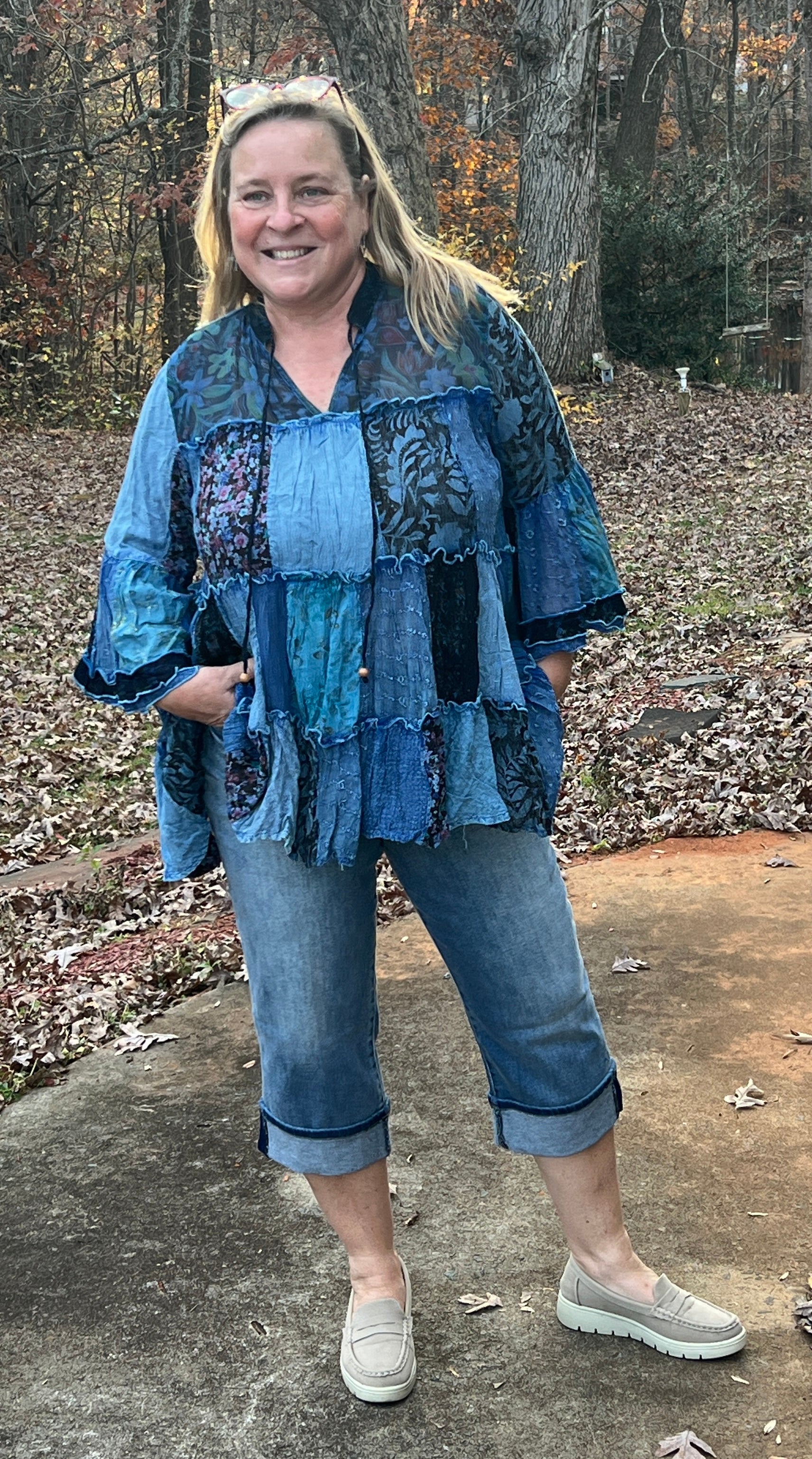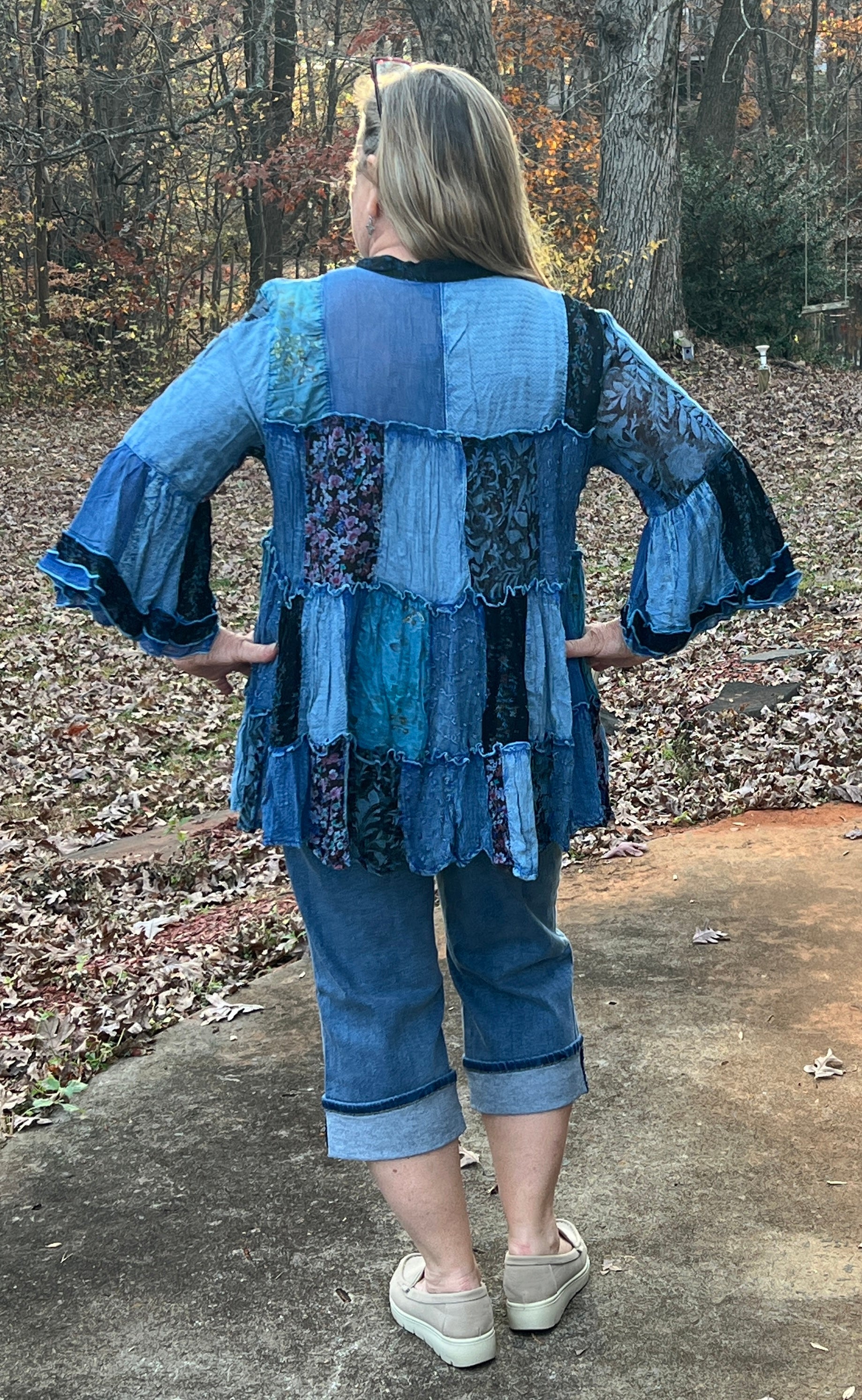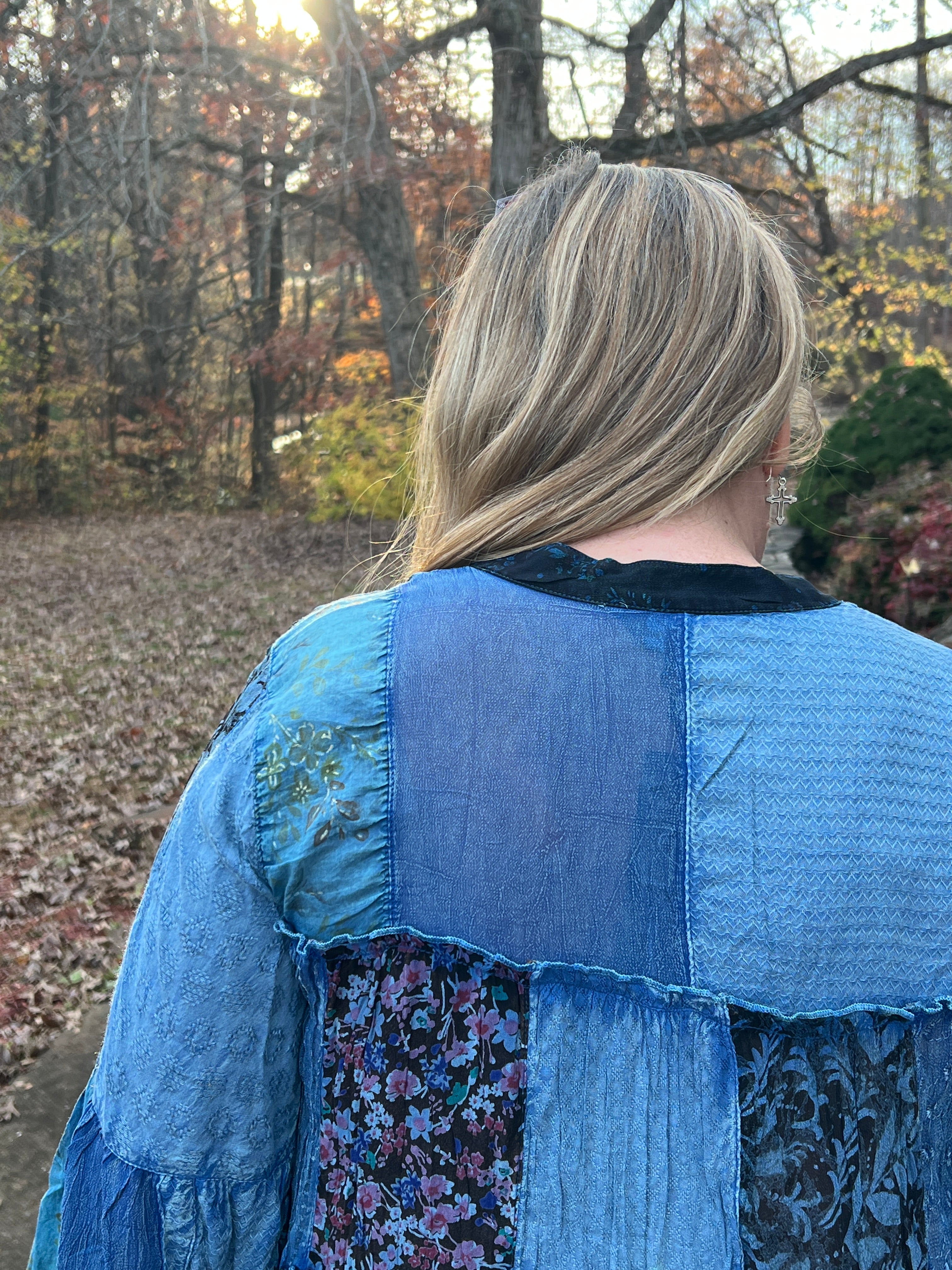 Free, flowy, oversized, and cobalt blue, this Bohemian style blouse features a patchwork pattern with some squares that are more sheer and others that have a silky feel or floral pattern. This tiered blouse has an open mandarin collar with large bead ties that fall on either side of the collar opening. The bell shaped sleeves are wide and have a double ruffle cuff. This blouse is gorgeous and the pictures just don't do it justice!