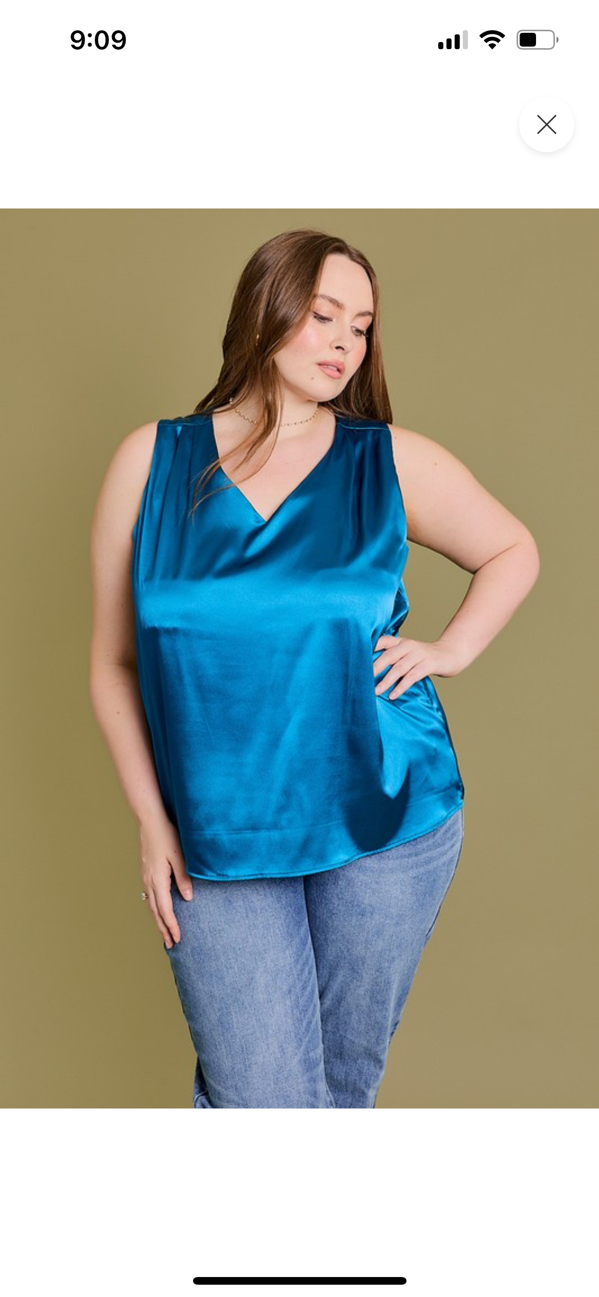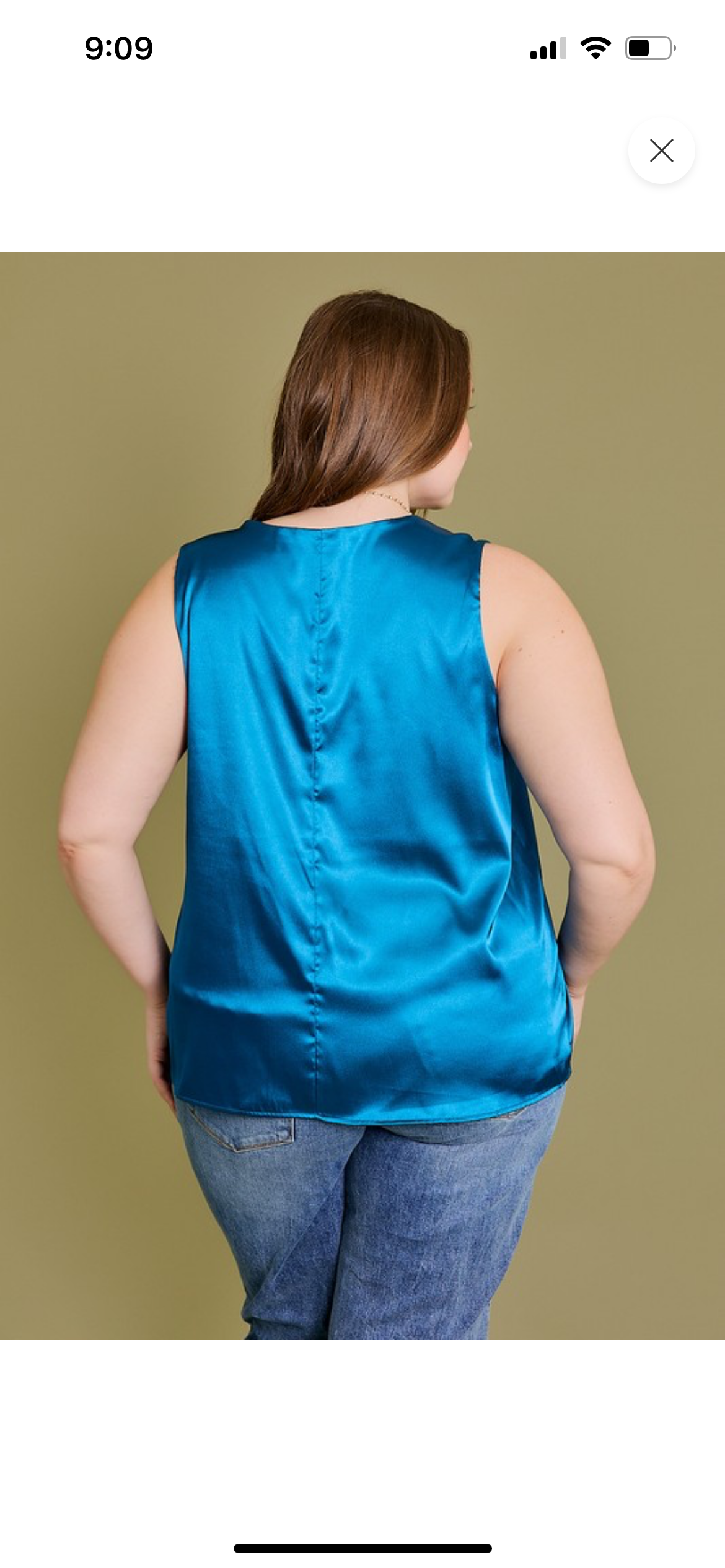Peacock Blue Sleeveless Satin Plus Size Dressy Tank