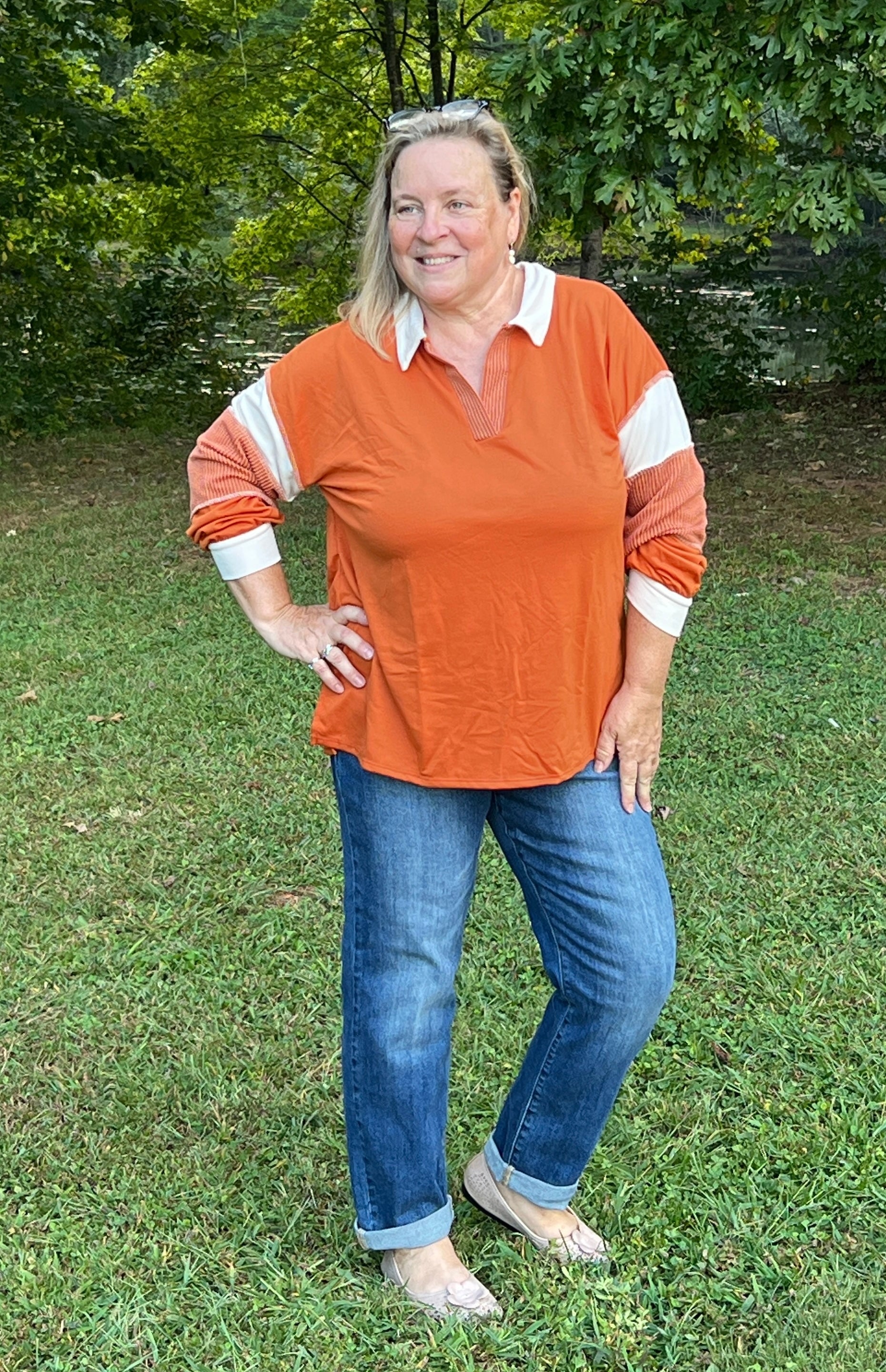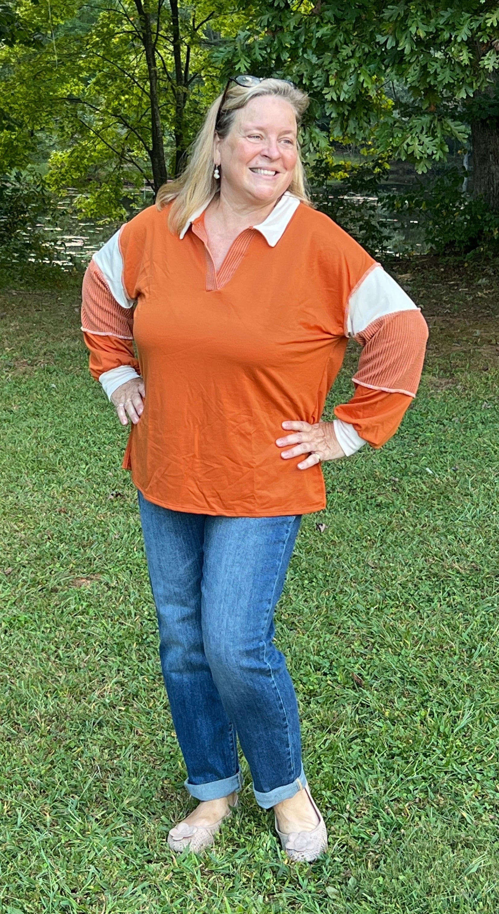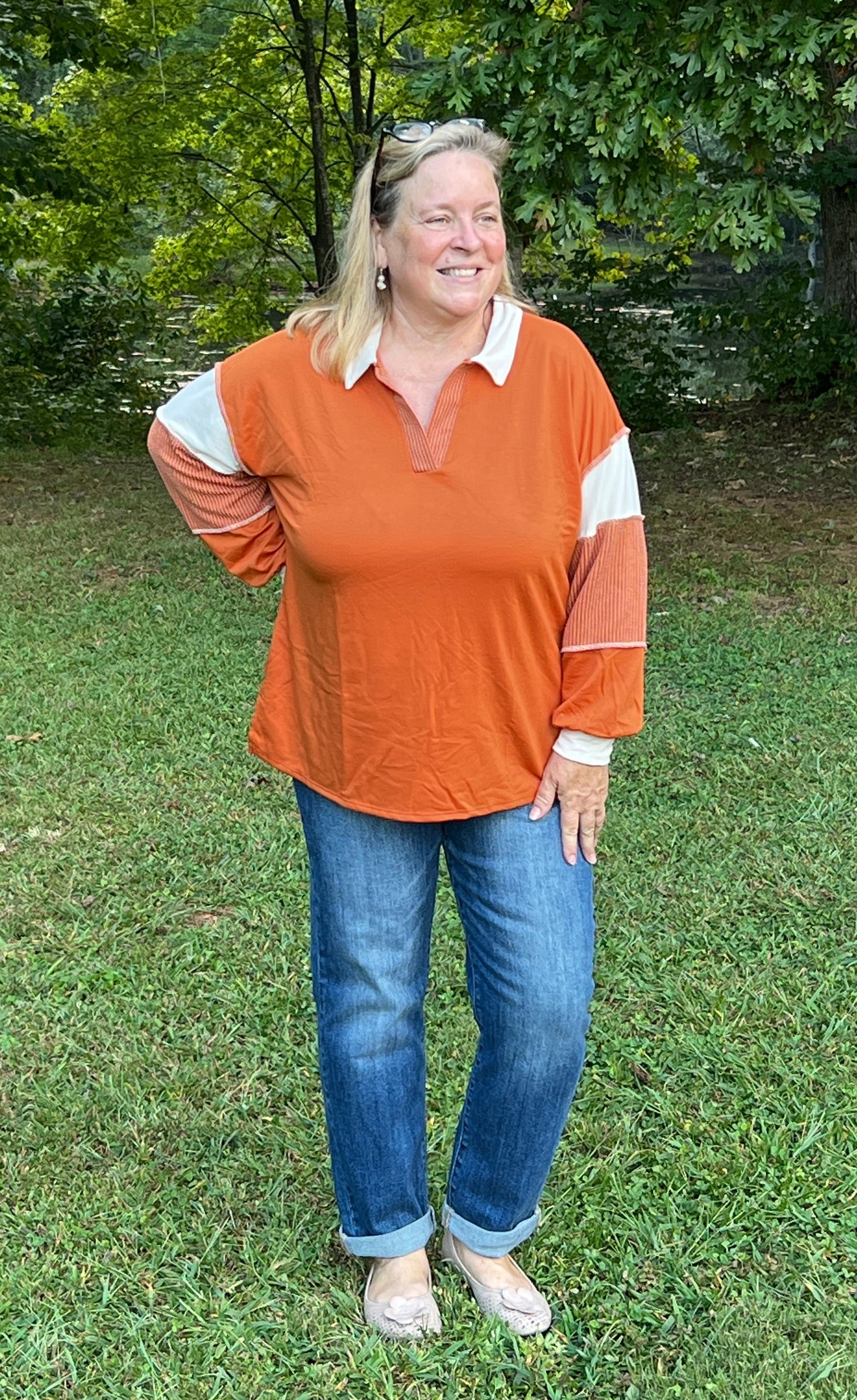 Rust Oversized Knit Pullover Top with Johnny Collar