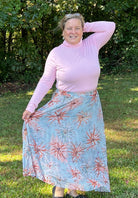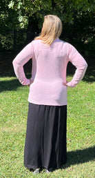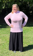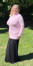 This pink parasol plus size turtleneck top has a snug, true to size fit. It is butter soft, has long sleeves, is top of thigh length, and the neck is gathered on each side to ensure a close, comfortable fit. It is perfect for wearing under your favorite vest or sweater this fall and winter.