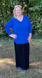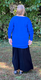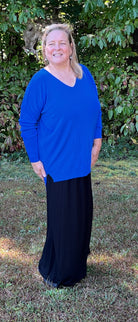 Royal Blue V-neck sweater in a silky rayon/nylon knit. Subtle ribbing at cuffs and hem with a relaxed hi-lo silhouette. Smooth, soft, and easy to wear whether over leggings or tucked into a skirt.