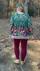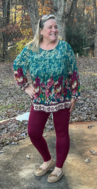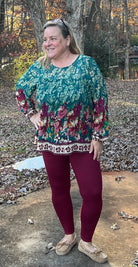 Elegant plus size teal and burgundy floral multicolor peasant blouse. It features a bodice that is lined from the top of the chest to hem, sheer sleeves with elastic cuff, sheer shoulder area, and back of neck button closure. Accordion pleating on the sheer bodice. Falls below waist at hips.