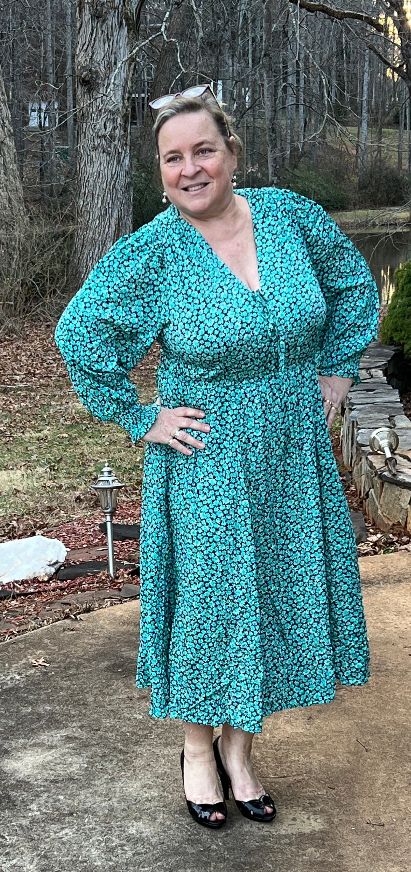 Comfort and style make this true to size fit midi length dress a timeless choice.  The silky feel tiny jade flower print fabric, long sleeves with elasticized cuff, and elastic waist offer comfort while the deep v-neck with tie and two hook-and-eye closures at the bust keep it stylish.