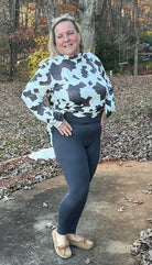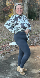 Model in size 1X, paired with our Western Cow print Turtleneck Plus Size Top.
