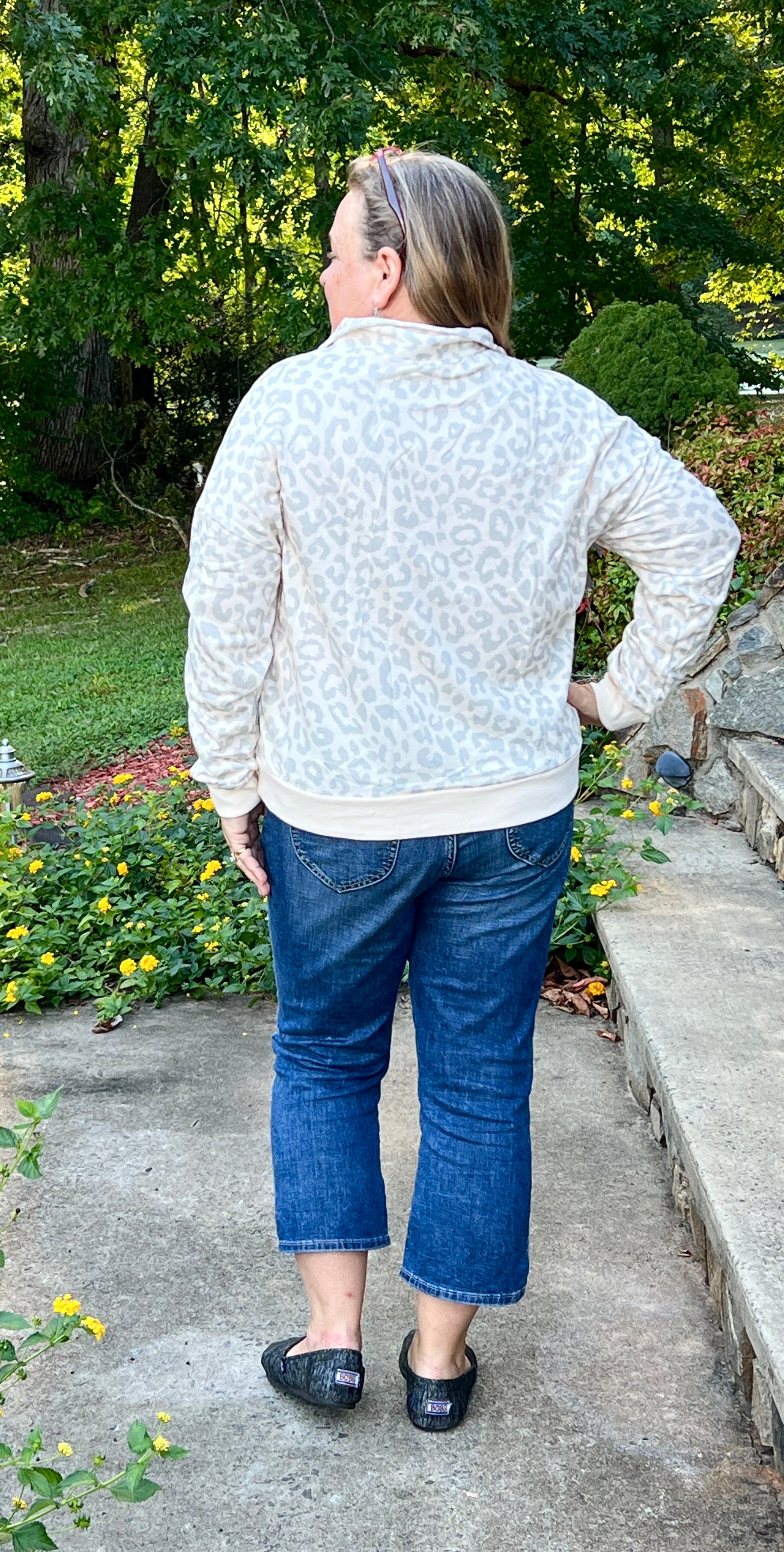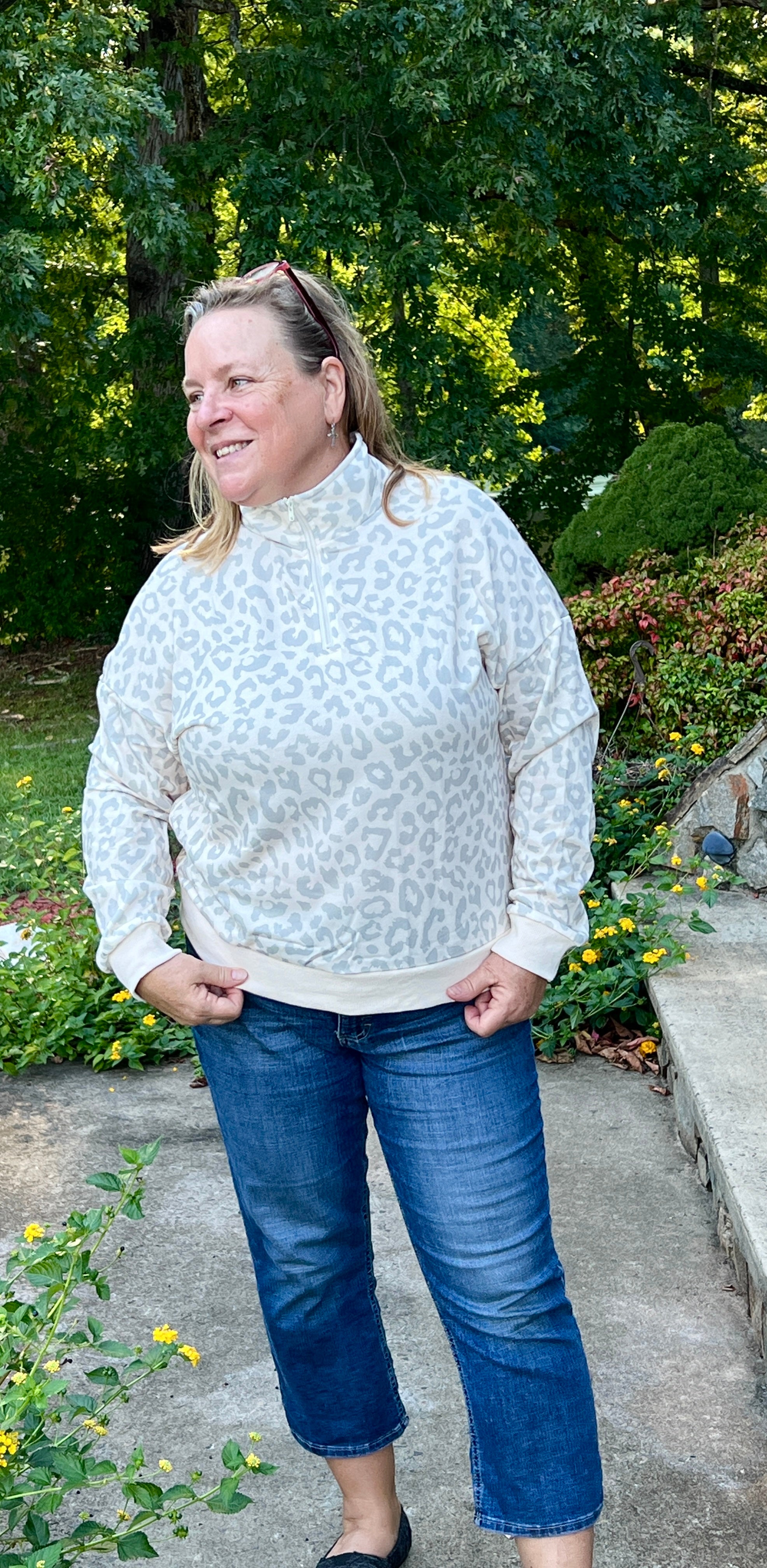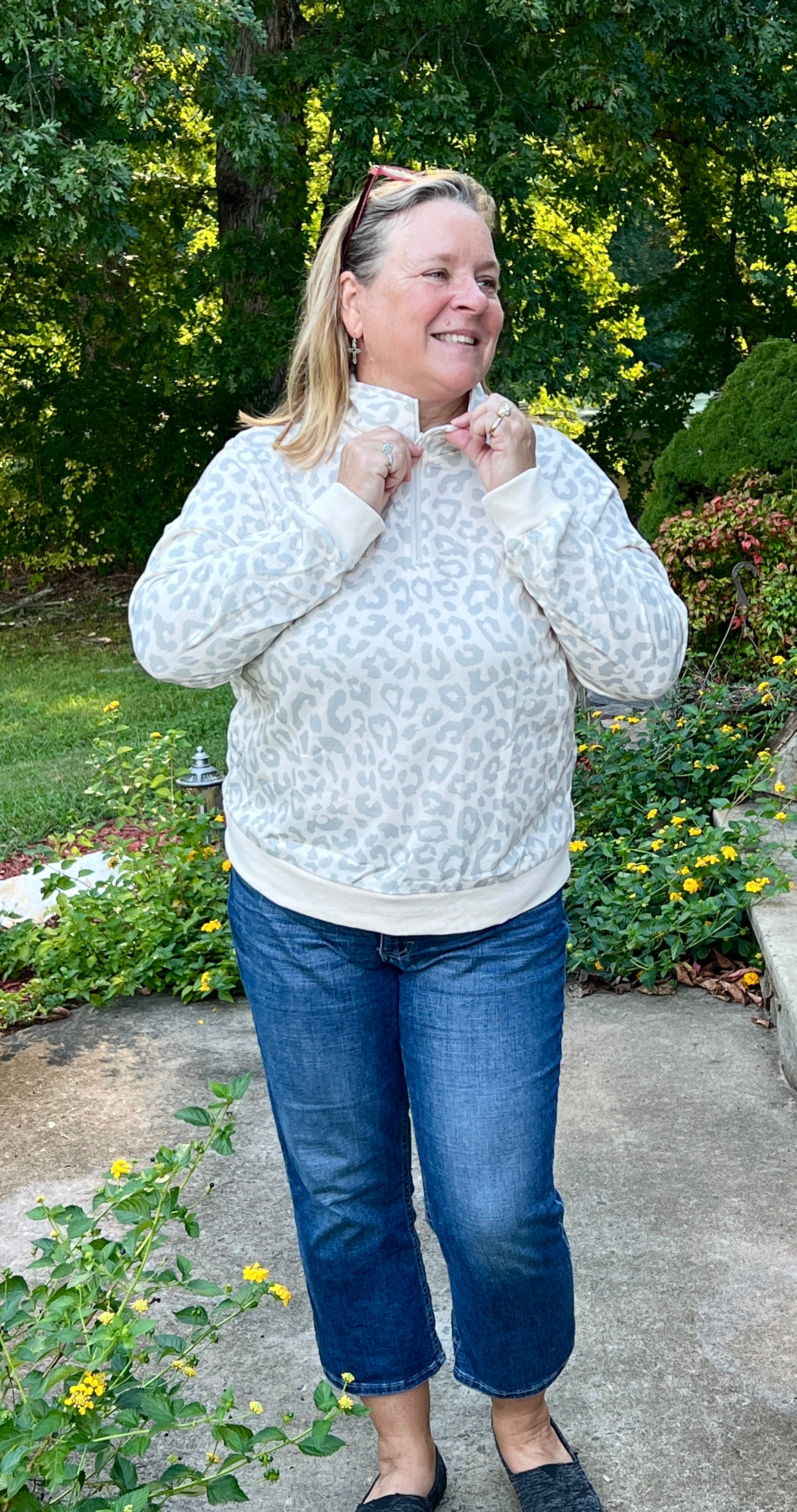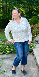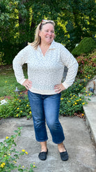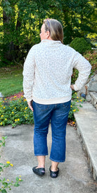 Comfortable and fitting true to size, this Mint Green and Cream color pullover top has a leopard print pattern, zippered mock neck, and banded cuffs and waist length hemline.