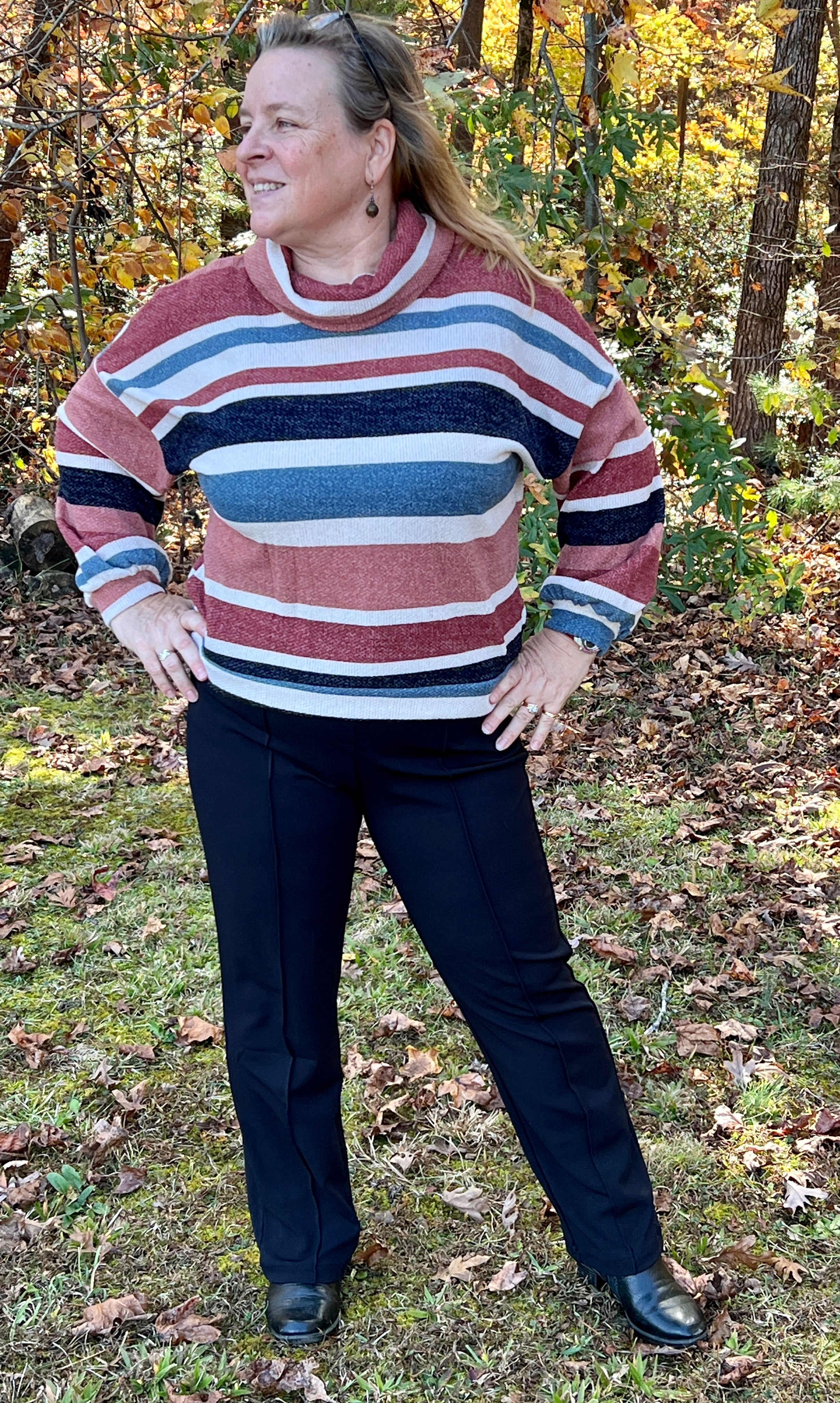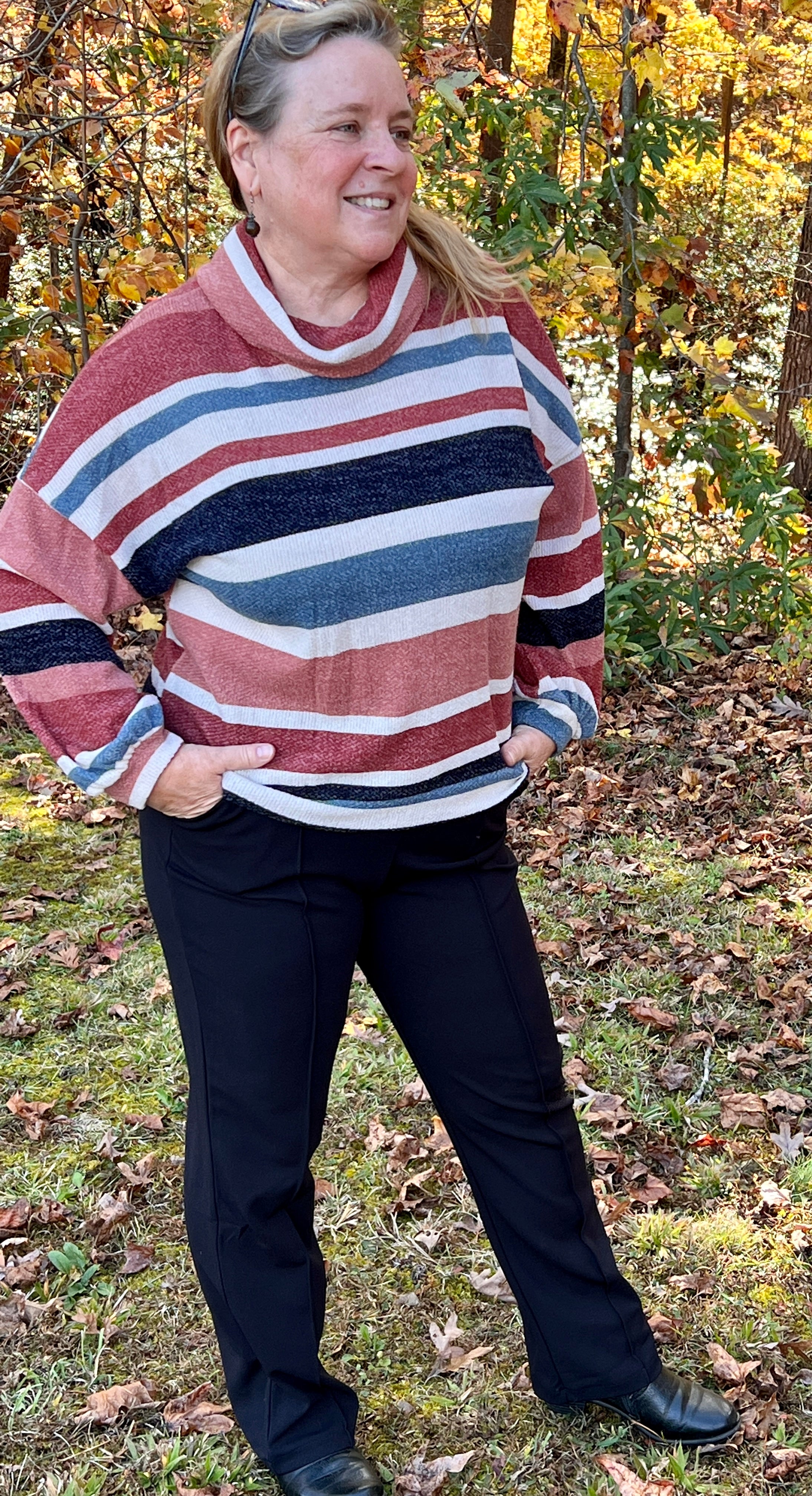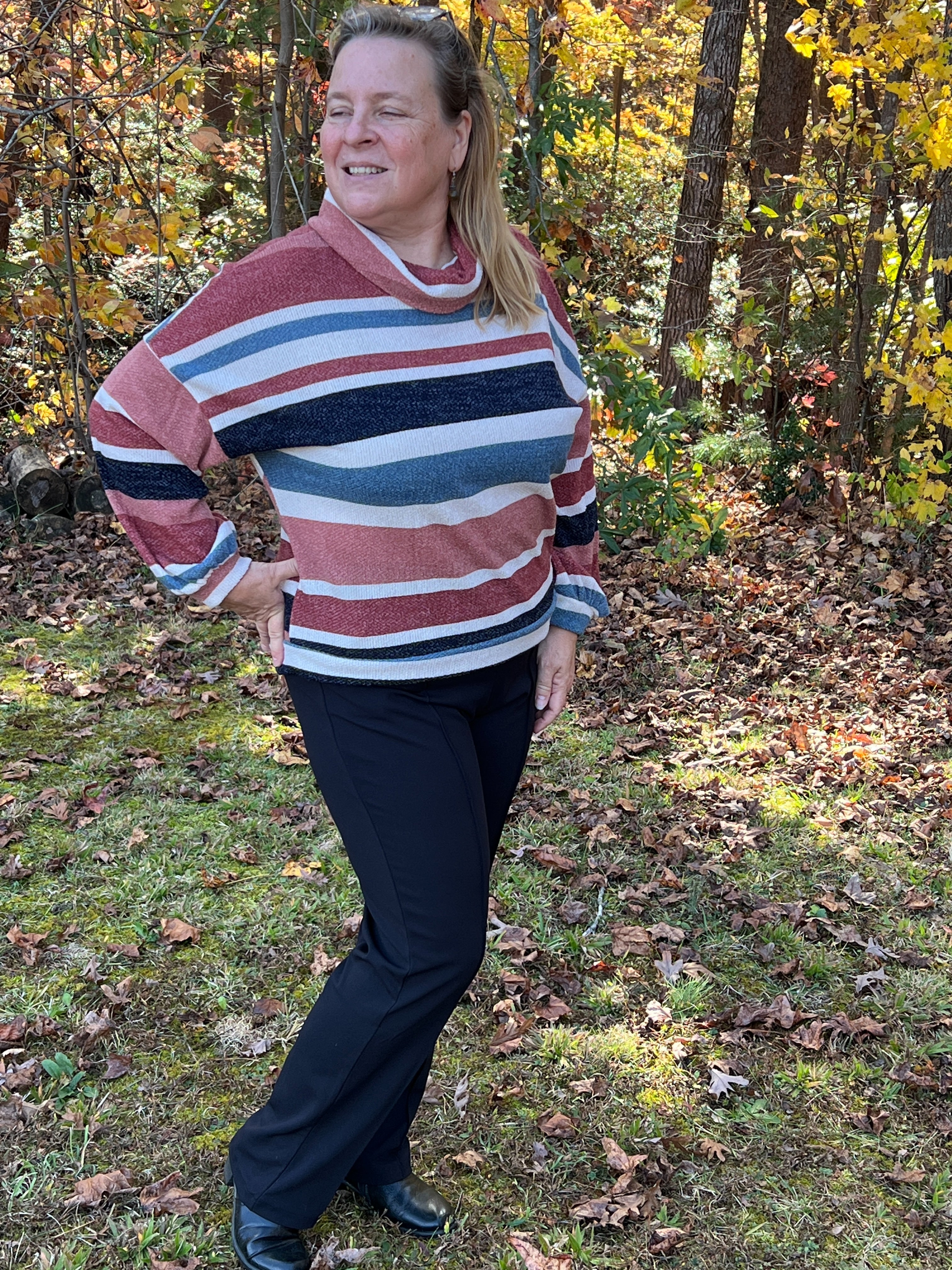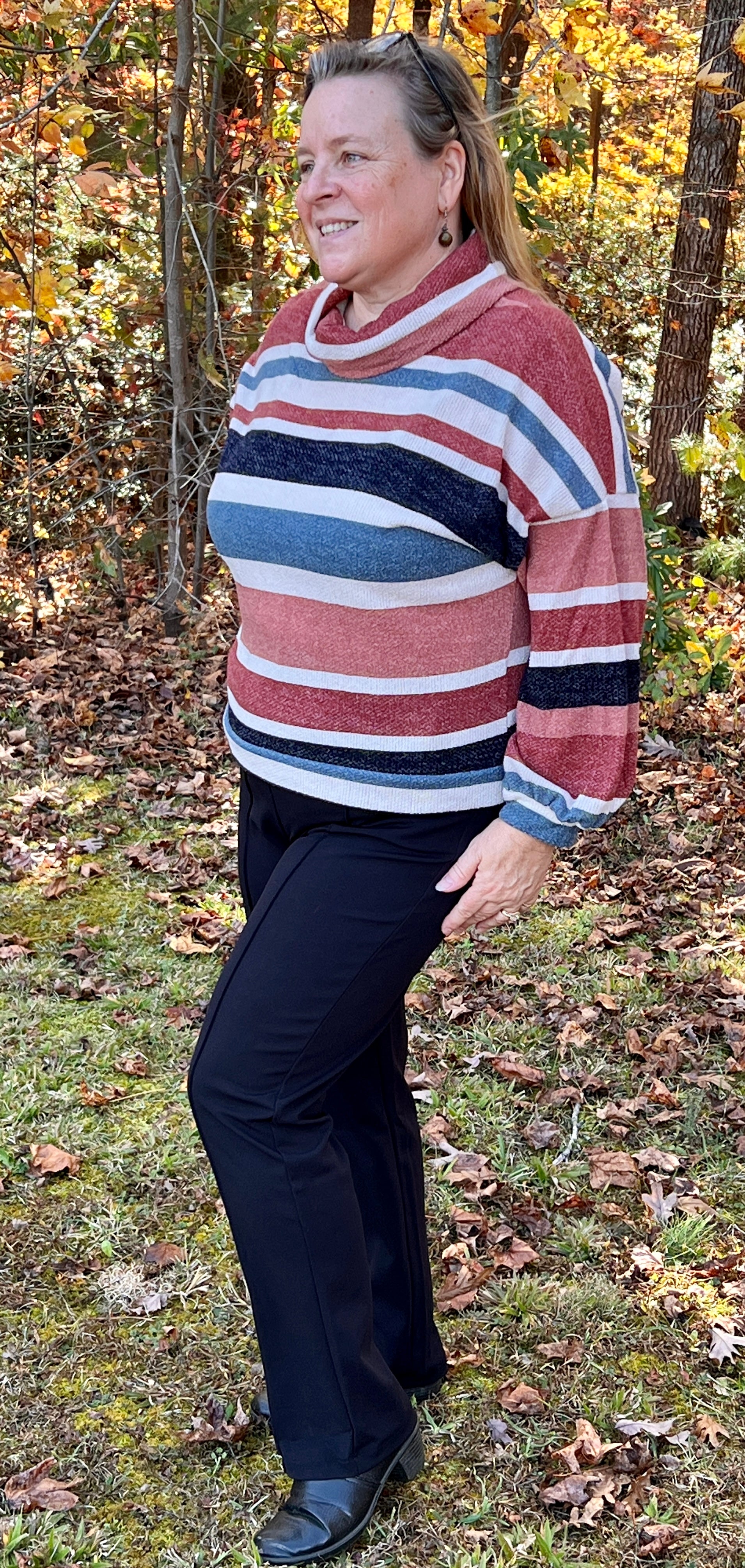 This lightweight knit cowl neck sweater top fits slightly larger than true to size. It features teal, burgundy, rust, and neutral tone stripes, slouch shoulders and slight balloon style sleeves that end in a stretchy cuff. This sweater is banded at the hemline and falls at the hips. It would look great with jeans or a skirt for work or church.