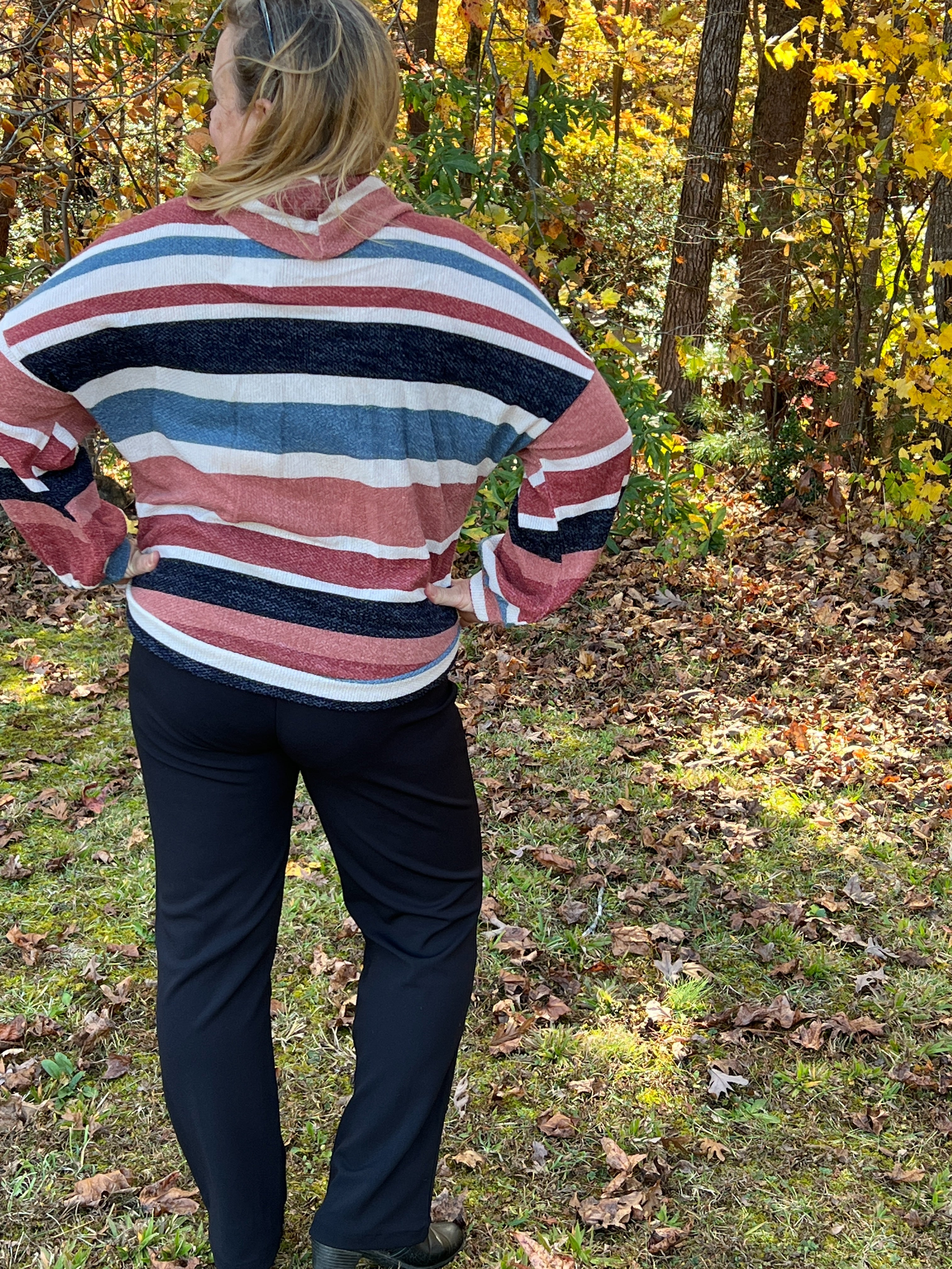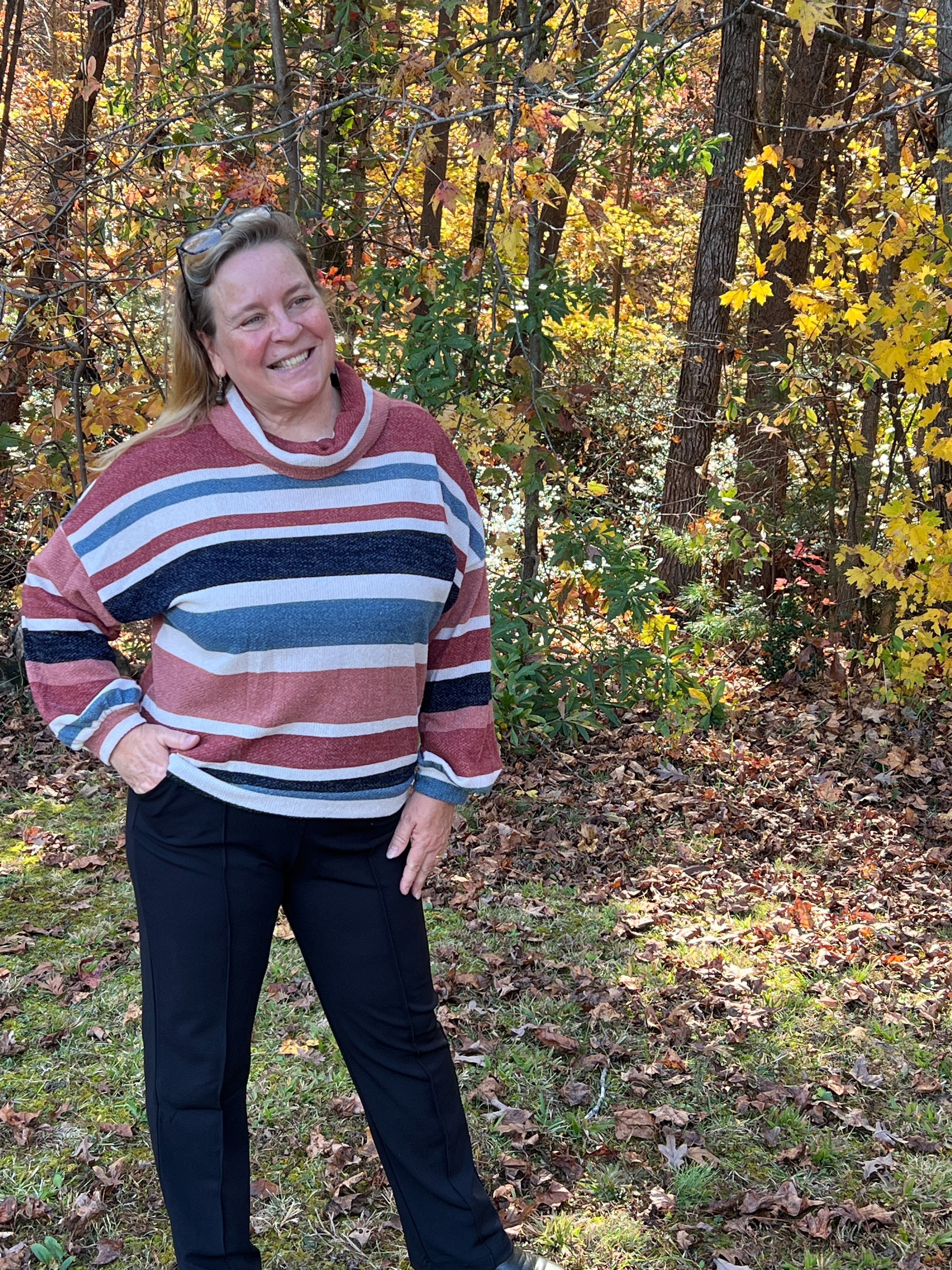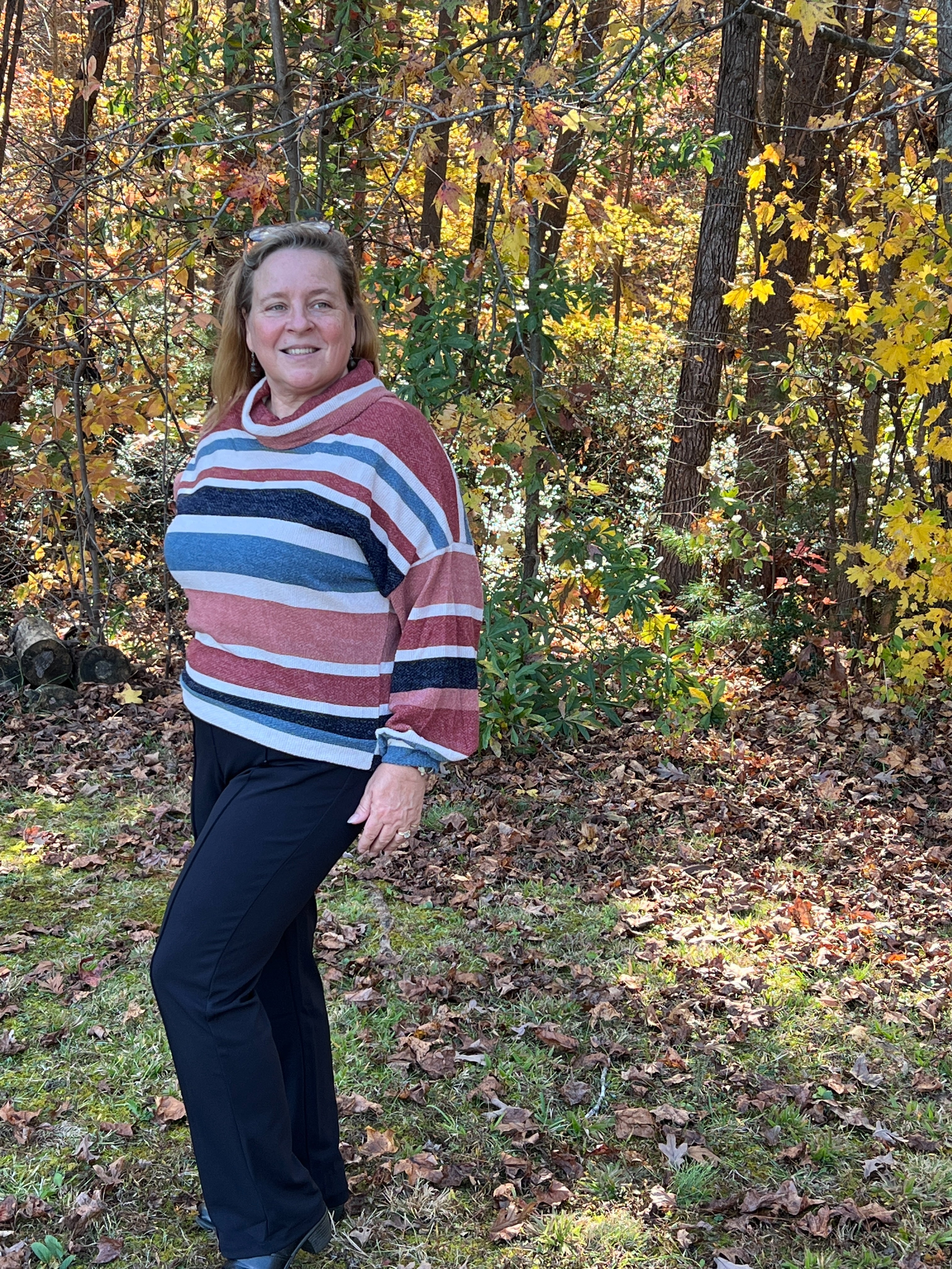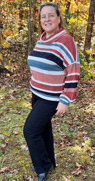 This lightweight knit cowl neck sweater top fits slightly larger than true to size. It features teal, burgundy, rust, and neutral tone stripes, slouch shoulders and slight balloon style sleeves that end in a stretchy cuff. This sweater is banded at the hemline and falls at the hips. It would look great with jeans or a skirt for work or church.