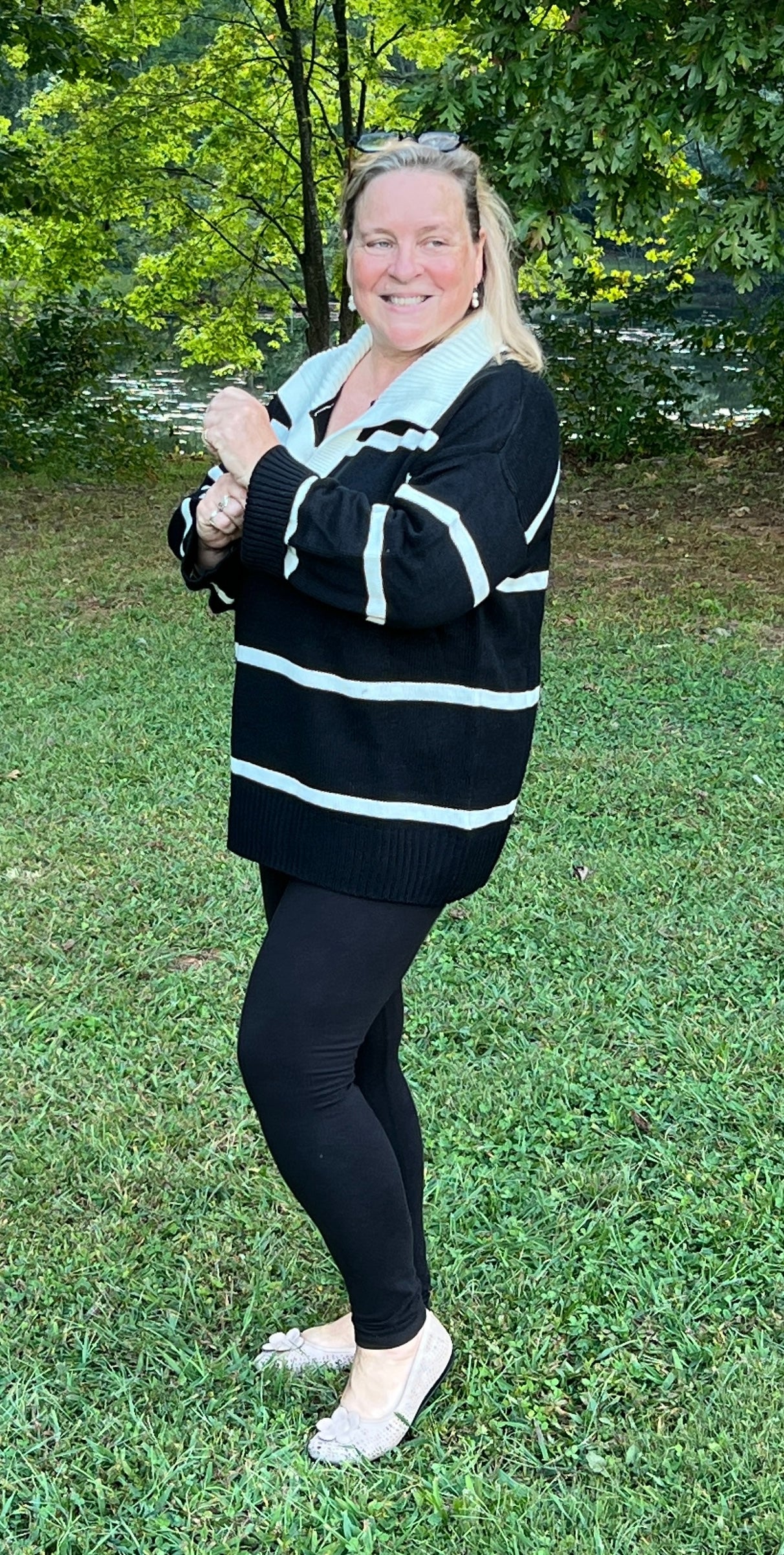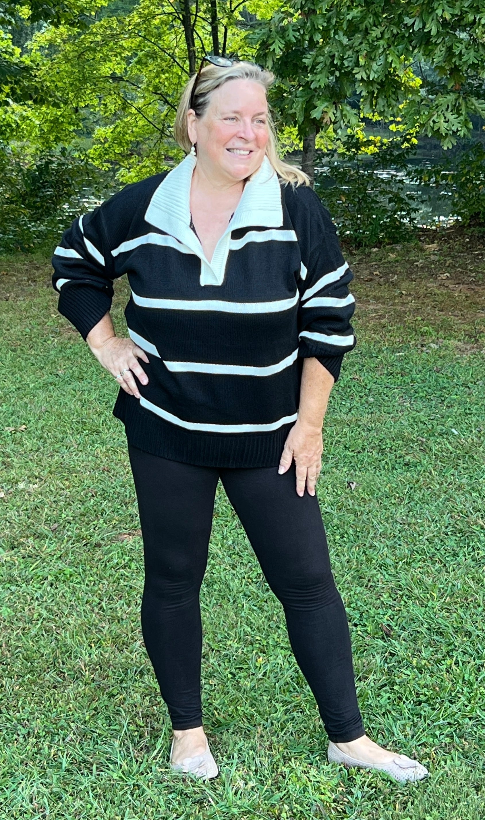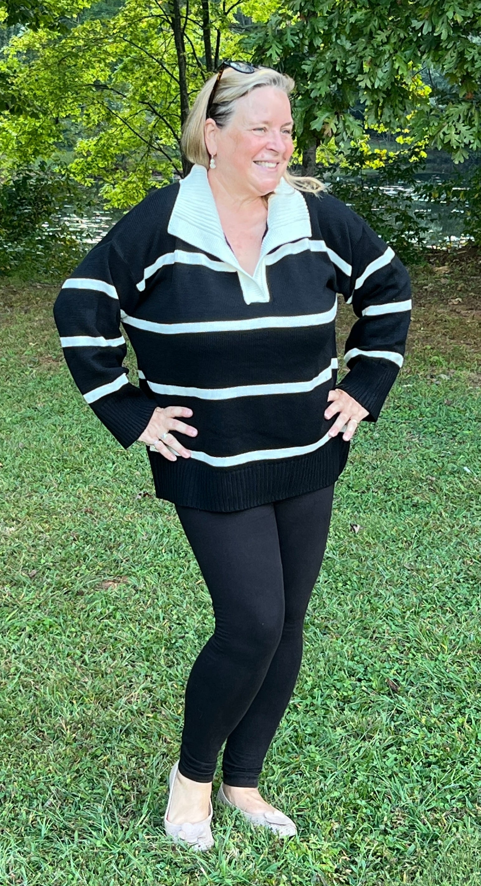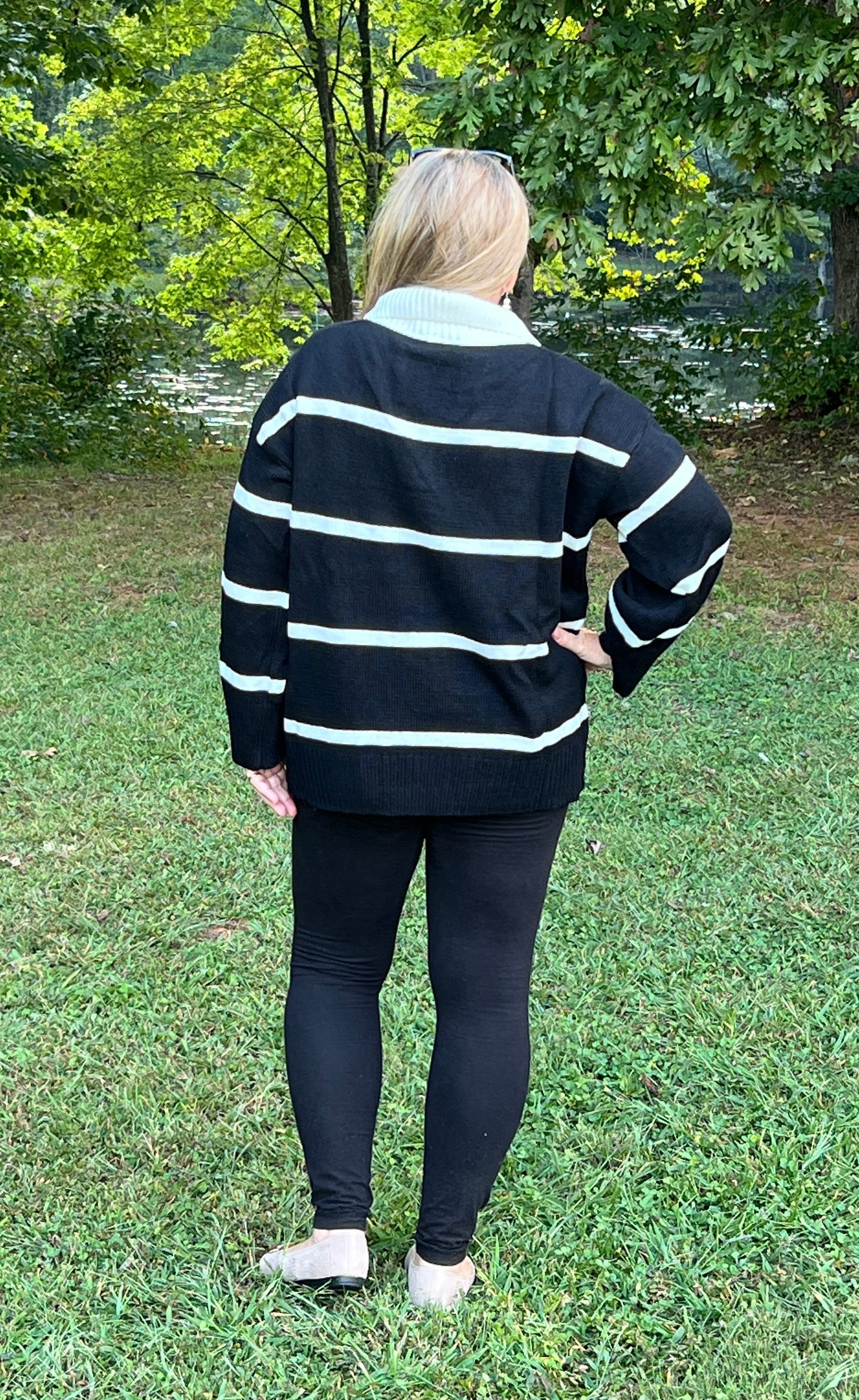 French-Inspired Black and Cream Stripe Sweater – Oversized w/ Notched Collar