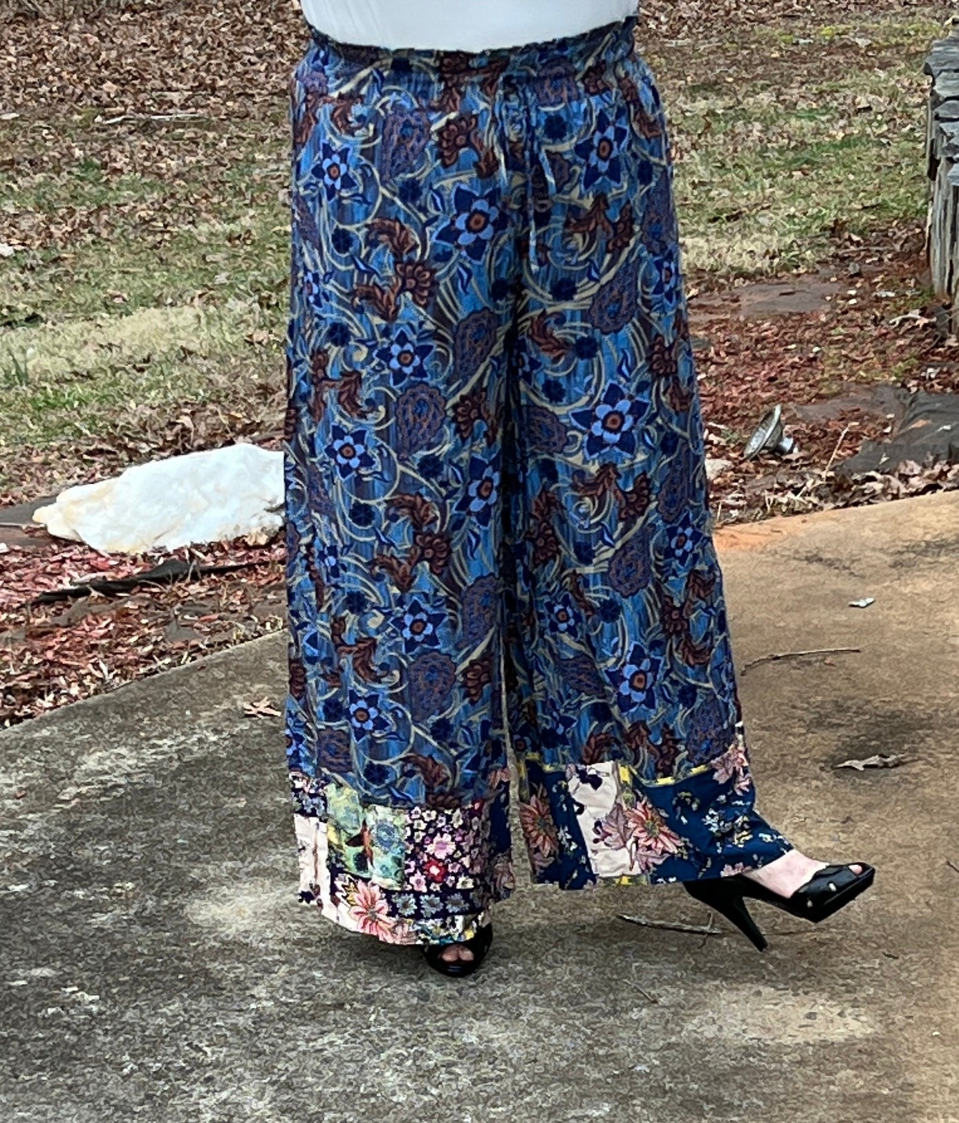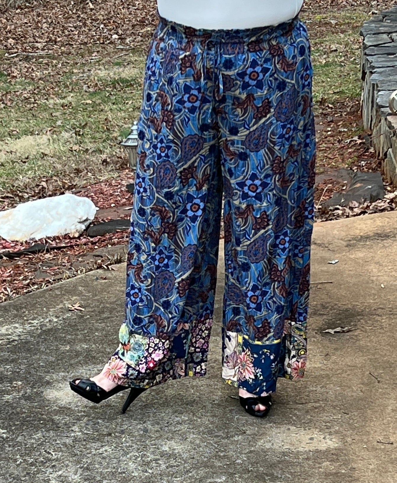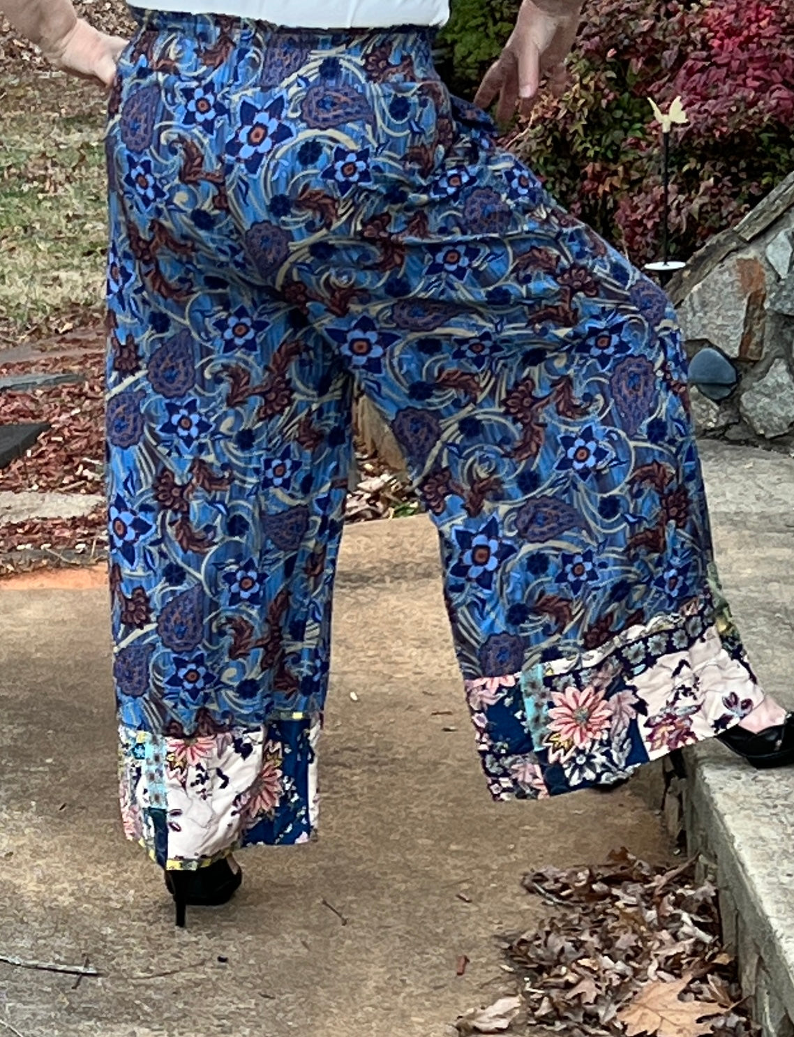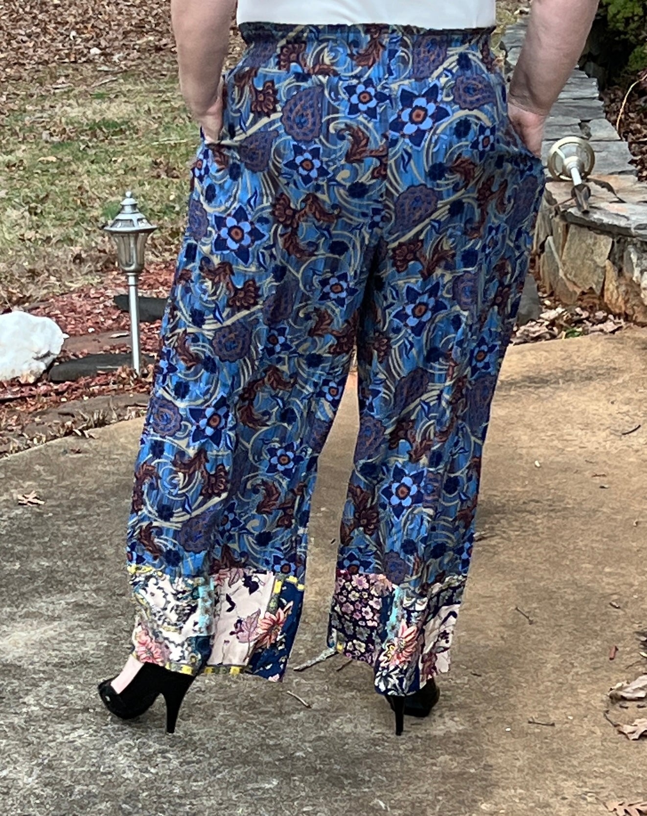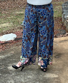 Designed for the woman who loves stylish comfort. These pants fit true to size and feature a wide-leg silhouette, a wide, elasticized easy to pull on waistband, pockets, and a breezy silky fabric with layered floral patterns. These pants pair easily with a simple blouse or lightweight sweater. ***They are longer so someone my height of 5’3” would want heels to wear with them!***