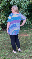 This soft and comfortable short sleeve tie dye tee falls mid thigh (tunic) length. Each of these tops has a different color pattern but features lots of shades of blue, purple and olive. The round neck has a stitched "v" for interest in the front. **Only available in XL.