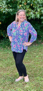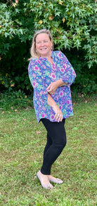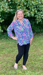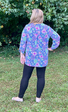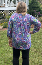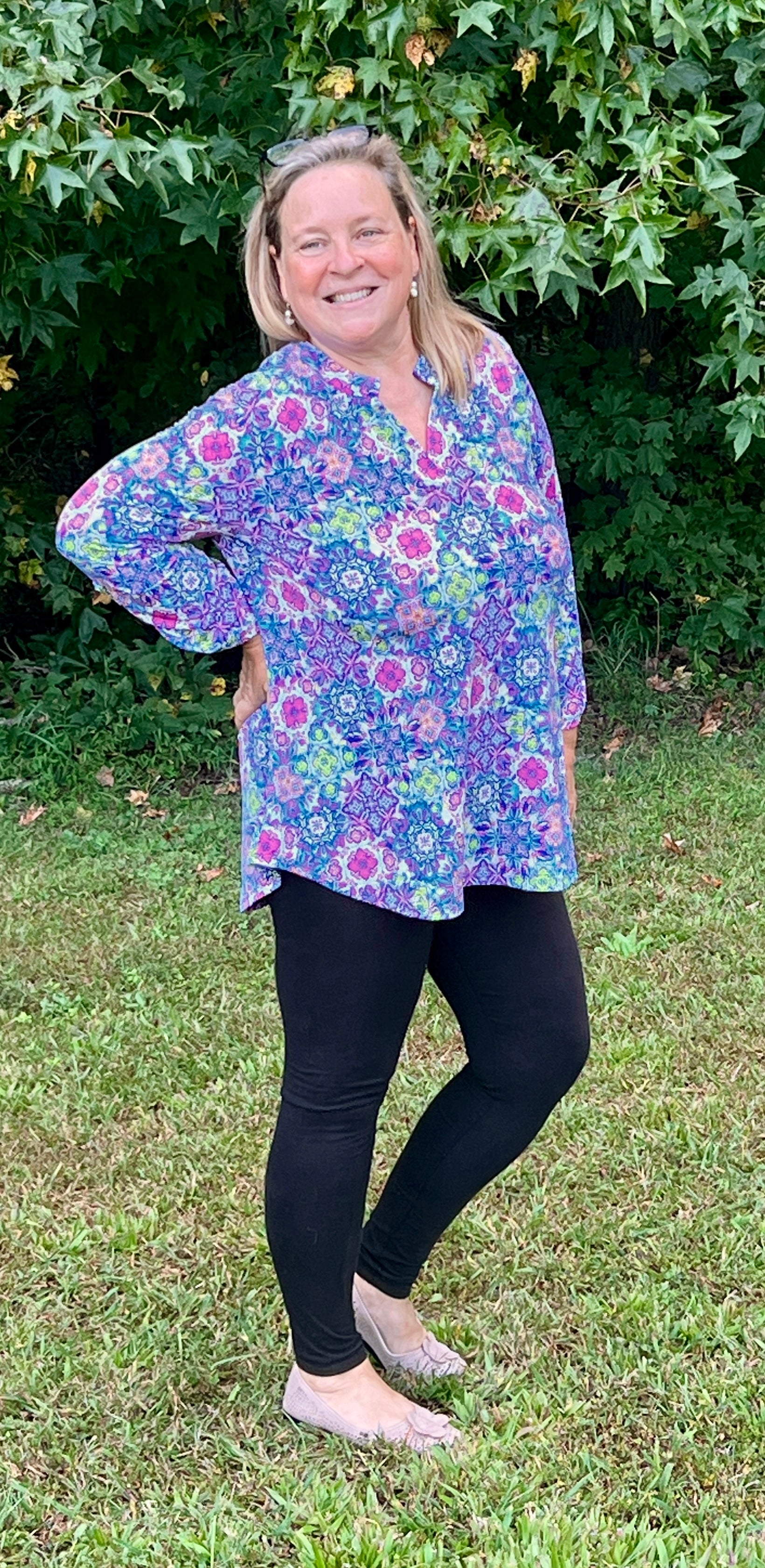 This vibrant bohemian-style blouse is made from a cool feeling, stretchy fabric that moves with you while keeping its shape. The bright multicolor Boho print has lots of blue, pink, lavender, white, and yellow. It has 3/4 length rolled sleeves secured by a button at the elbow, a flattering split neckline, and rounded hemline that falls to the hip/upper thigh for a relaxed, easy-to-style fit. **Last picture is closer to true color!