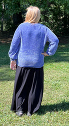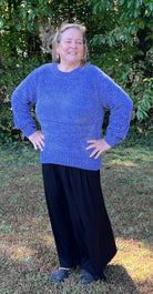 This luxuriously soft cornflower blue chenille sweater has a round neckline, full long sleeves, and a hem that sits just below the waist. It has light stretch at the ribbed collar, cuffs, and hem for a gentle, secure fit. ***I believe the “line” in the front is just the crease from when it was folded in the package***
