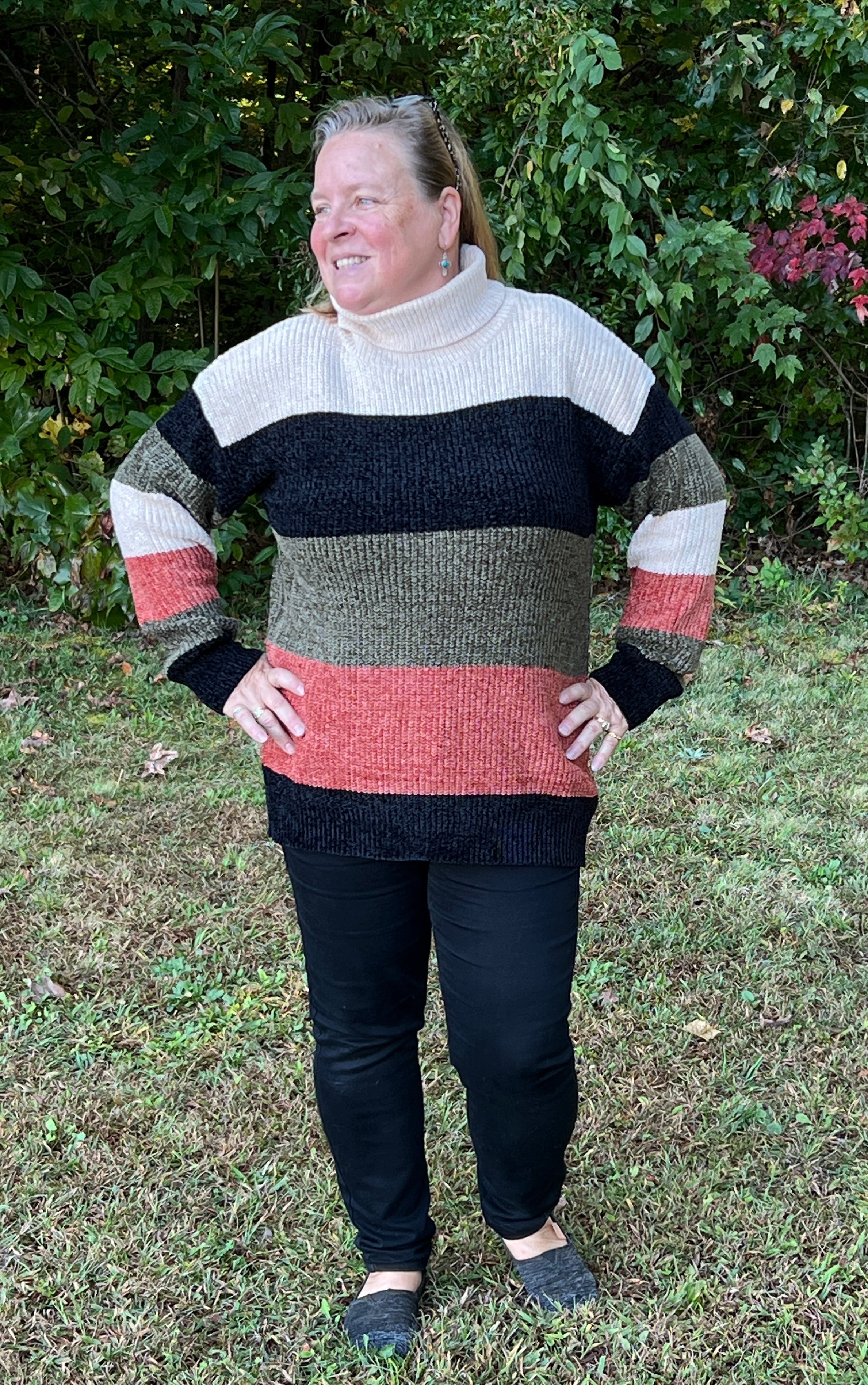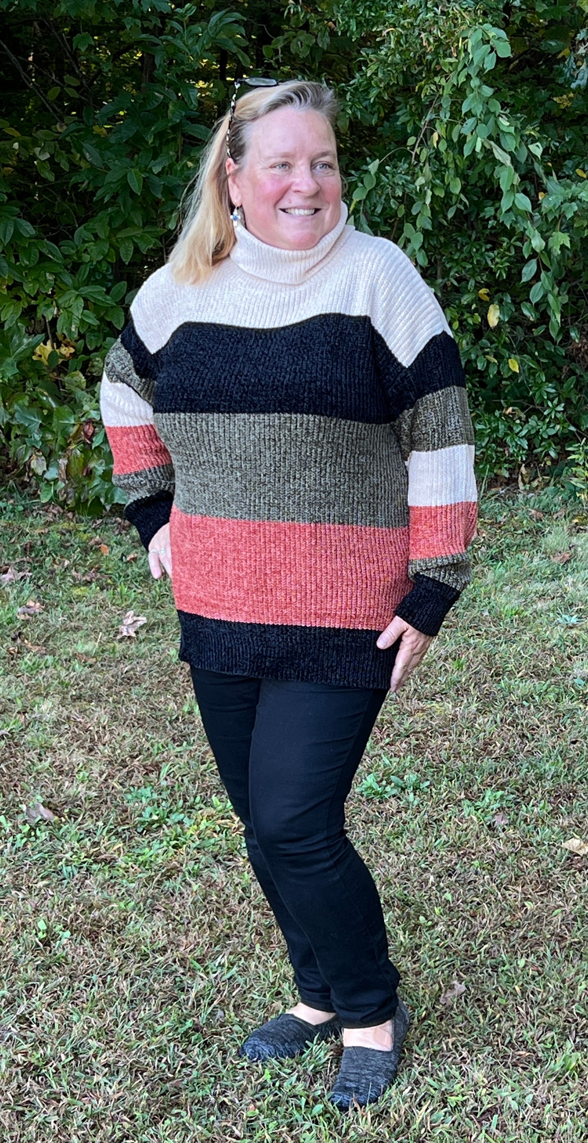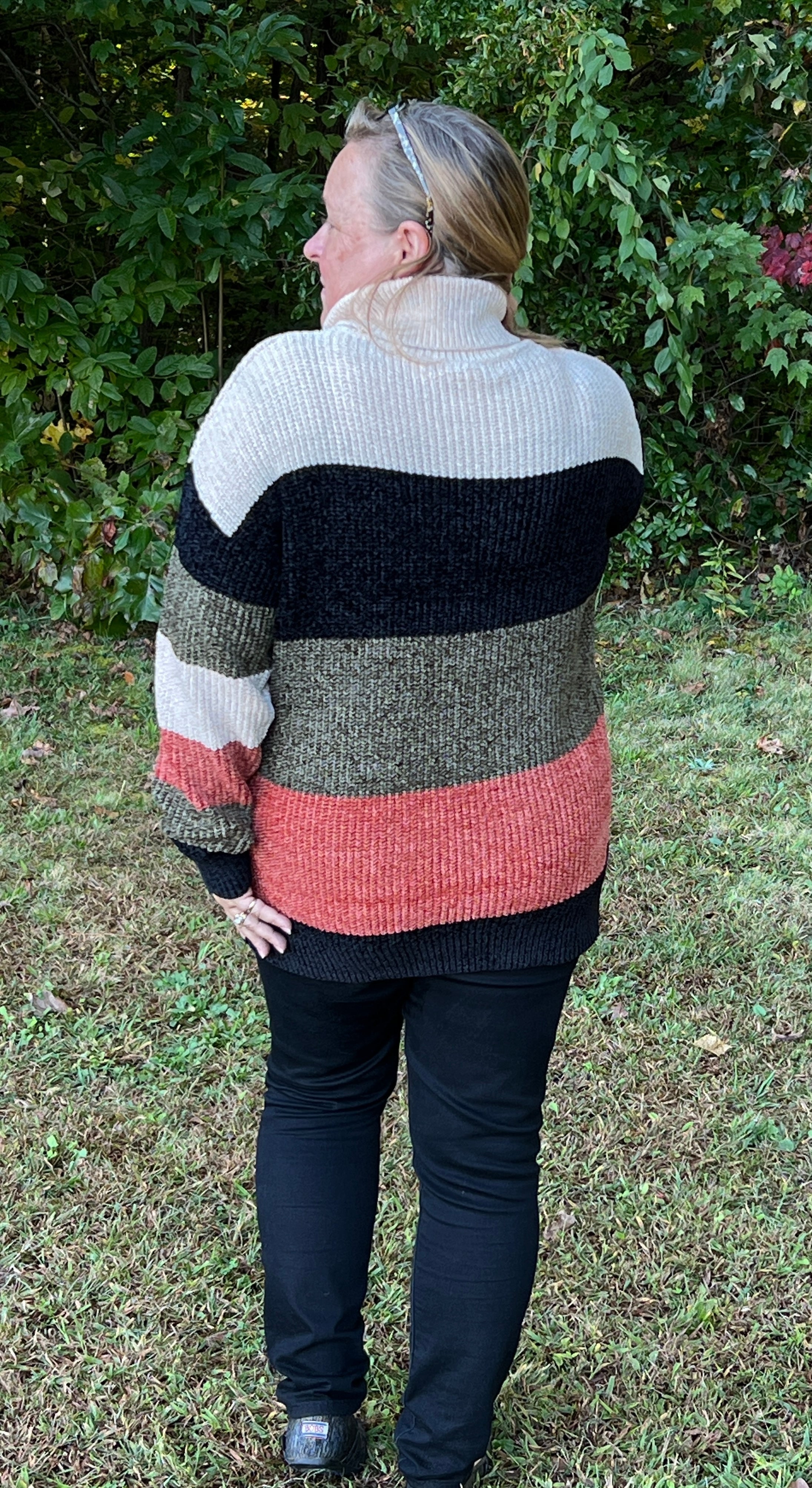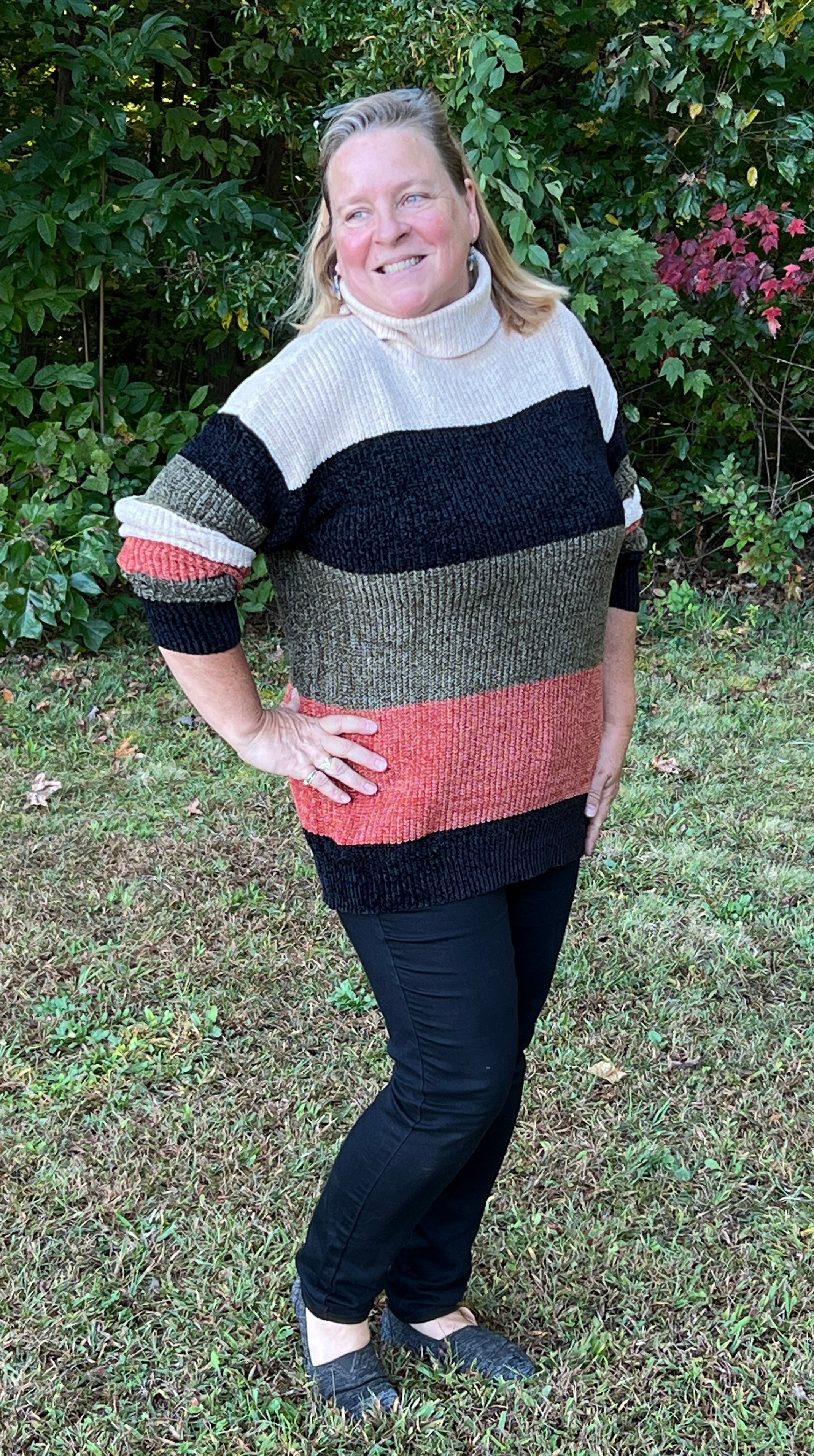 This beautiful, thick crochet style turtleneck sweater is incredibly soft and fits true to size with room for movement! **You could size down for a closer fit.** It has beautiful fall tones of Olive, Rust, Cream, and Black stripes on it and is perfect for colder weather! It will look great with jeans and is long enough for leggings too!