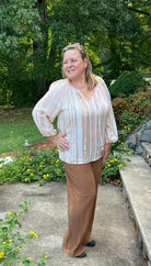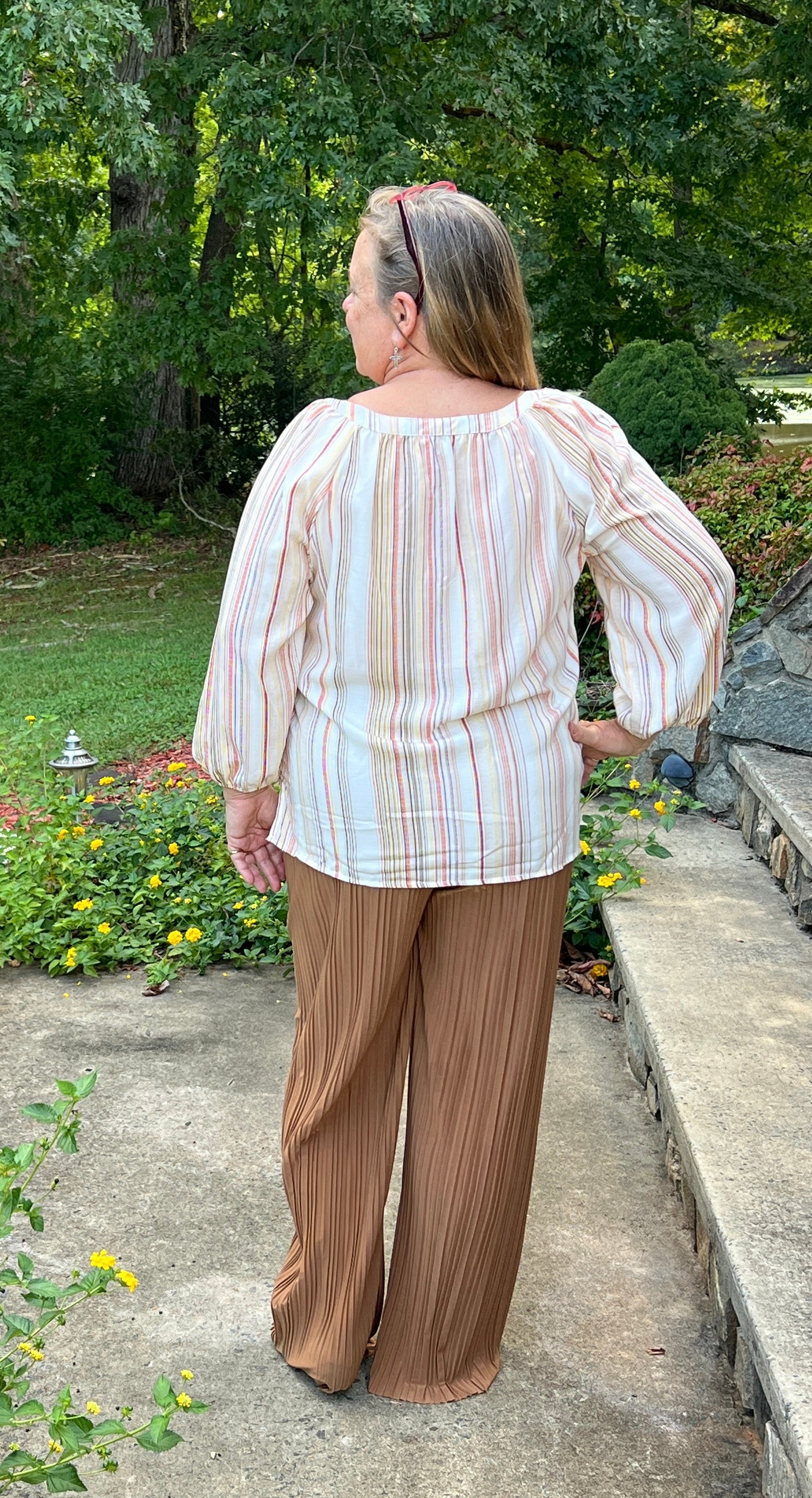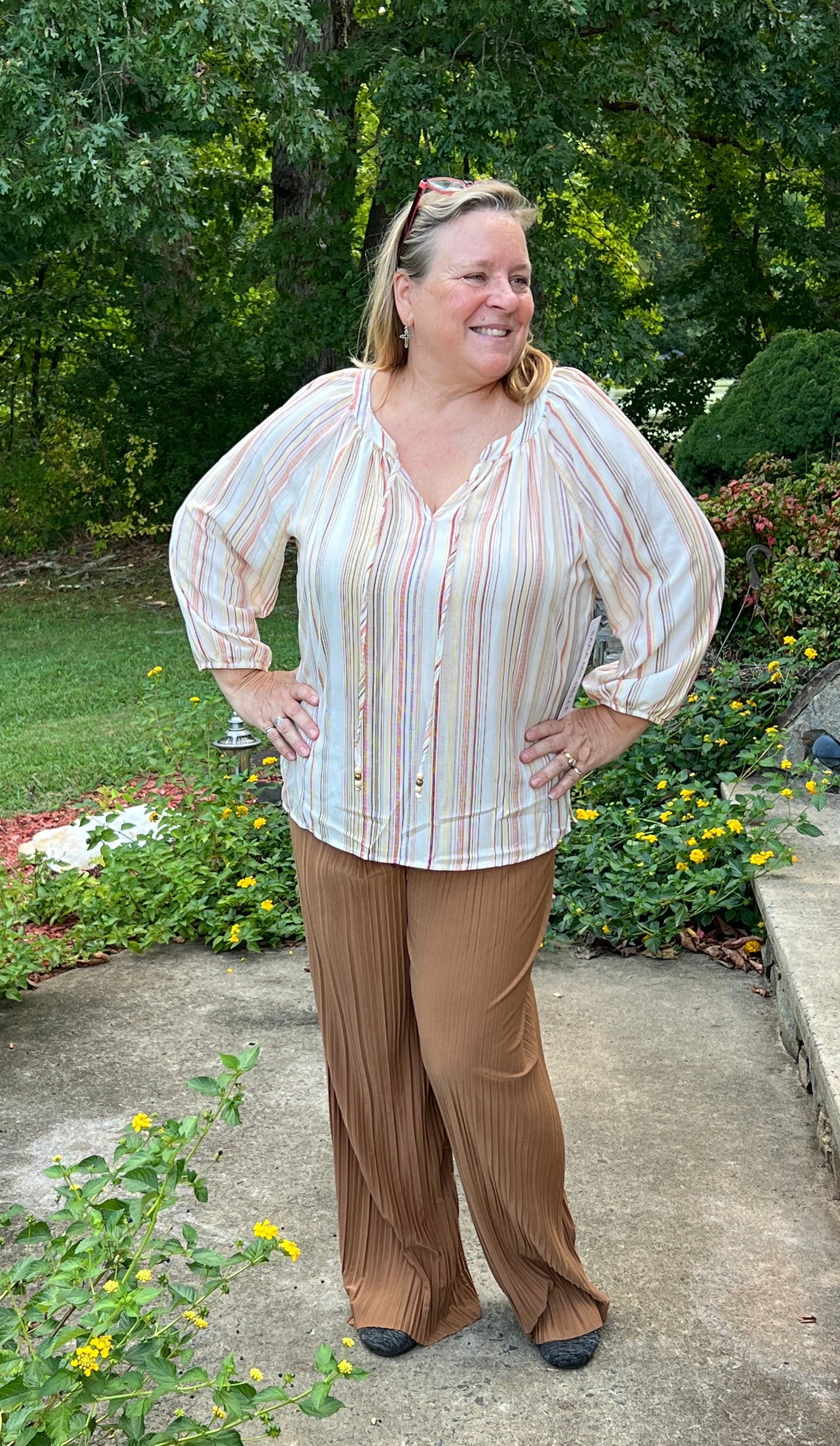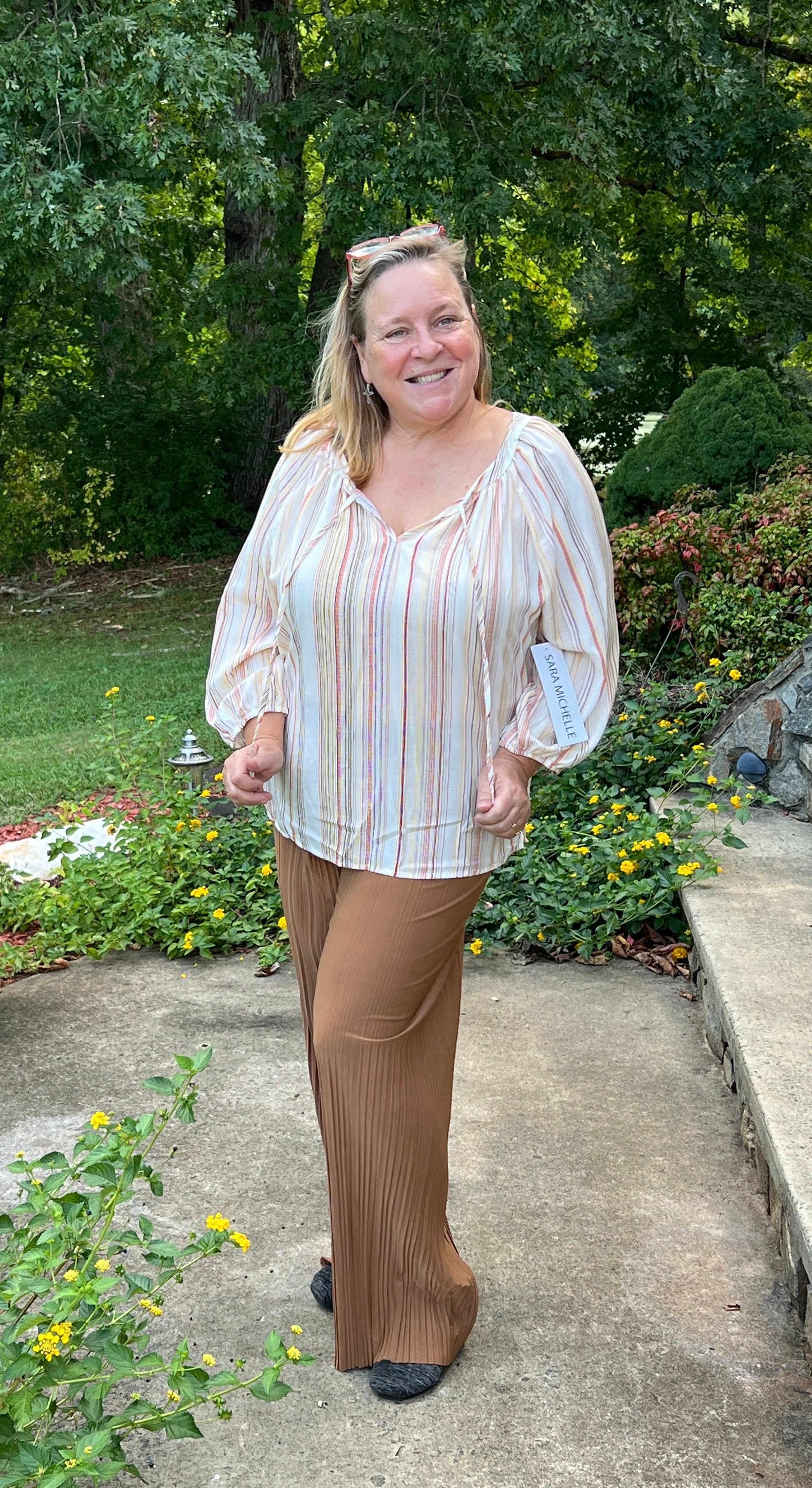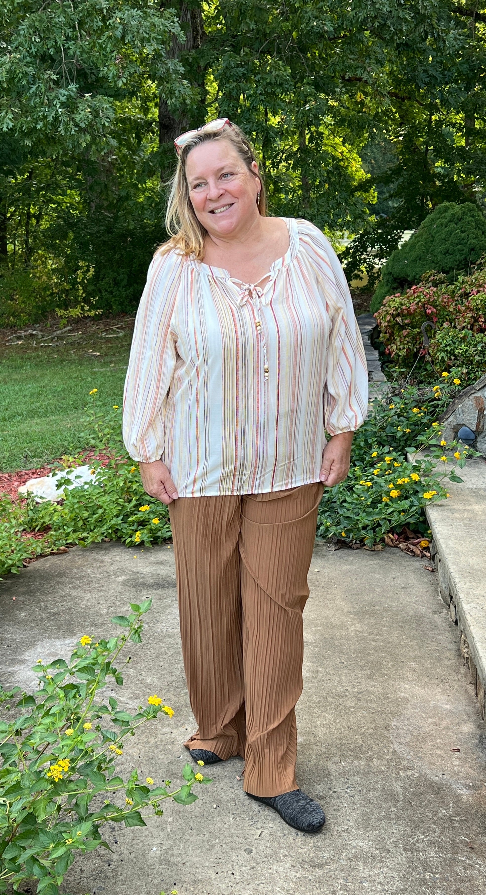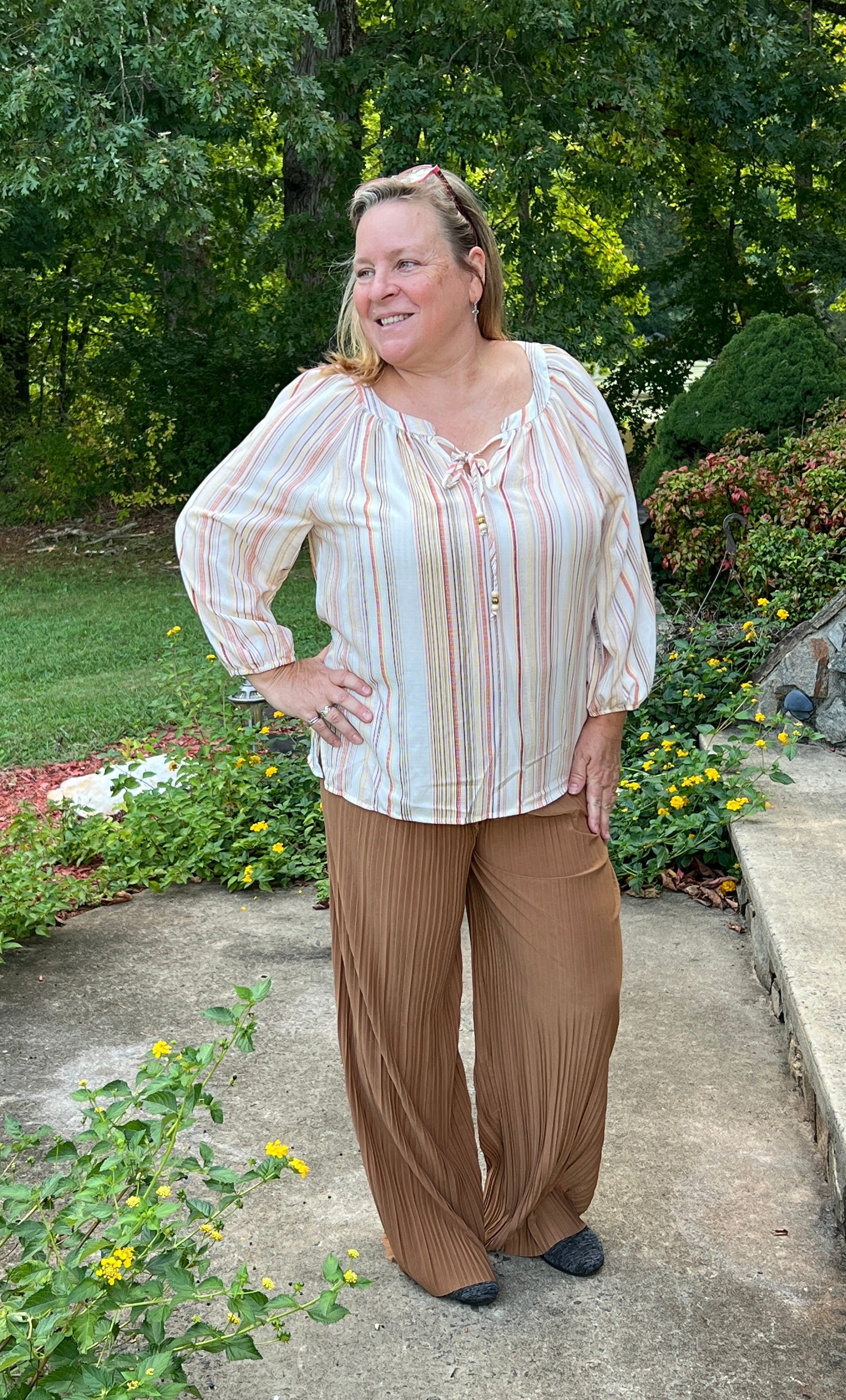 Soft and comfortable, this 3/4 length sleeve top fits true to size though tighter with larger bust. It has a thin stripe pattern of all the fall colors on an ivory base. The neckline is open but has a functioning tie with decorative beads at the ends. It has elasticized cuffs and side venting on a hemline that falls just below the hips.