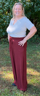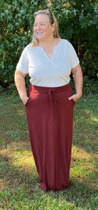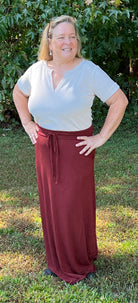 Buttery soft and a deep garnet red, this plus size Maxi skirt fits true to size and offers pockets and a stretchy waistband with drawstring to cinch the waist in if desired. Waist to hem on is 42".