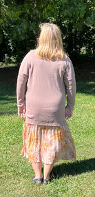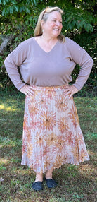 Mocha V-neck sweater in a silky rayon/nylon knit. Subtle ribbing at cuffs and hem with a relaxed hi-lo silhouette. Smooth, soft, and easy to wear whether over leggings or tucked into a skirt (as shown below with our floral mocha and gold skirt). ***Note the color difference in shade vs sunlight.***