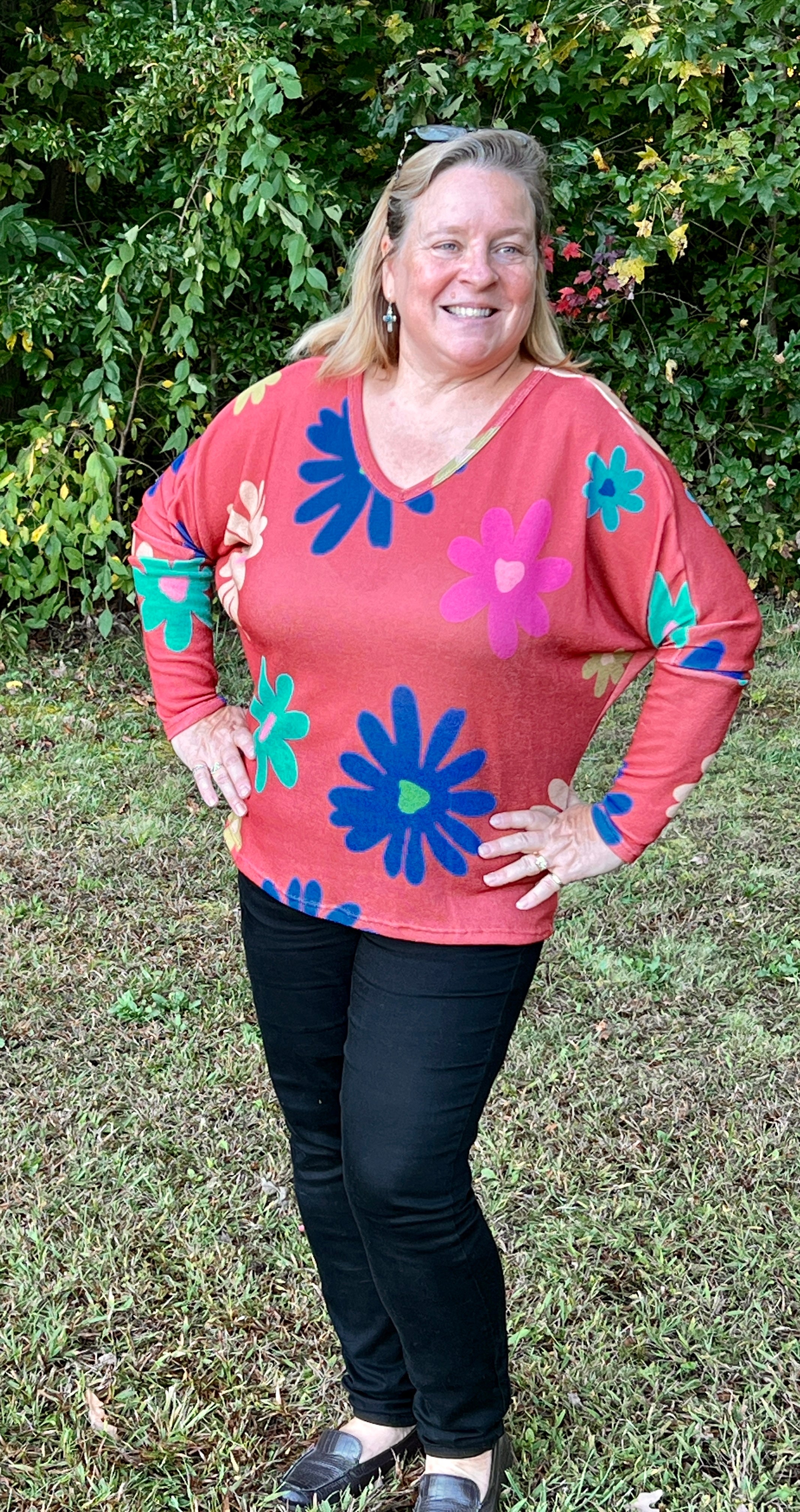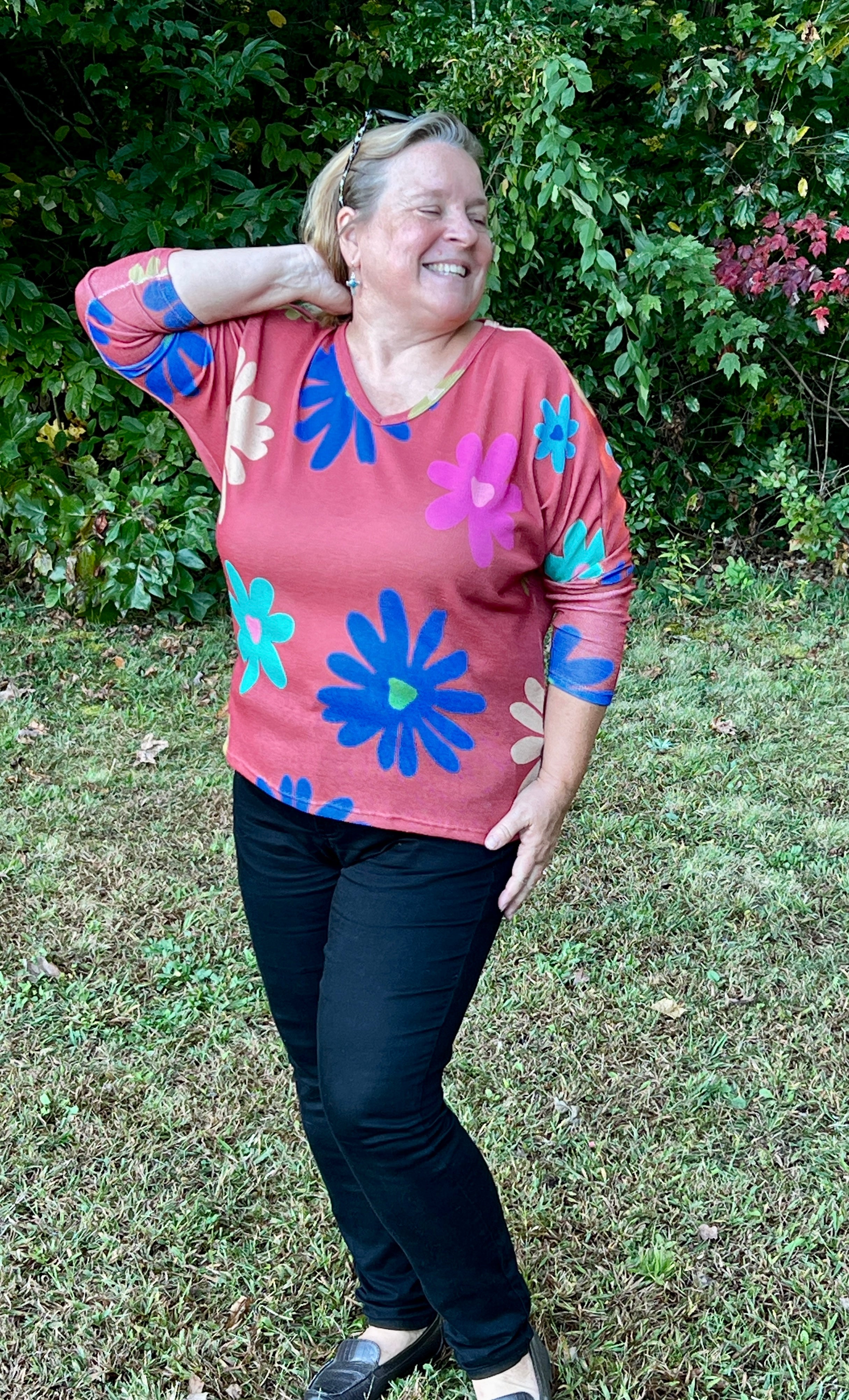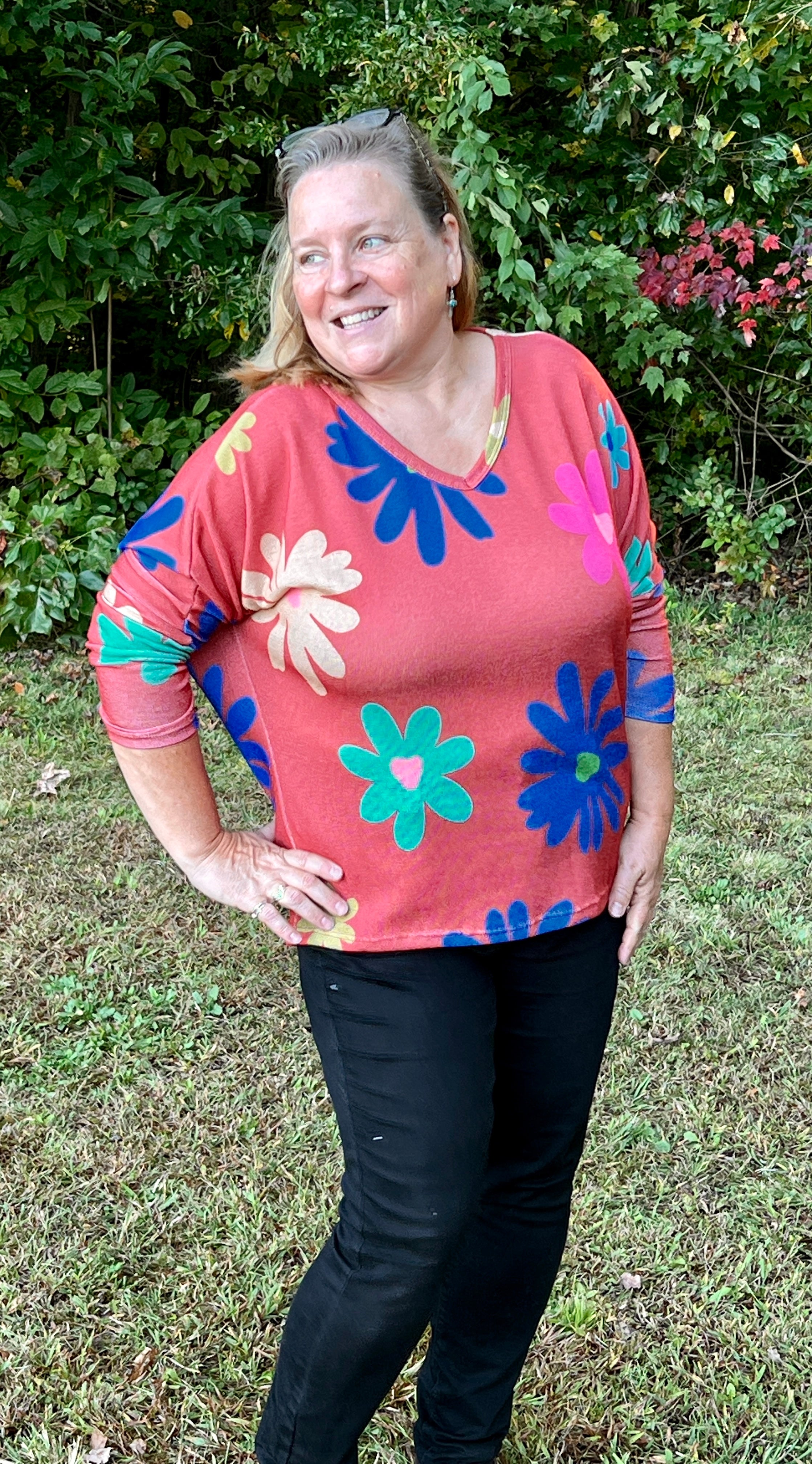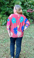 So cute and fun for spring! This very oversized lightweight knit sweater features bold colored large flowers printed on a rust color background. The sweater has a v-neckline, dolman sleeves, and a seam down the center of the back. If you're into retro styles, you'll love this top!