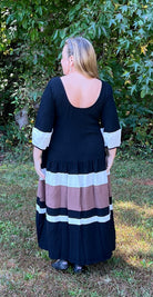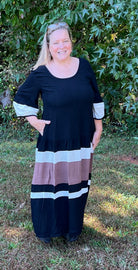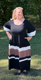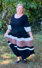 Crafted from a soft linen-rayon blend, this color-block dress exudes soft elegance. The black bodice meets a dropped waist, full, pocketed skirt striped in earthy tones of dark brown, natural, and white. The wide scoop neckline (lower in back than in front) and ¾ sleeves with a wide band of natural linen finish the look. **Note that this dress is heavier than average**