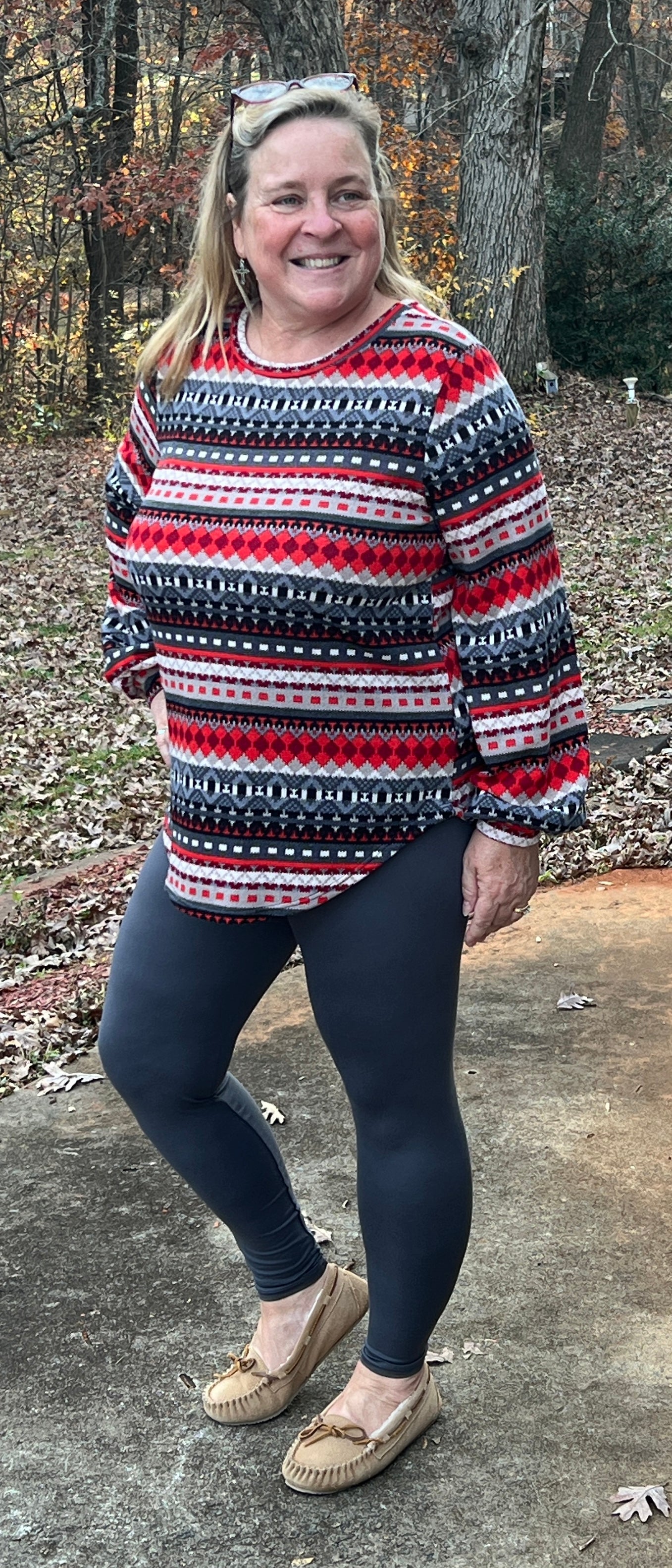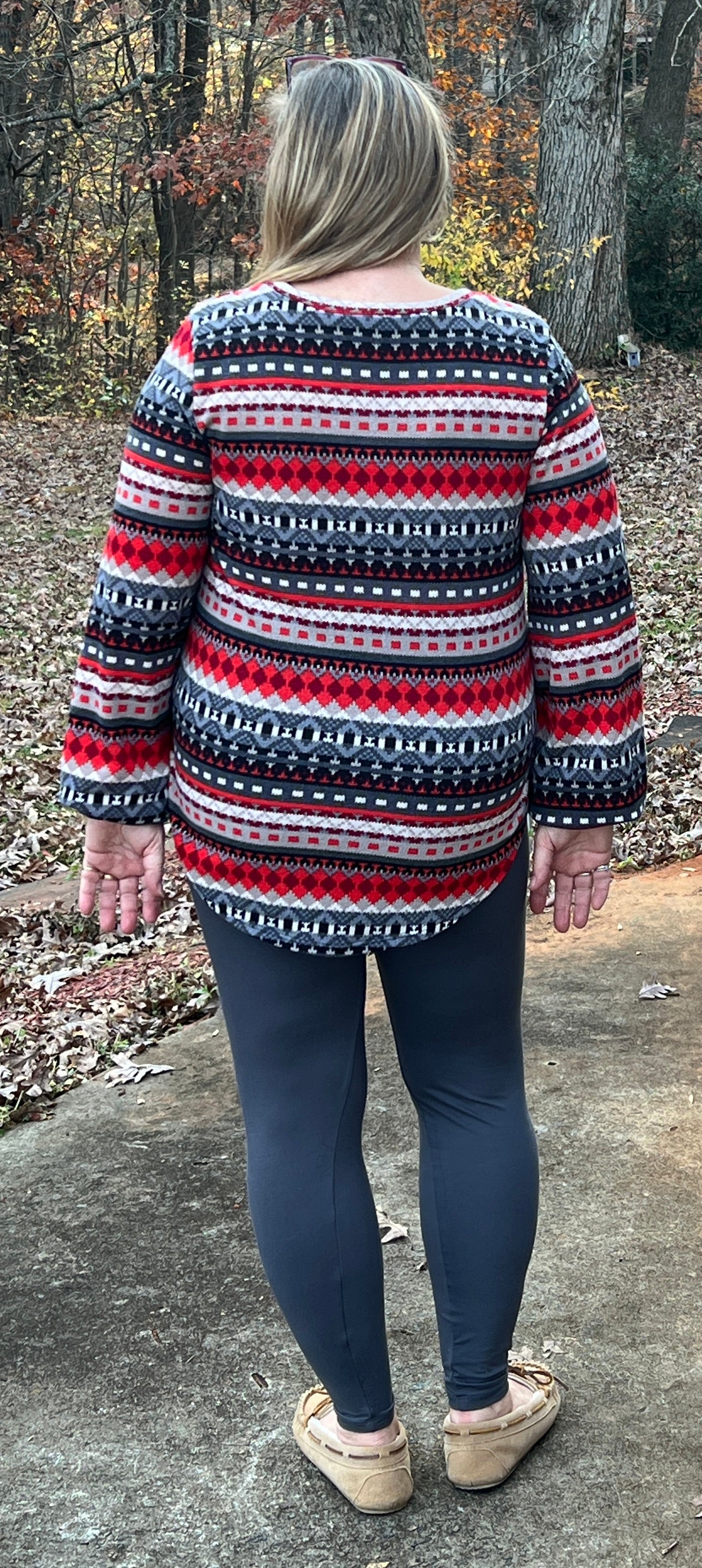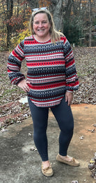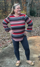 This red, black, gray, and cream lighter weight knit sweater features multi patterned horizontal Aztec print stripes, a round neckline, puffy long sleeves with cuff, and rounded hemline. It fits true to size and would be great for the holidays.