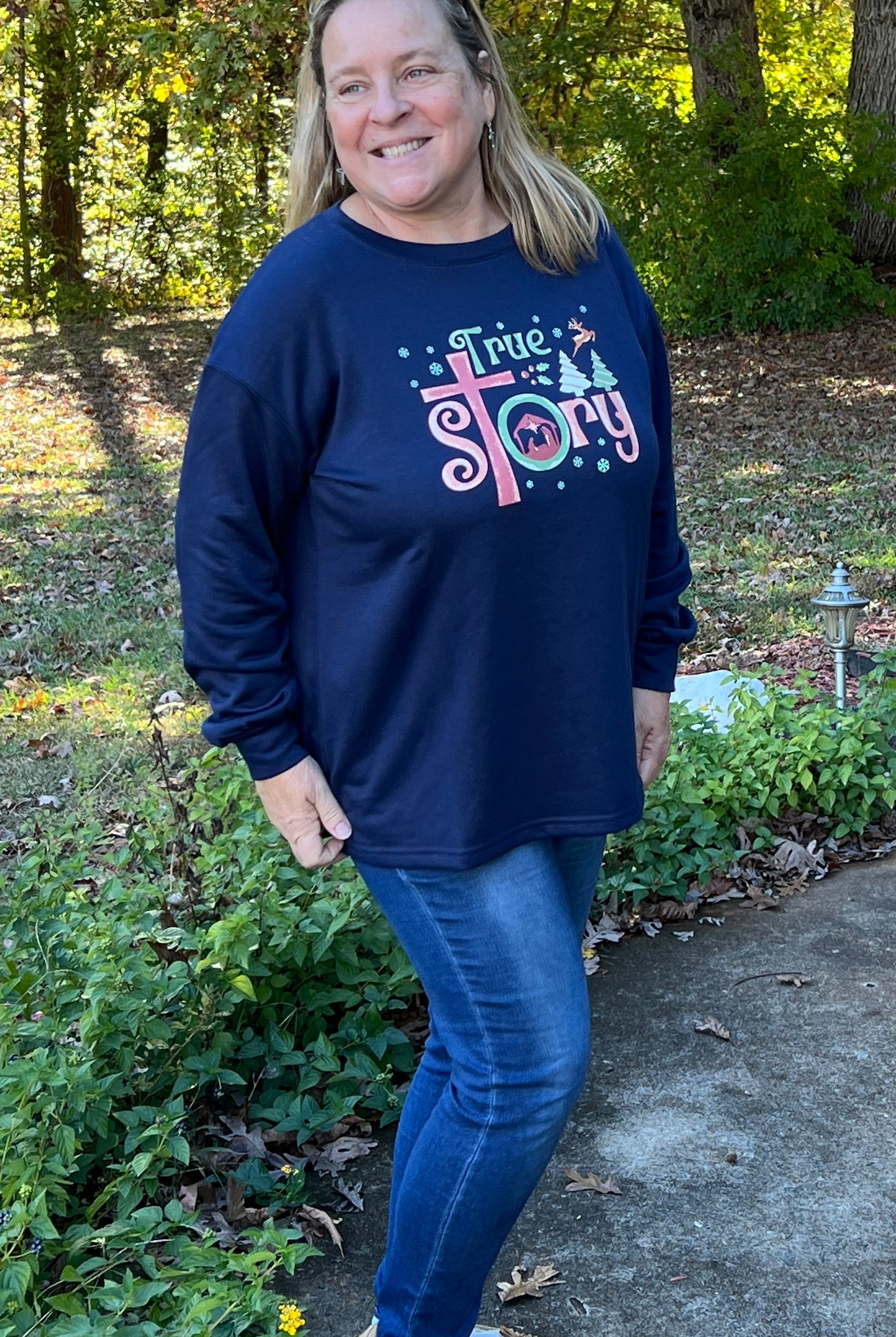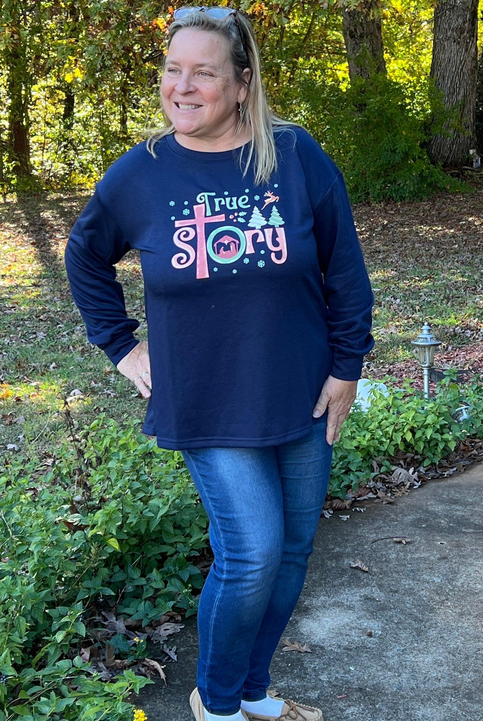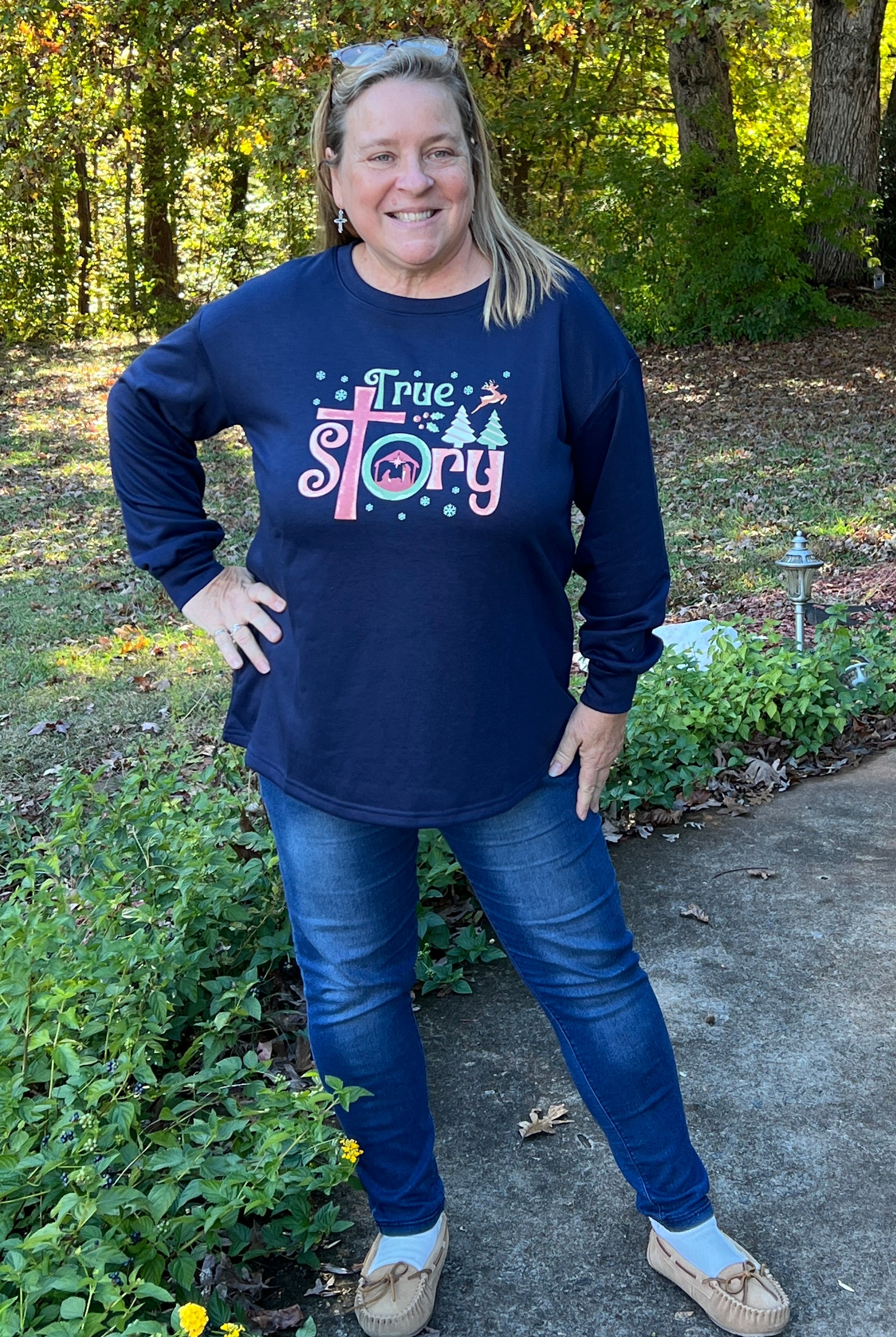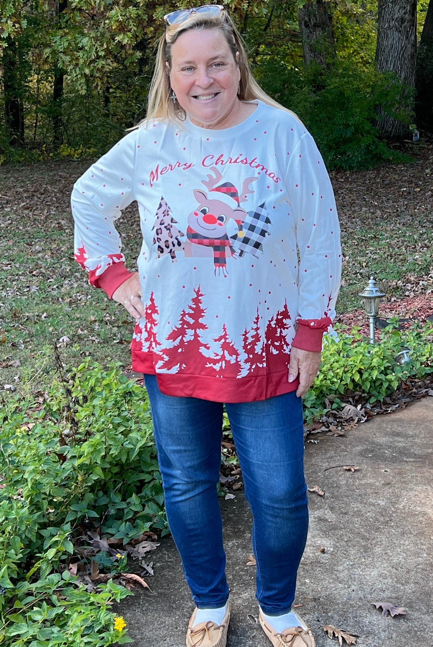 Super cute and fun Christmas sweatshirt features an adorable reindeer in the center with fir trees and polka dot patterns on the bodice and sleeves. This true to size sweatshirt has a soft, slick feel exterior and french terry knit interior. It has ribbing at the cuff and neck and is long enough to wear with leggings or skinny jeans. Available in Small to 3X.