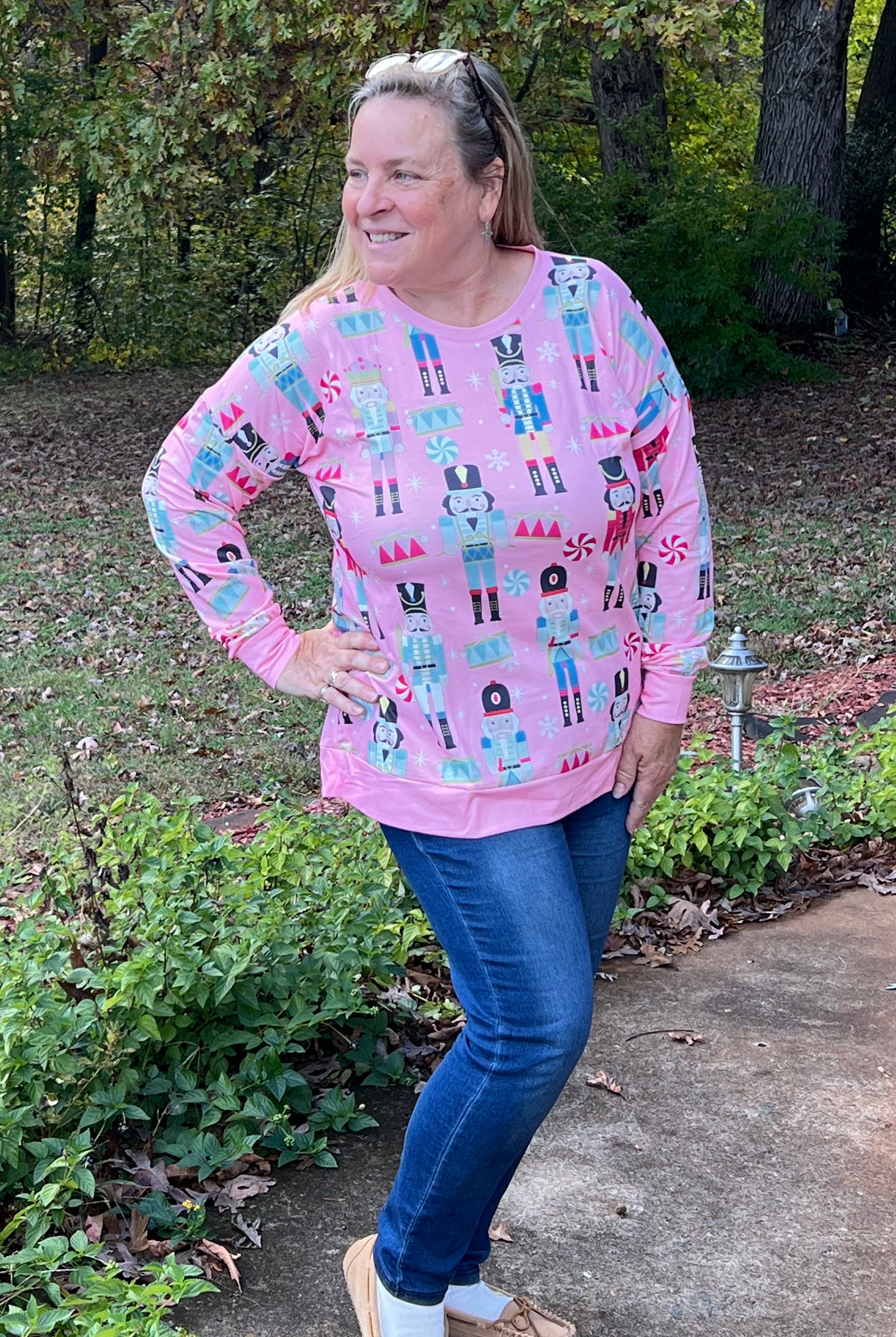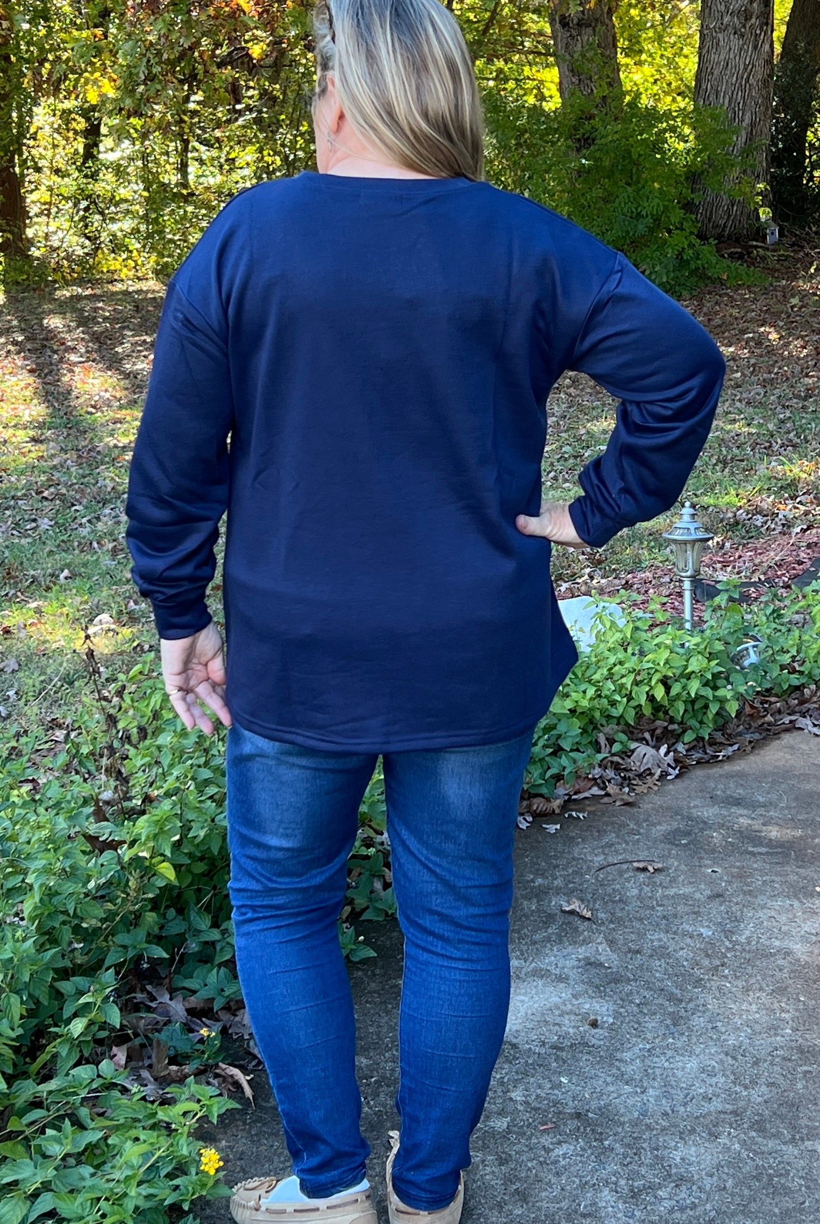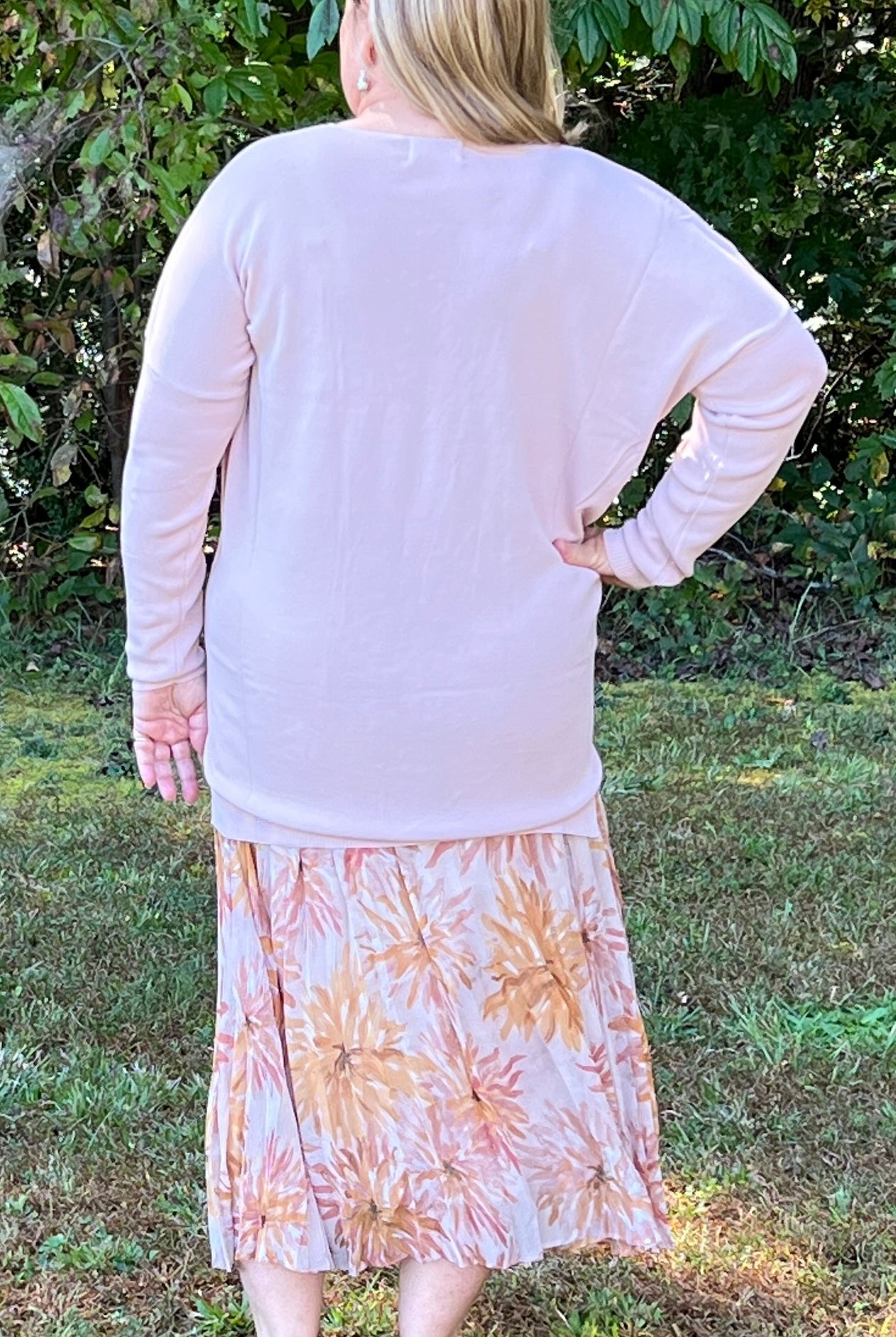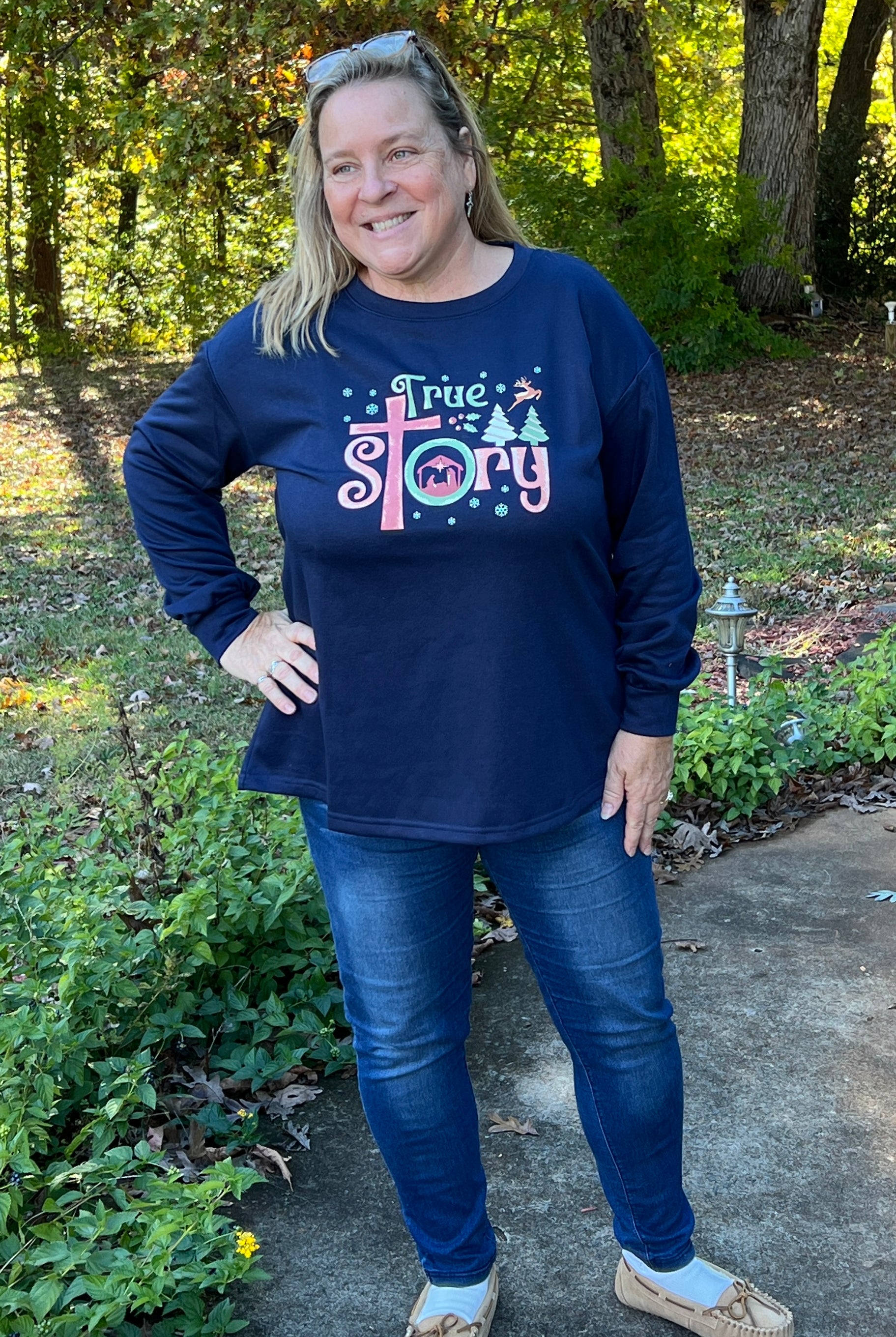 Super cute and fun Christmas sweatshirt features an adorable reindeer in the center with fir trees and polka dot patterns on the bodice and sleeves. This true to size sweatshirt has a soft, slick feel exterior and french terry knit interior. It has ribbing at the cuff and neck and is long enough to wear with leggings or skinny jeans. Available in Small to 3X.