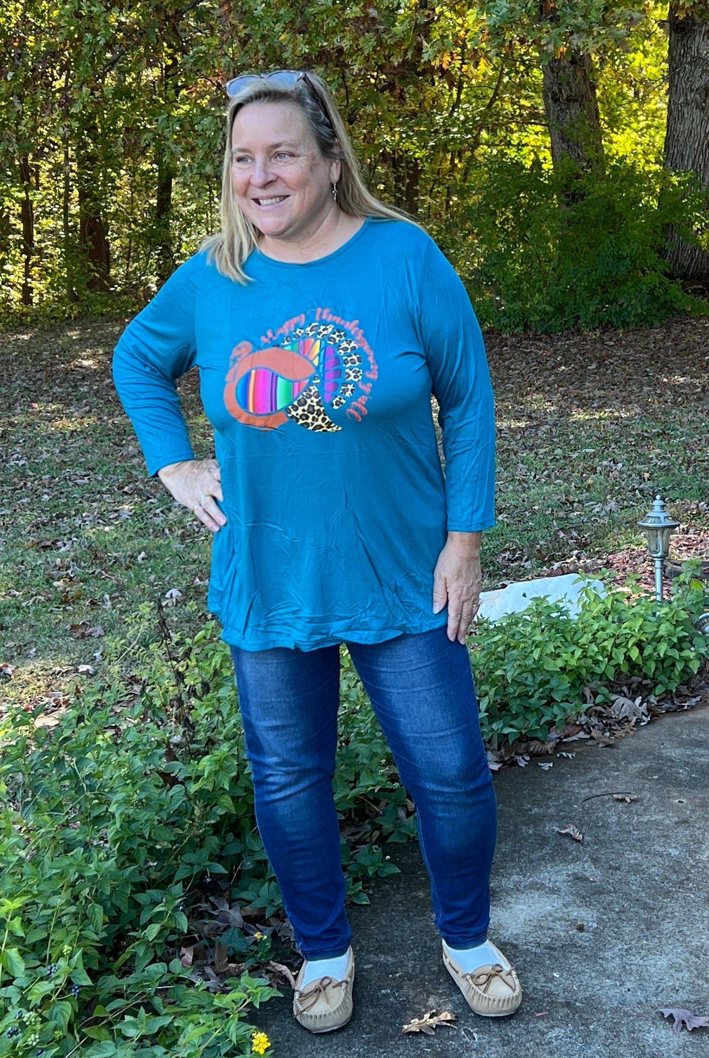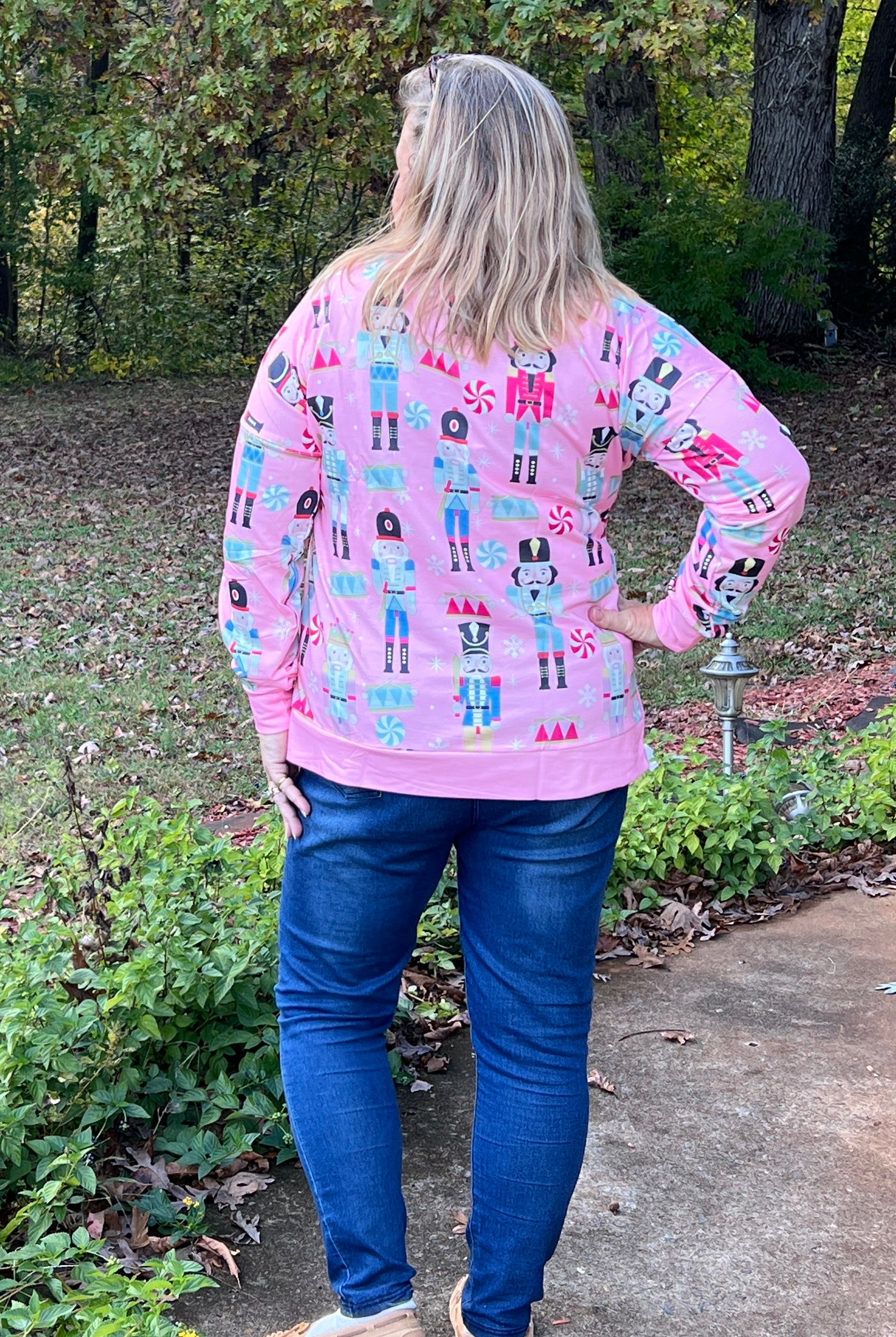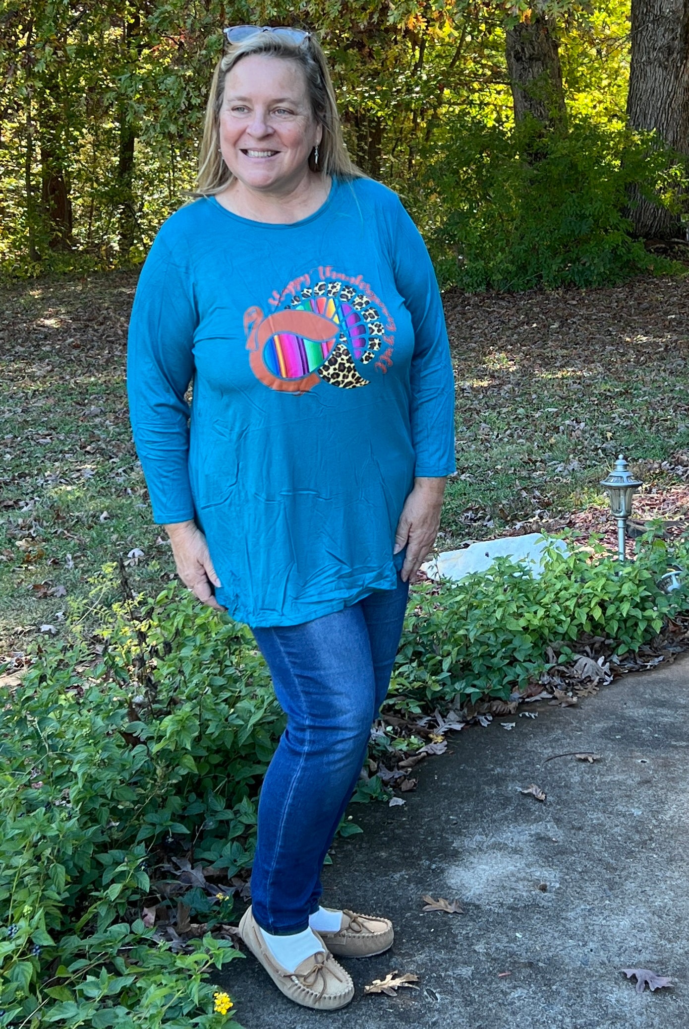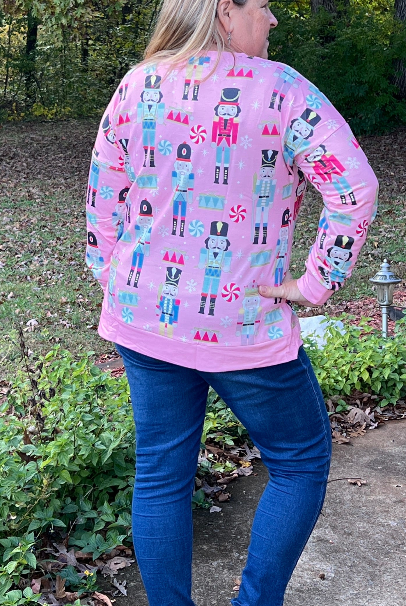 Super cute and fun Christmas sweatshirt features an adorable reindeer in the center with fir trees and polka dot patterns on the bodice and sleeves. This true to size sweatshirt has a soft, slick feel exterior and french terry knit interior. It has ribbing at the cuff and neck and is long enough to wear with leggings or skinny jeans. Available in Small to 3X.