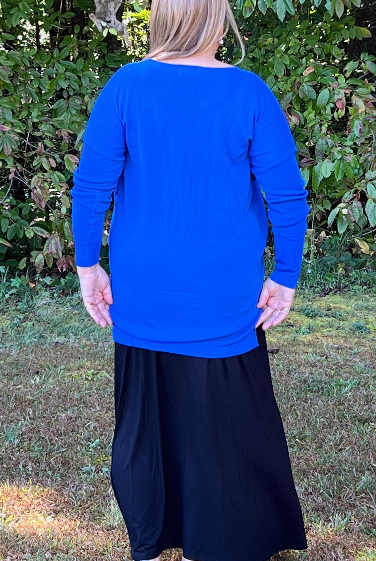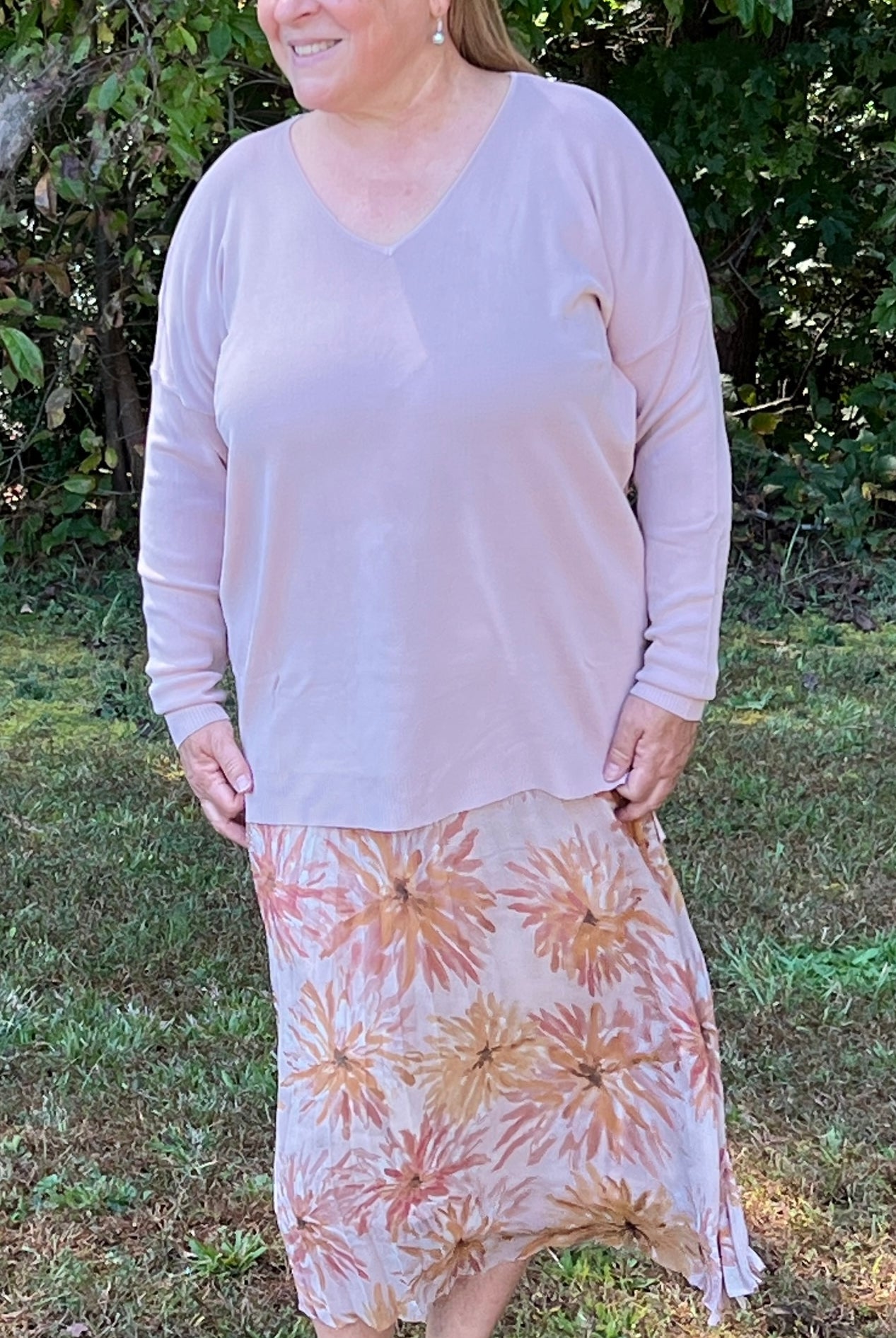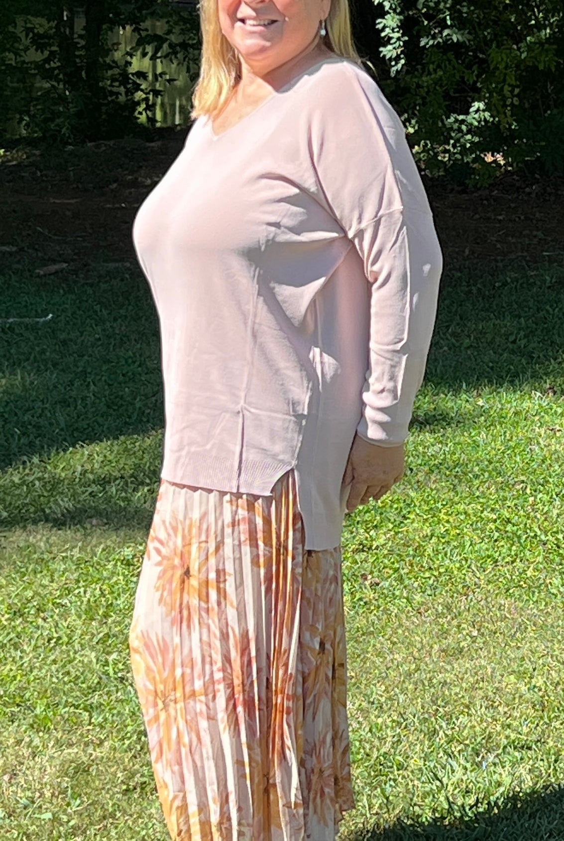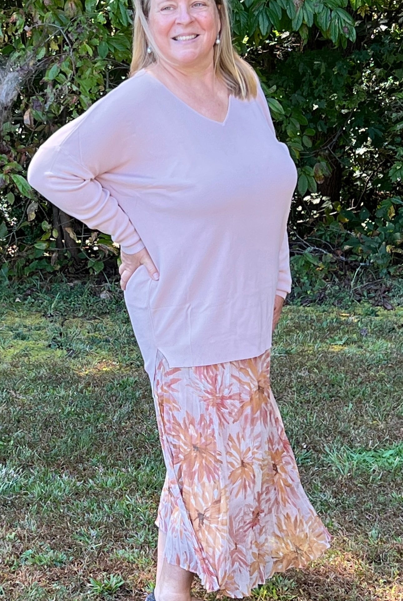 Super cute and fun Christmas sweatshirt features an adorable reindeer in the center with fir trees and polka dot patterns on the bodice and sleeves. This true to size sweatshirt has a soft, slick feel exterior and french terry knit interior. It has ribbing at the cuff and neck and is long enough to wear with leggings or skinny jeans. Available in Small to 3X.